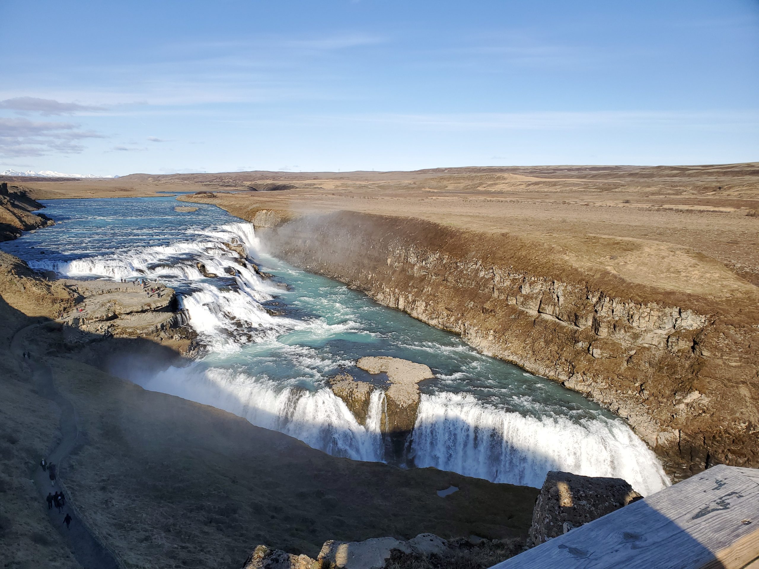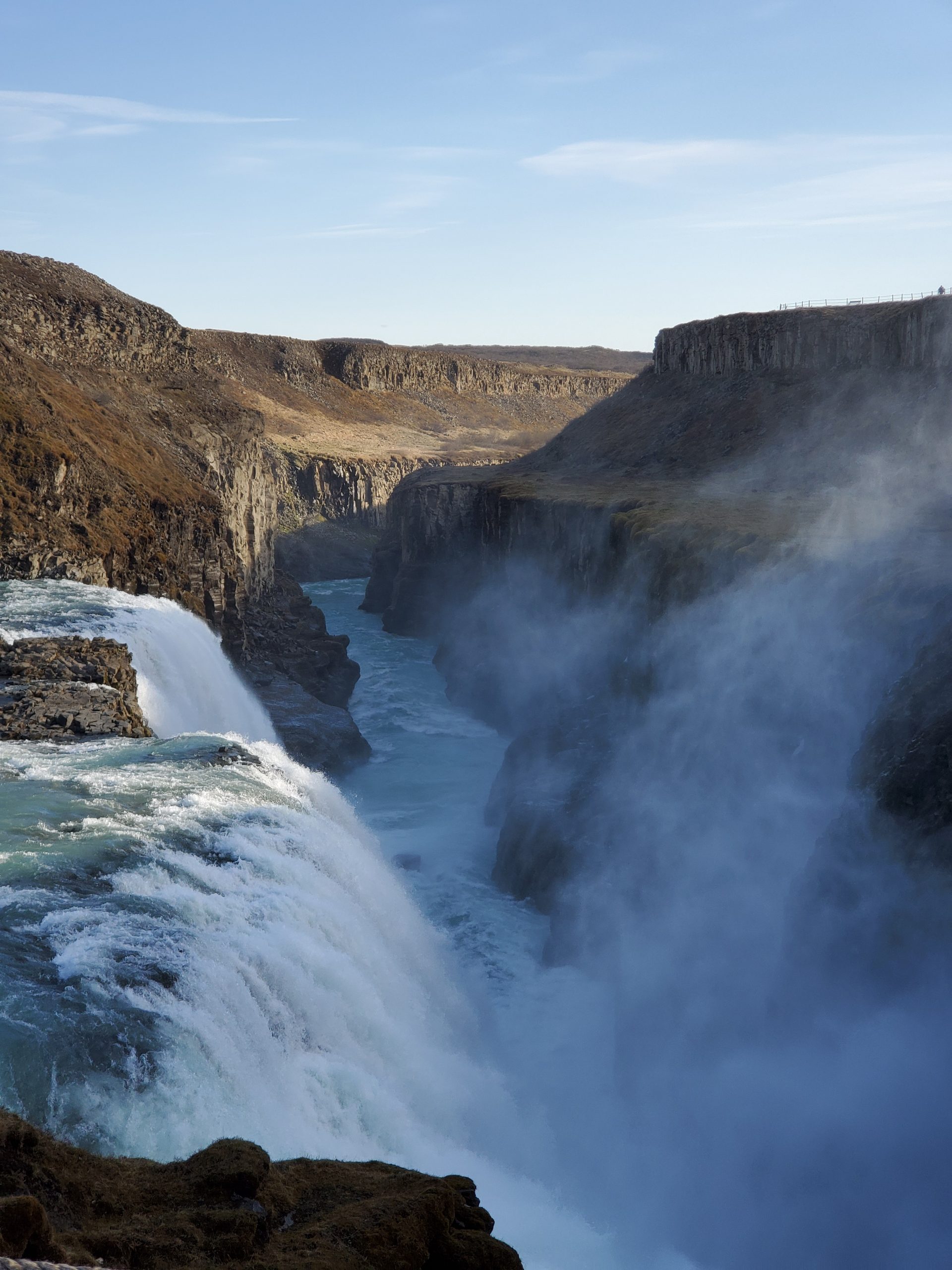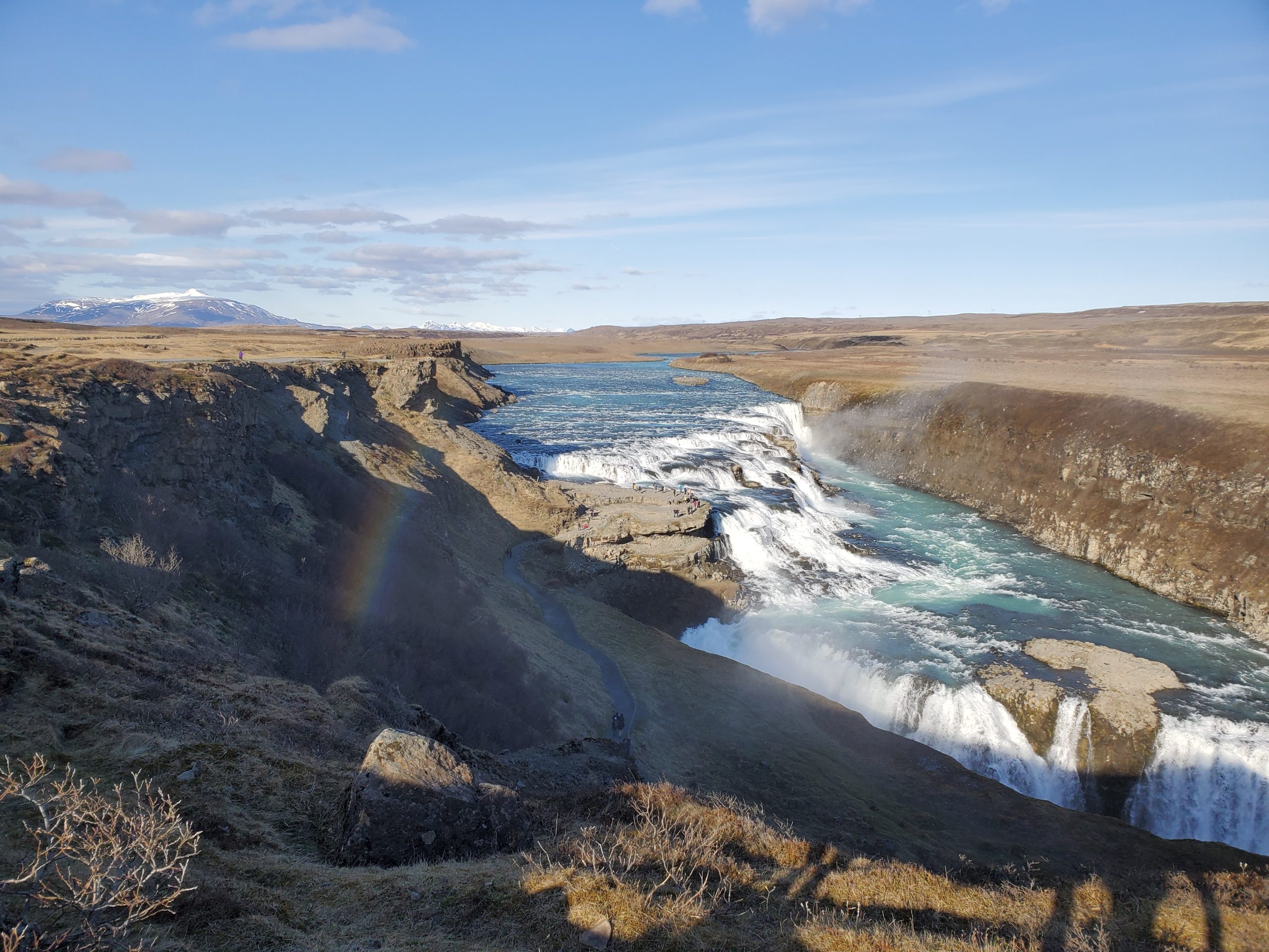From the National Park, we then drove out to see the Strokkur Geyser. This Geyser is the most regular in the world, erupting every 8 to 10 minutes or so. We were lucky enough to see it erupt several times during our visit. Next we headed to my favorite site of the day, the Gullfoss Waterfalls, or Golden Falls. It was really something special, from the scenic cliffs to its two perpendicular diagonal drops, it was a breathtaking waterfall and we even got to see a rainbow in the mist.