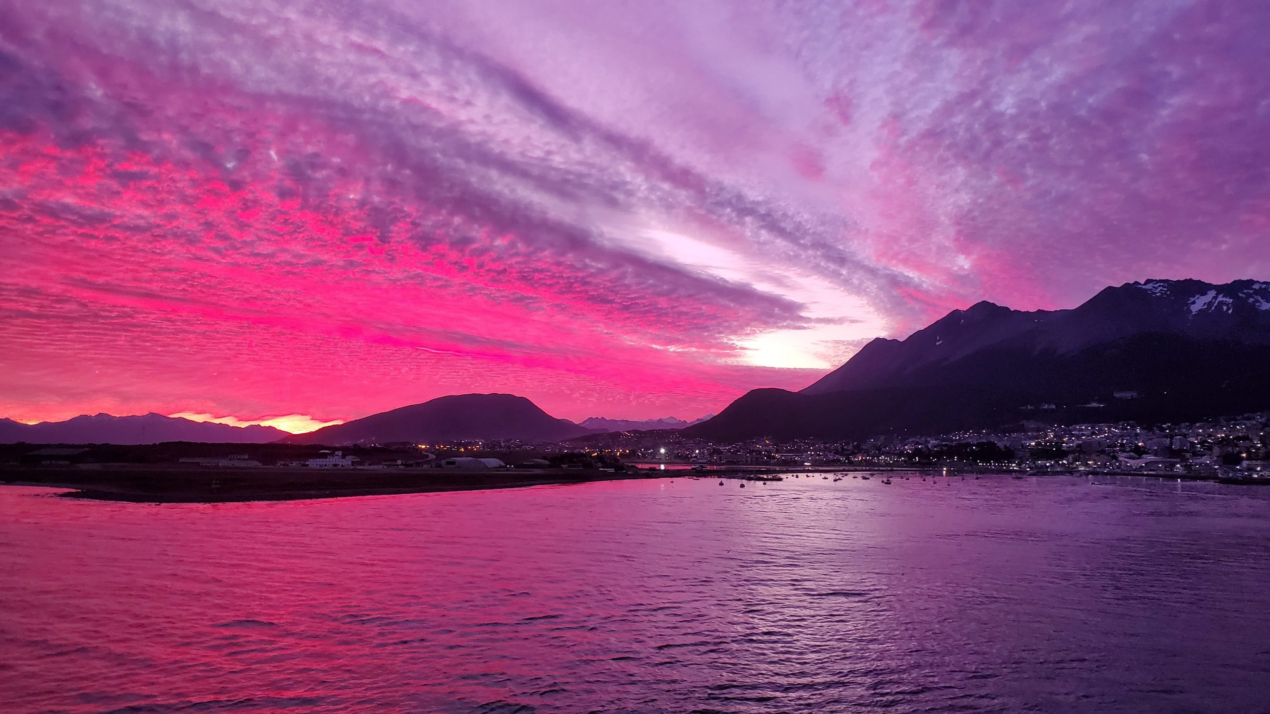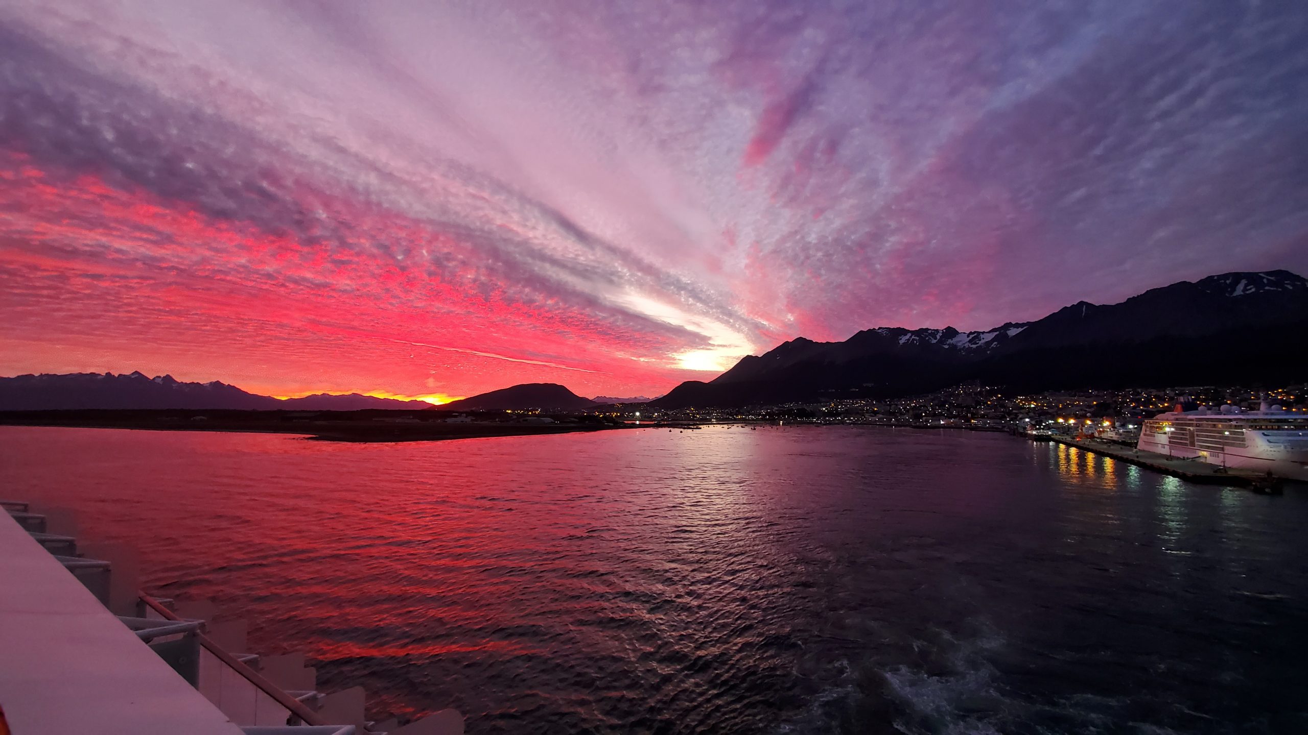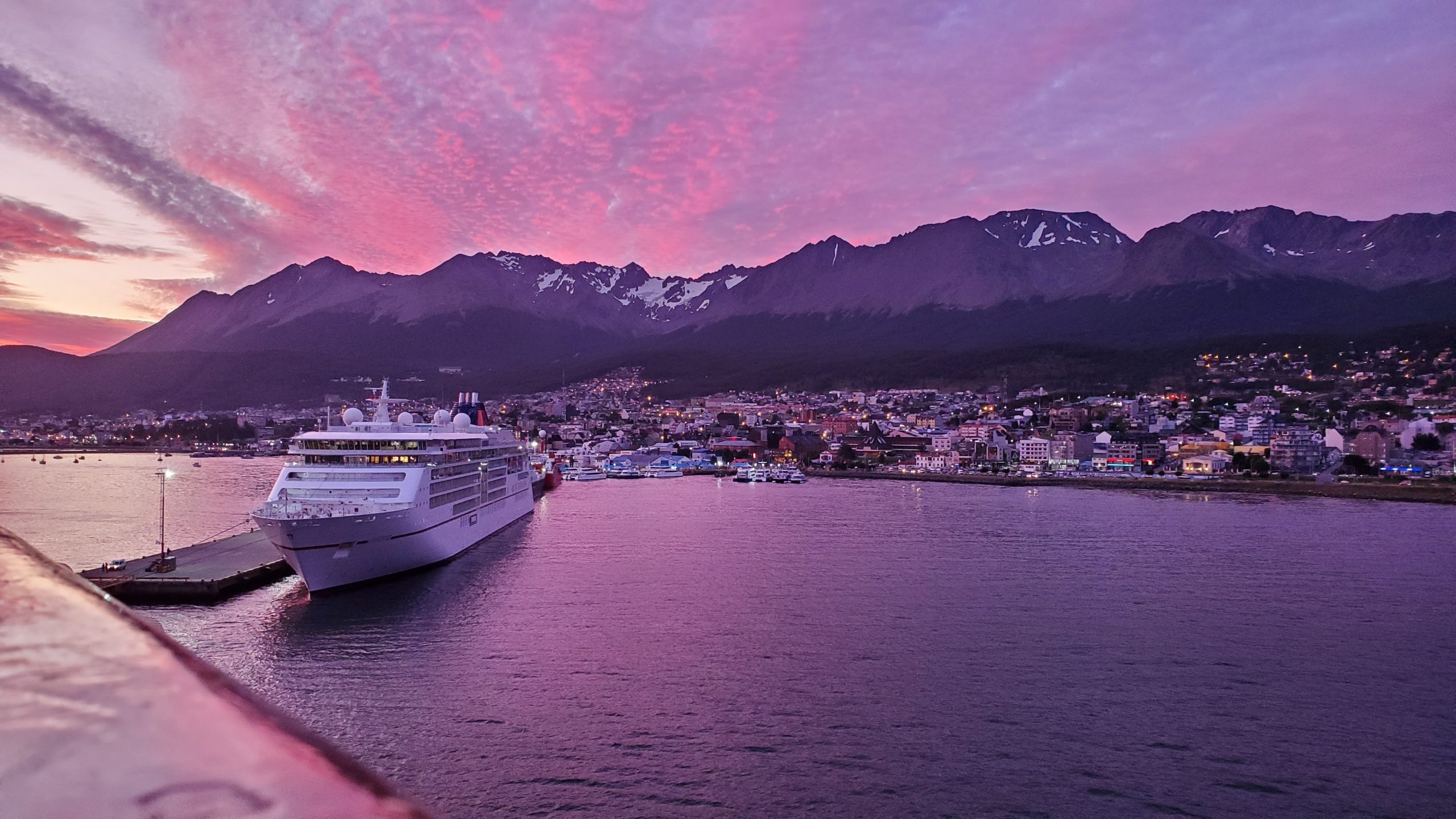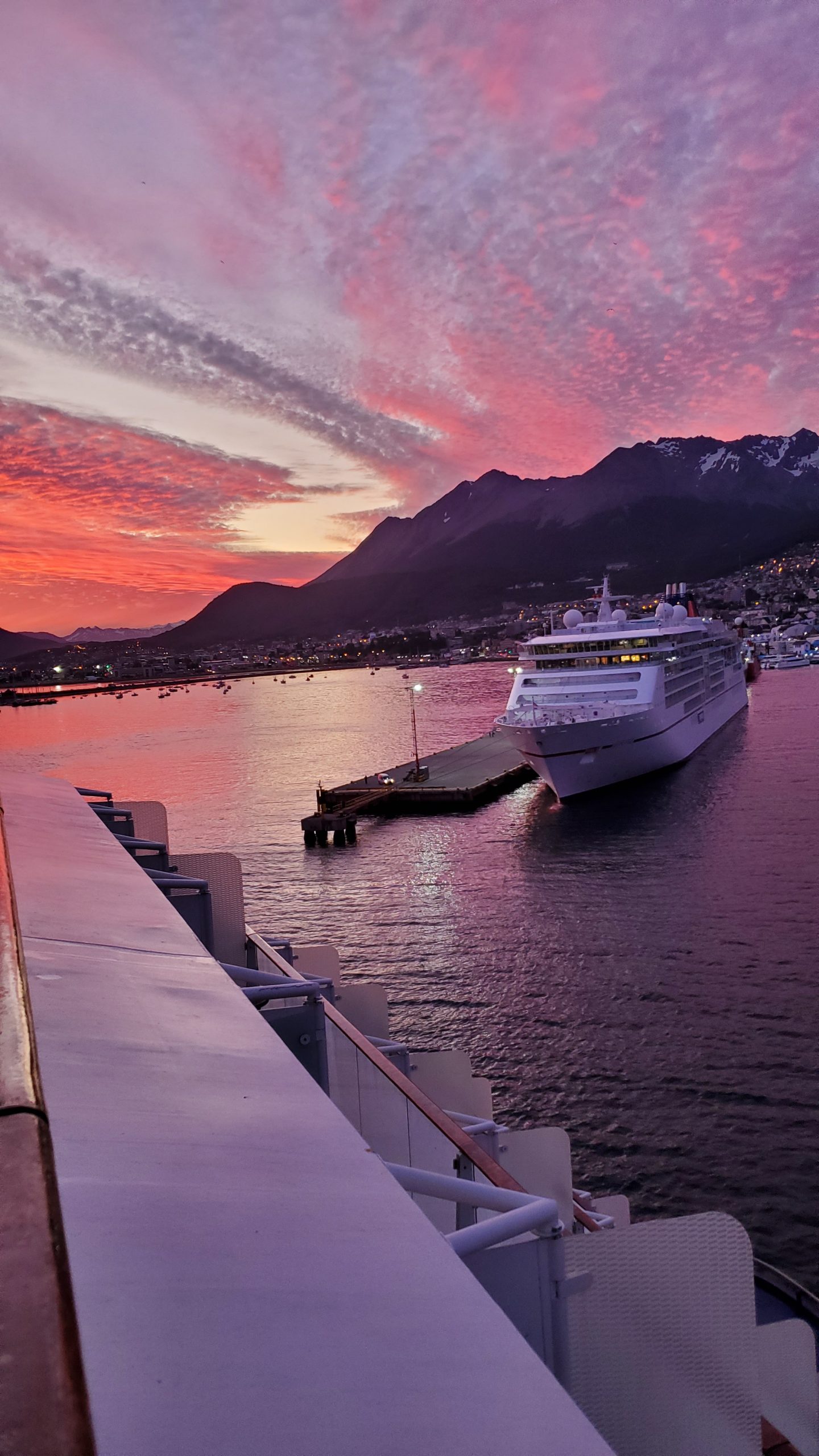 The evening as the ship sailed out of Ushuaia was another extraordinary experience. We forwent dinner in the dining room and instead ordered room service so we could watch the late sunset from our balconies. We also had fun trying to identify the Antarctic expedition ships that were making their way in and out of the port to begin or end their extensive expedition style cruises to the southern continent.