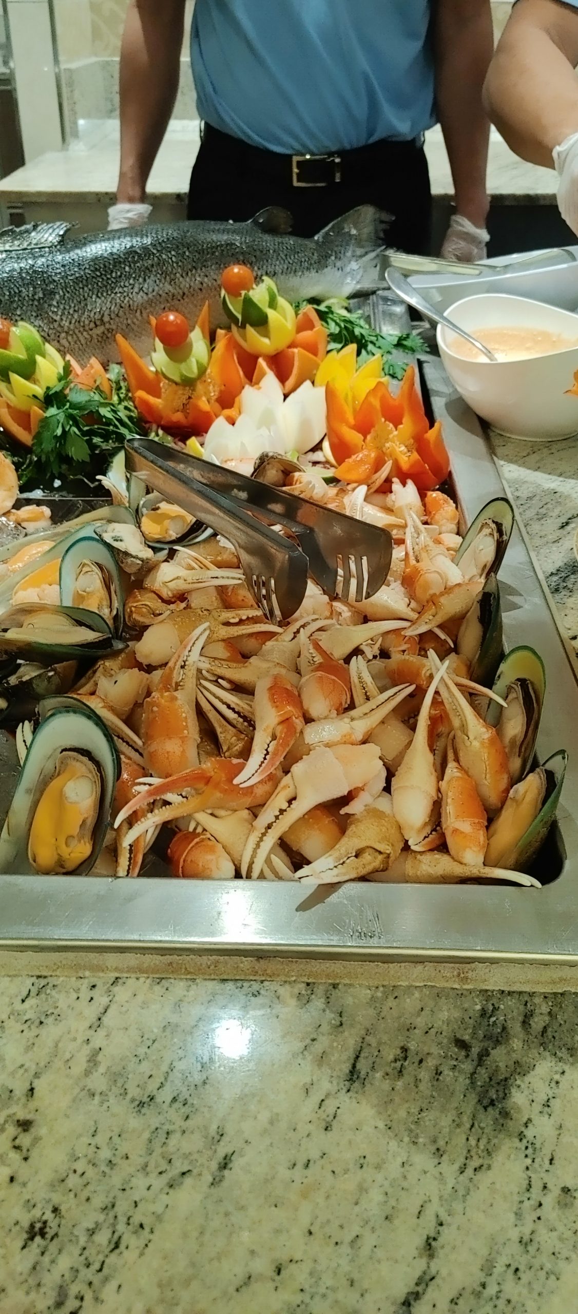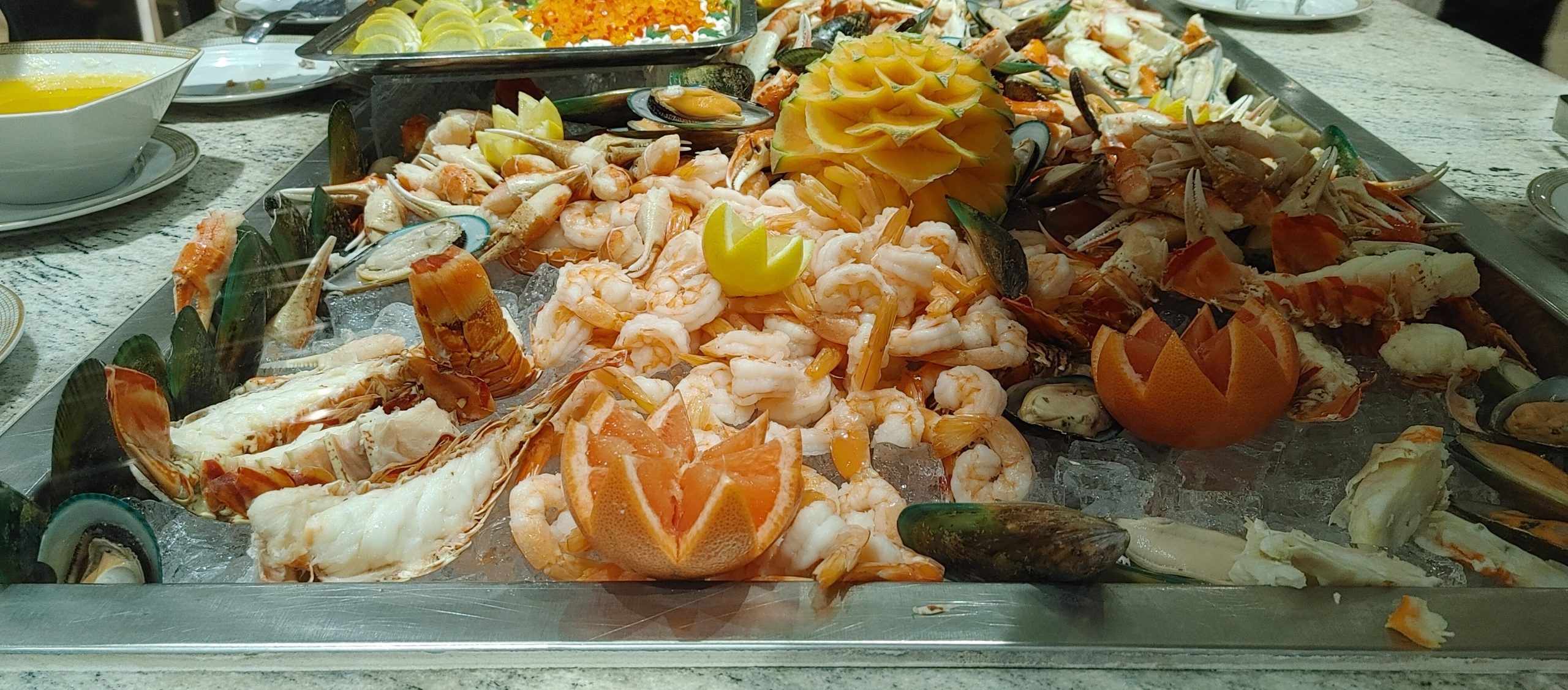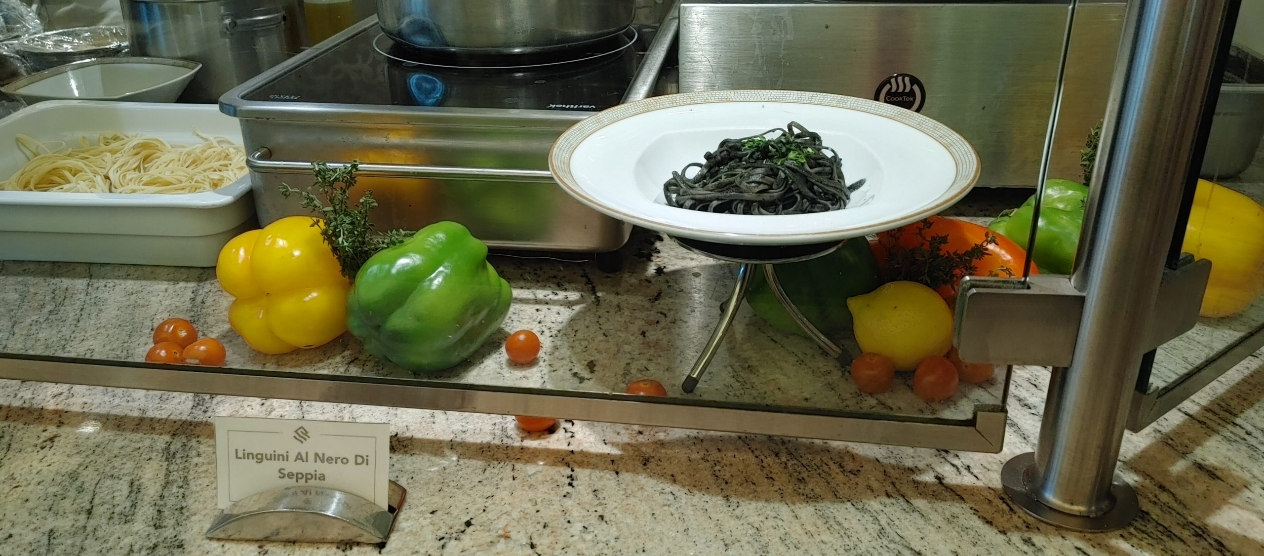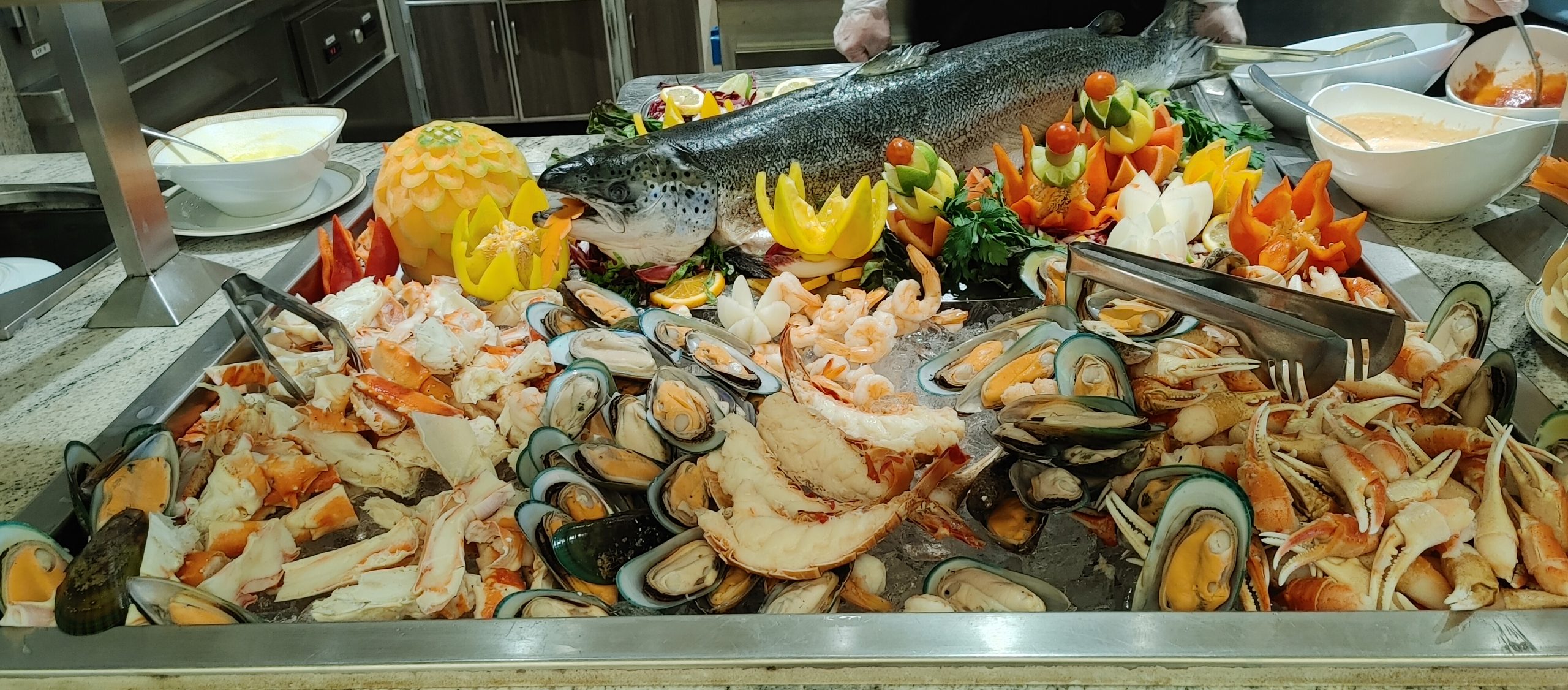 La Terrazza serves as the quick serves and sit down restaurant for breakfast and lunch, but transforms into an authentic Italian eatery in the evenings. For breakfast, I love to have salmon or smoked halibut. I never have fish for breakfast at home, but it seems to be a regular on many cruise ships. The quick service area was not self serve, it was point at it and they serve it to your plate. At night we enjoyed specialties such as saltimbocca, gnocchi’s, and several other fantastic pasta dishes. We even sprang for a bottle of a connoisseur wine. On one of of last sea days, they featured a seafood extravaganza, kind of like one gets on a seafood tower at a major steakhouse.