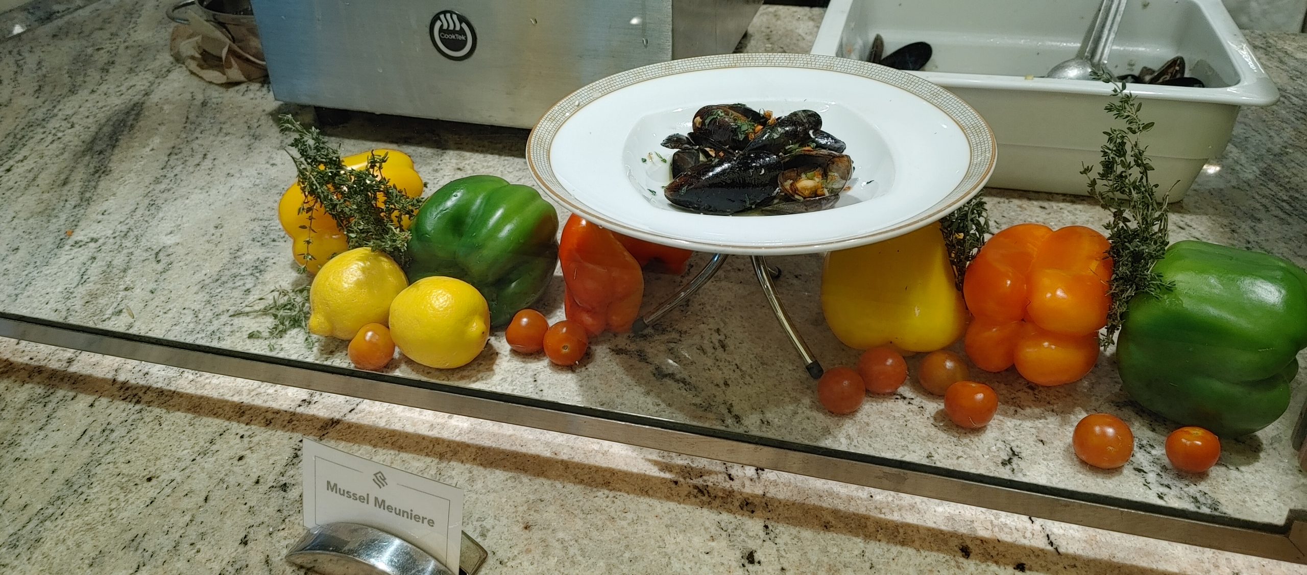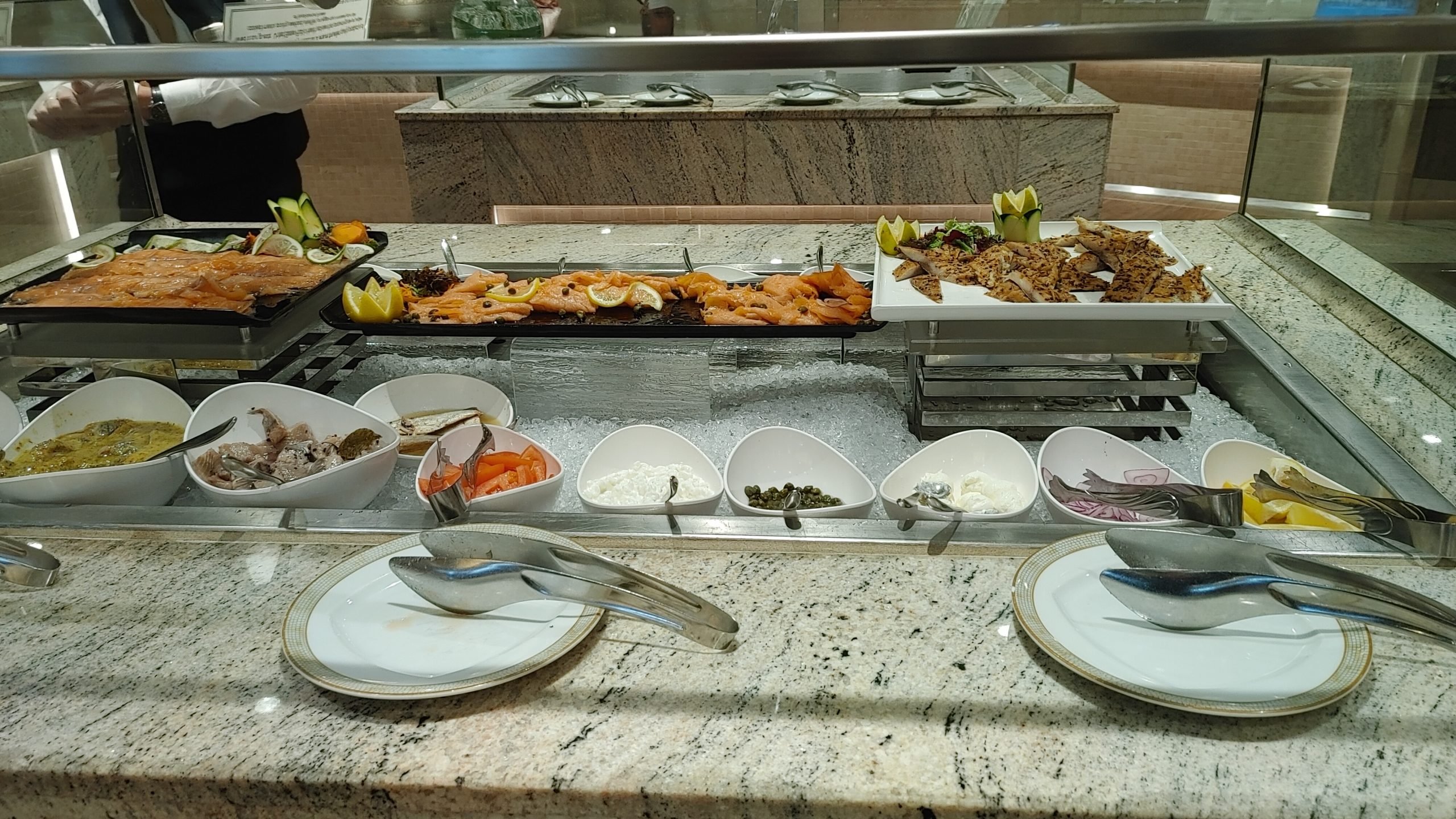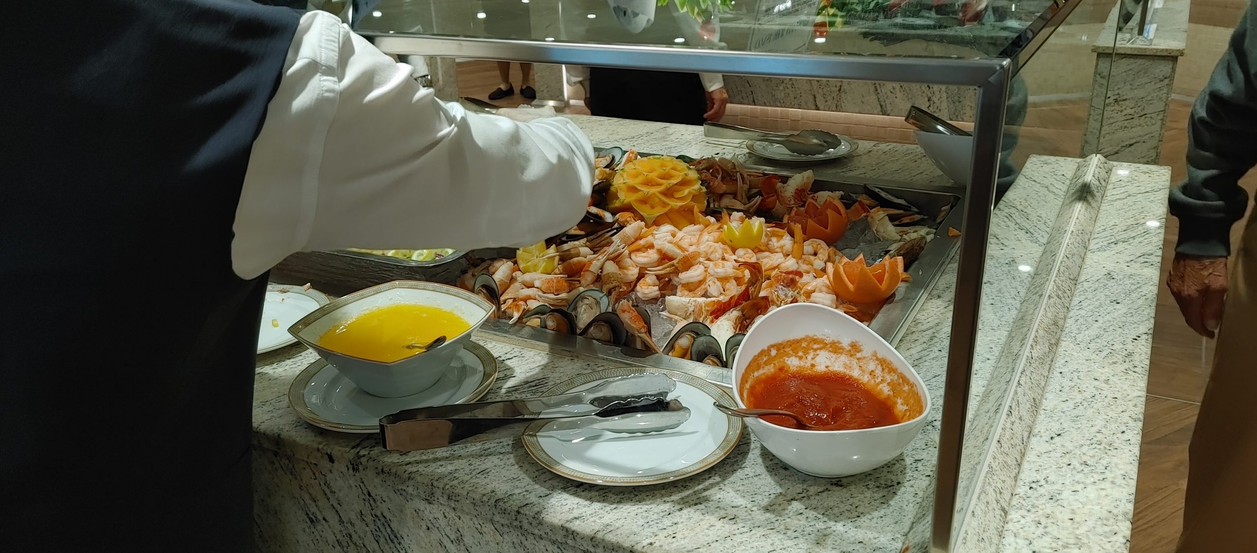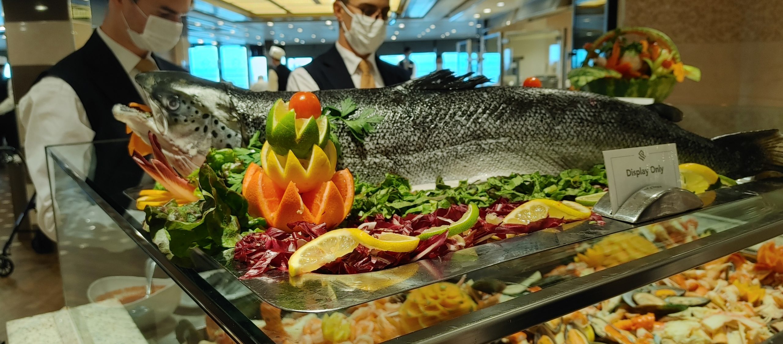 La Terrazza serves as the quick serves and sit down restaurant for breakfast and lunch, but transforms into an authentic Italian eatery in the evenings. For breakfast, I love to have salmon or smoked halibut. I never have fish for breakfast at home, but it seems to be a regular on many cruise ships. The quick service area was not self serve, it was point at it and they serve it to your plate. At night we enjoyed specialties such as saltimbocca, gnocchi’s, and several other fantastic pasta dishes. We even sprang for a bottle of a connoisseur wine. On one of of last sea days, they featured a seafood extravaganza, kind of like one gets on a seafood tower at a major steakhouse.