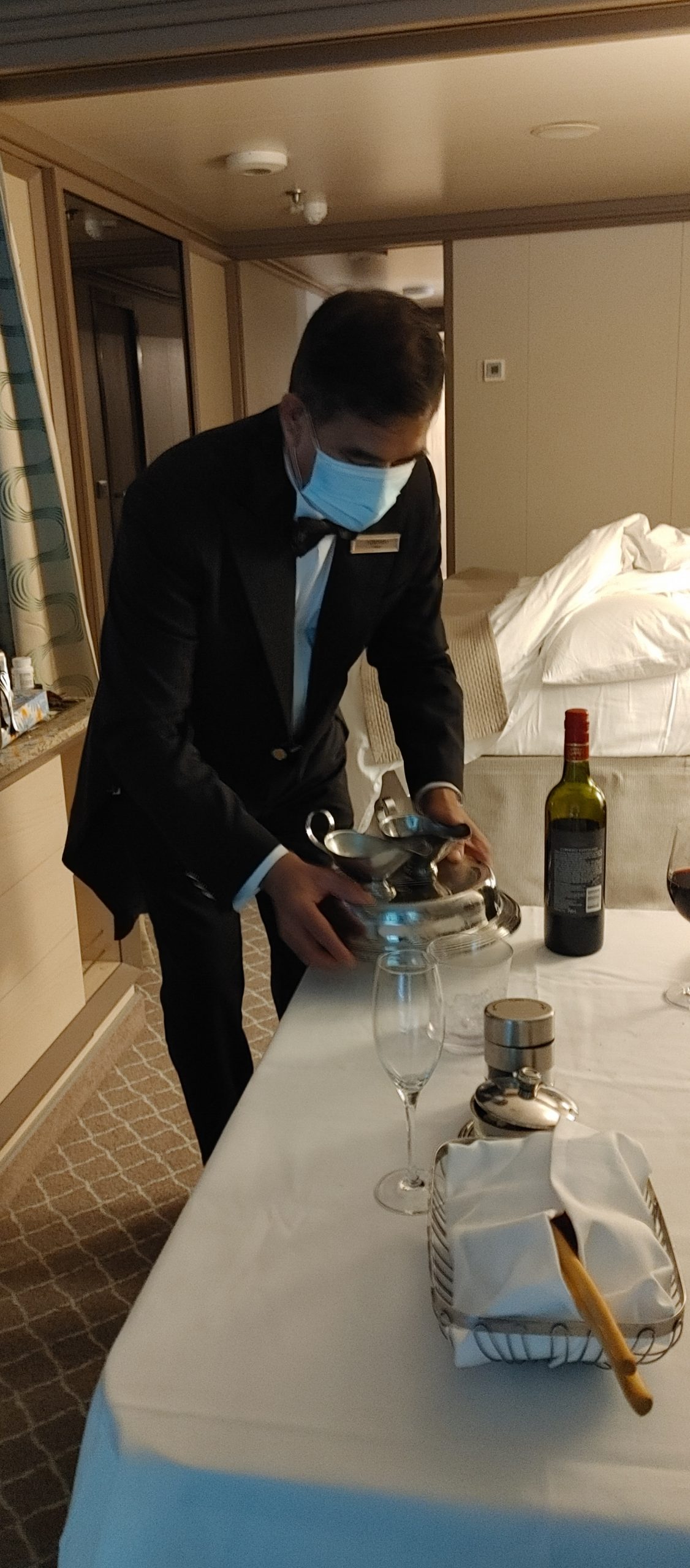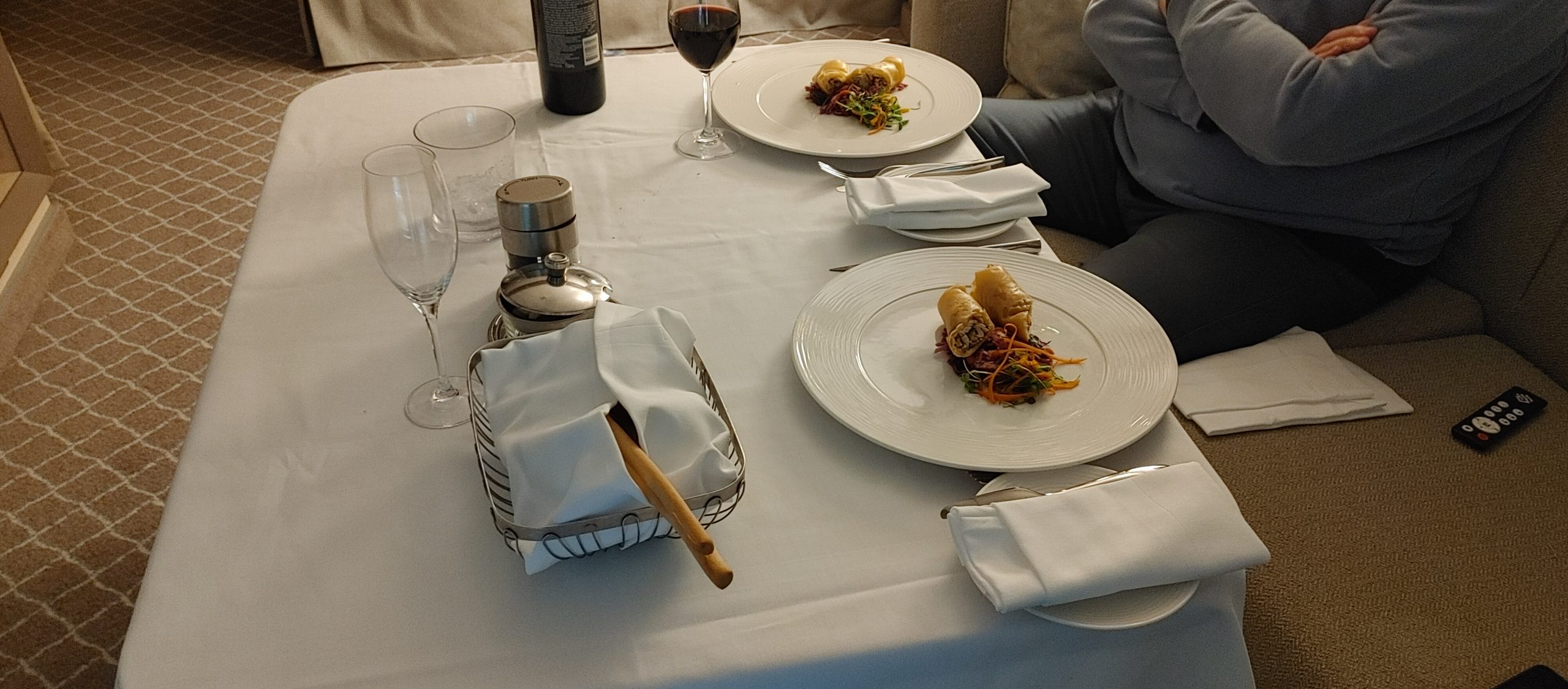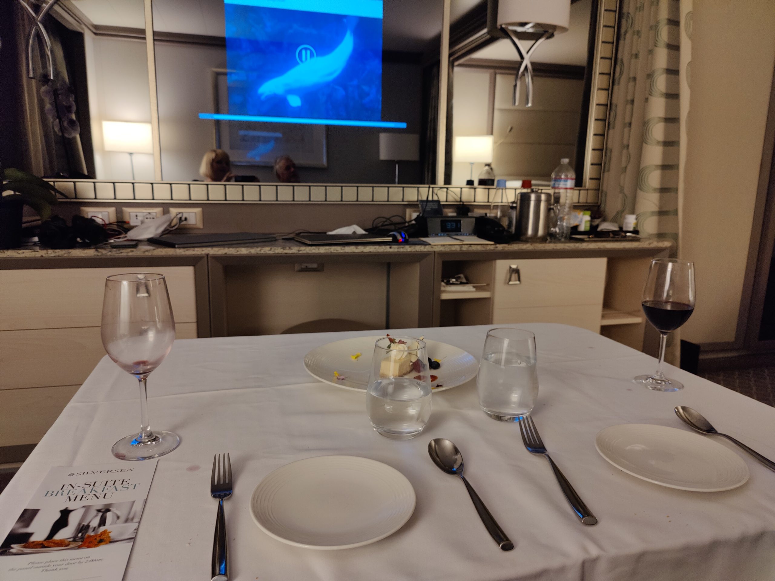 Room Service: Finally, the in room dining is a great experience on Silversea. The butler places a larger table top onto the coffee table in the room giving guests a full size table from which to eat. Then he brings the courses one at a time on the guests schedule. We enjoyed the movie “The Courier” starring Benedict Cumberbatch as we enjoyed our dinner in our room. The menu can be displayed on the in room entertainment system and the Lorenzo our butler came and took down our order. Much more personalized than ordering over the phone. This was such a relaxing and worry free way to spend an evening.
