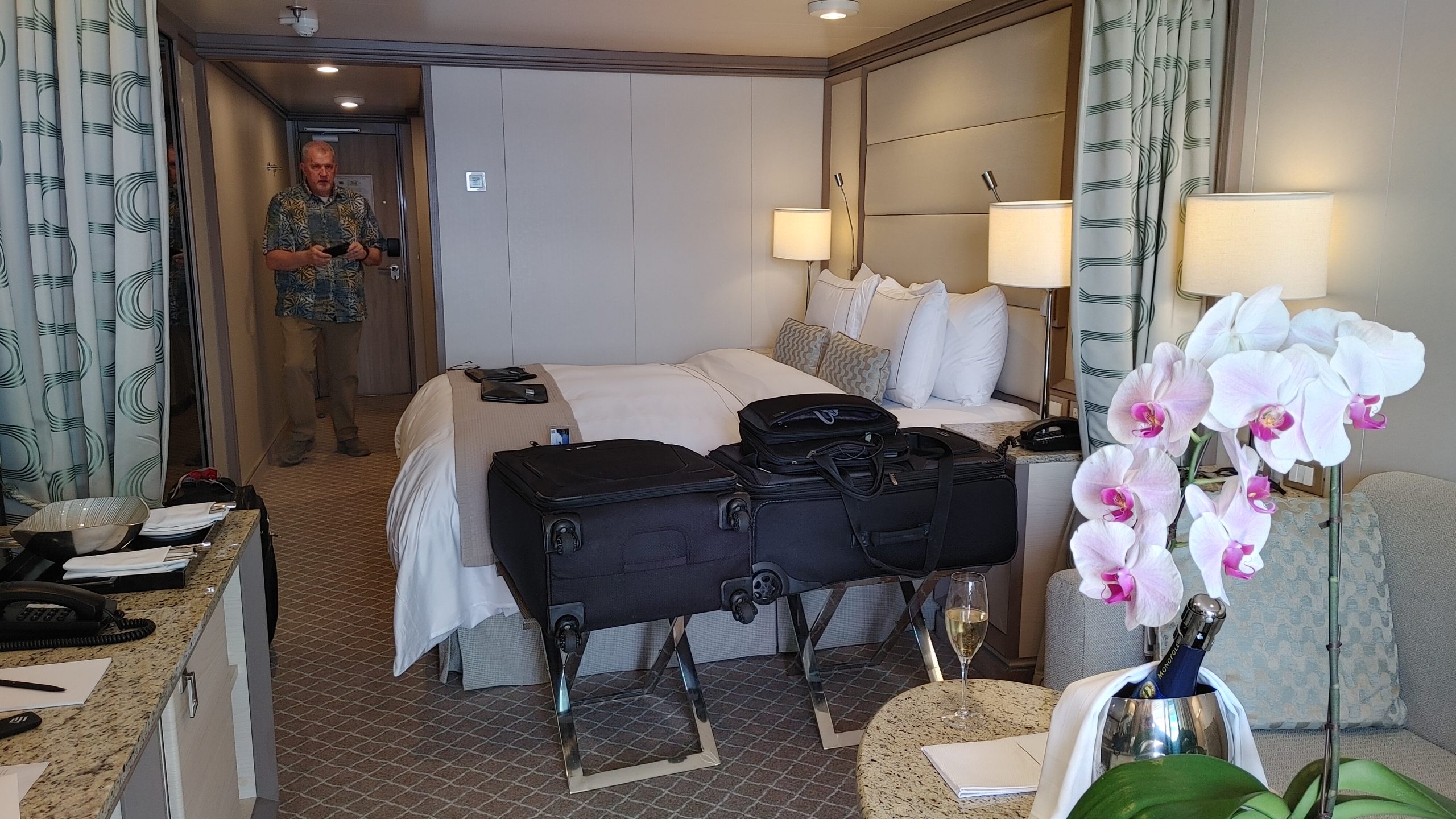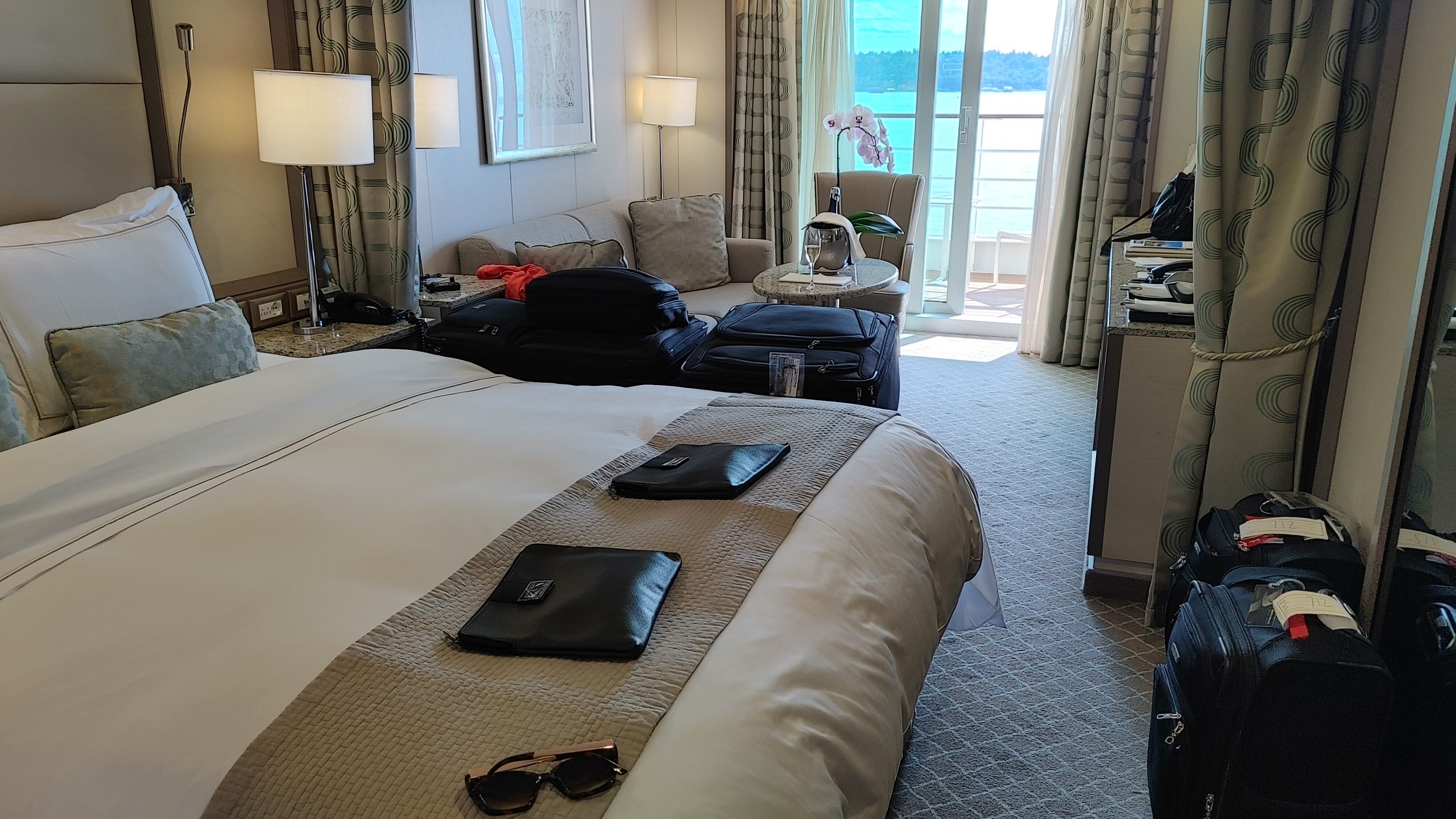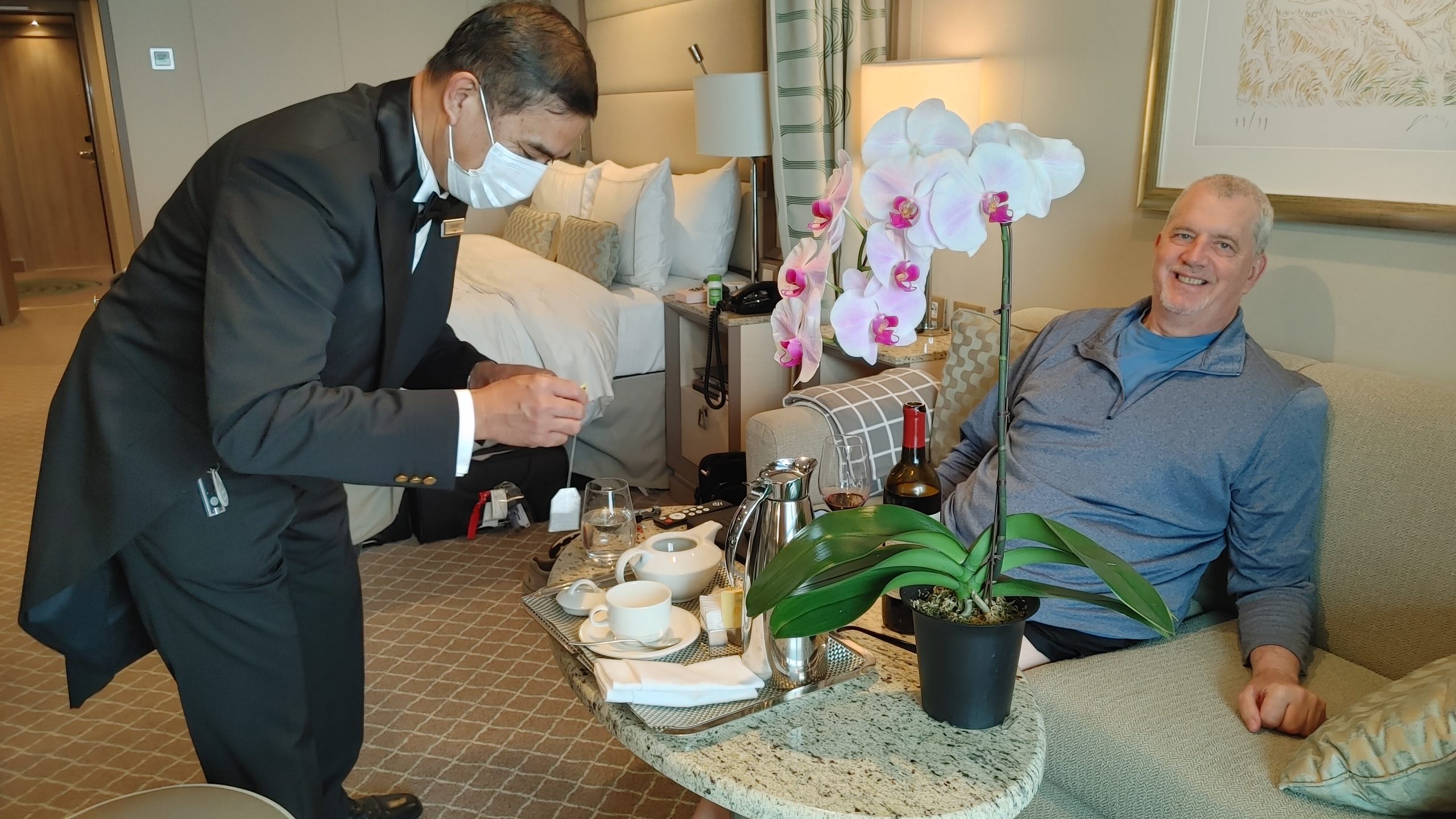 The service onboard the ship was above and beyond anything I have experience at sea. We had a three person cabin team that included our European hotel trained butler and two cabin attendants. When we arrived in our room our suitcases were already in the room on stands. Shortly after we arrived in our room, our butler came in to open our champagne and inquire if we would like him to unpack for us. After our quick muster drill we were back in the room, when our butler, dressed in tuxedo tails came in with two others from his team and a stack of hangers and hung up and put away all our hanging and folded clothes. They left more personal items in the cases for us to unpack for ourselves later. This was such a nice touch for me because on other lines, usually our suitcases arrive out in the hall right about sail away time, and I have sometimes missed it because I am unpacking and hanging clothes so that they aren’t too wrinkled the next day.