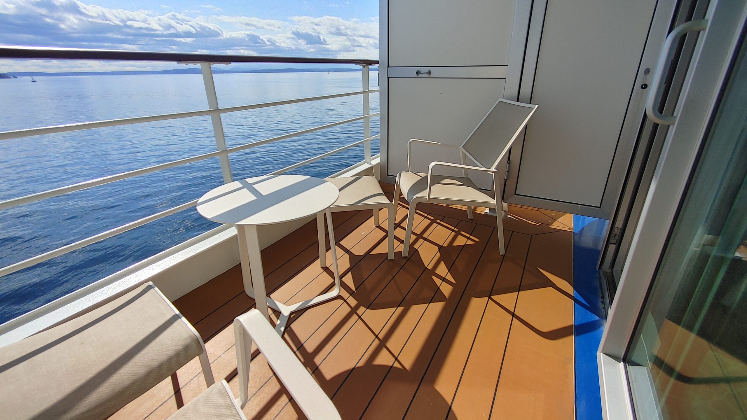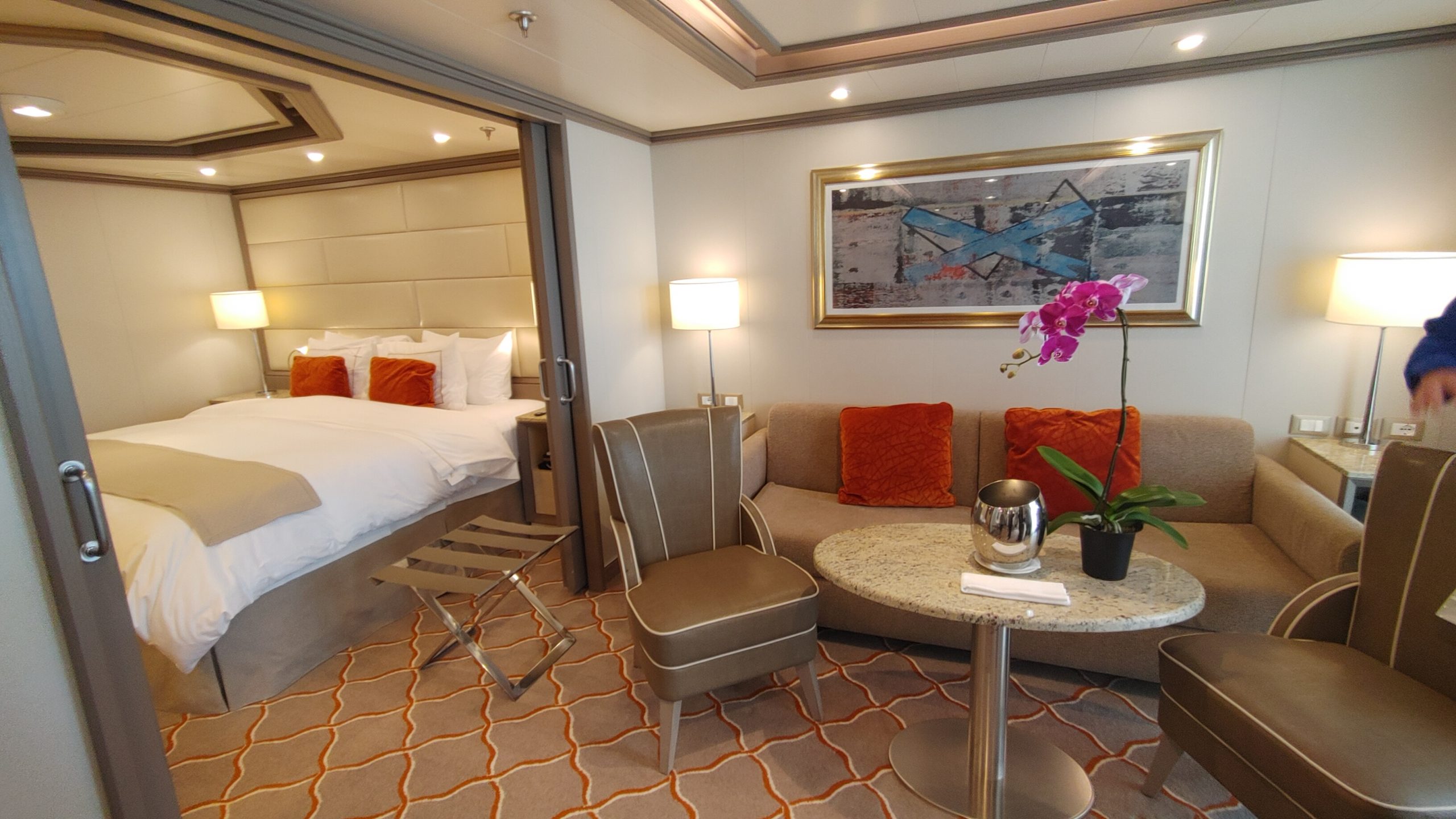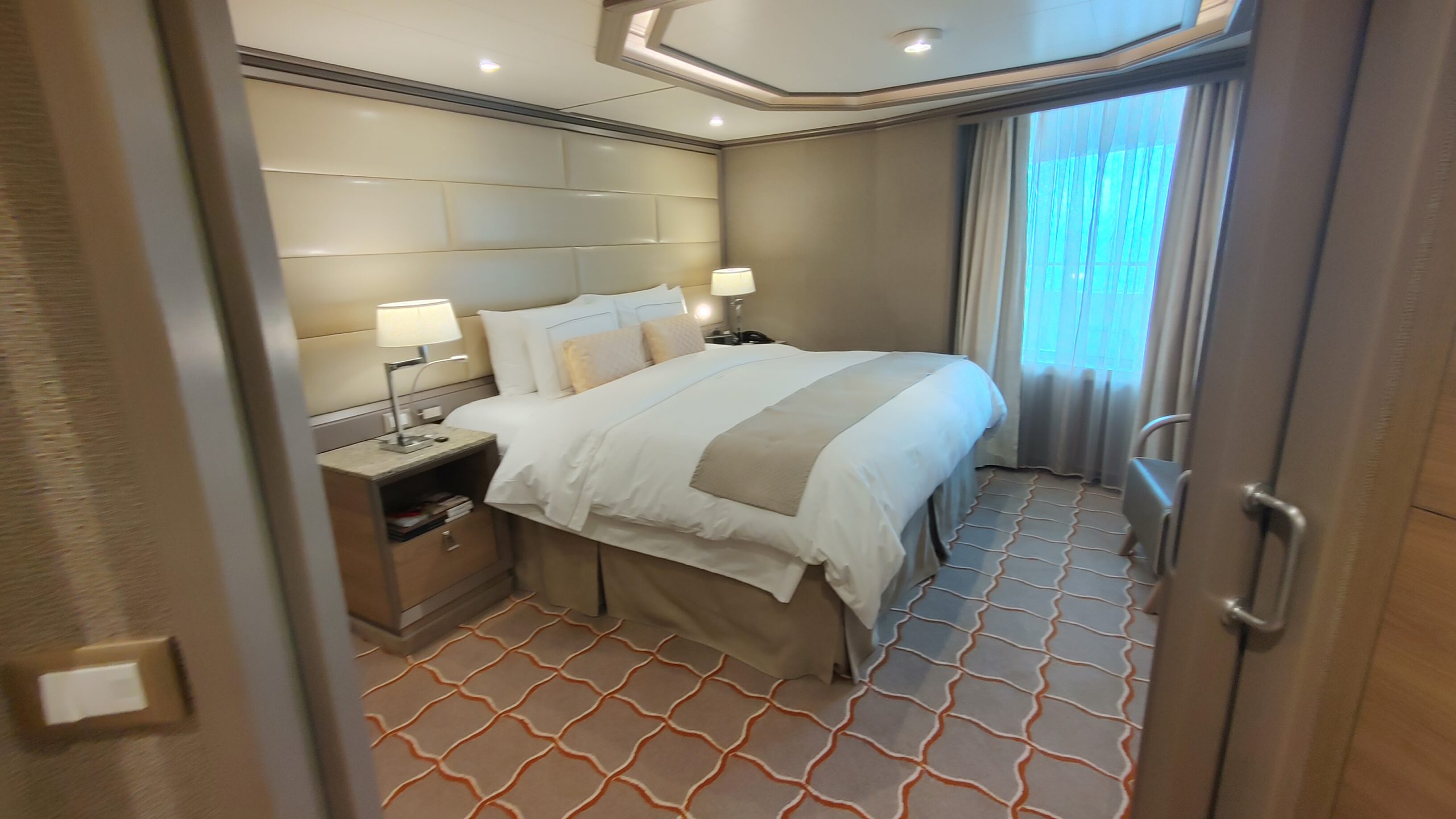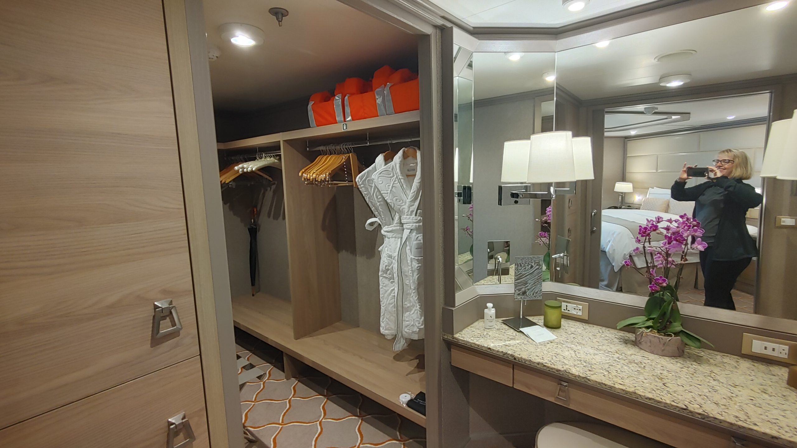 The service onboard the ship was above and beyond anything I have experience at sea. We had a three person cabin team that included our European hotel trained butler and two cabin attendants. When we arrived in our room our suitcases were already in the room on stands. Shortly after we arrived in our room, our butler came in to open our champagne and inquire if we would like him to unpack for us. After our quick muster drill we were back in the room, when our butler, dressed in tuxedo tails came in with two others from his team and a stack of hangers and hung up and put away all our hanging and folded clothes. They left more personal items in the cases for us to unpack for ourselves later. This was such a nice touch for me because on other lines, usually our suitcases arrive out in the hall right about sail away time, and I have sometimes missed it because I am unpacking and hanging clothes so that they aren’t too wrinkled the next day.