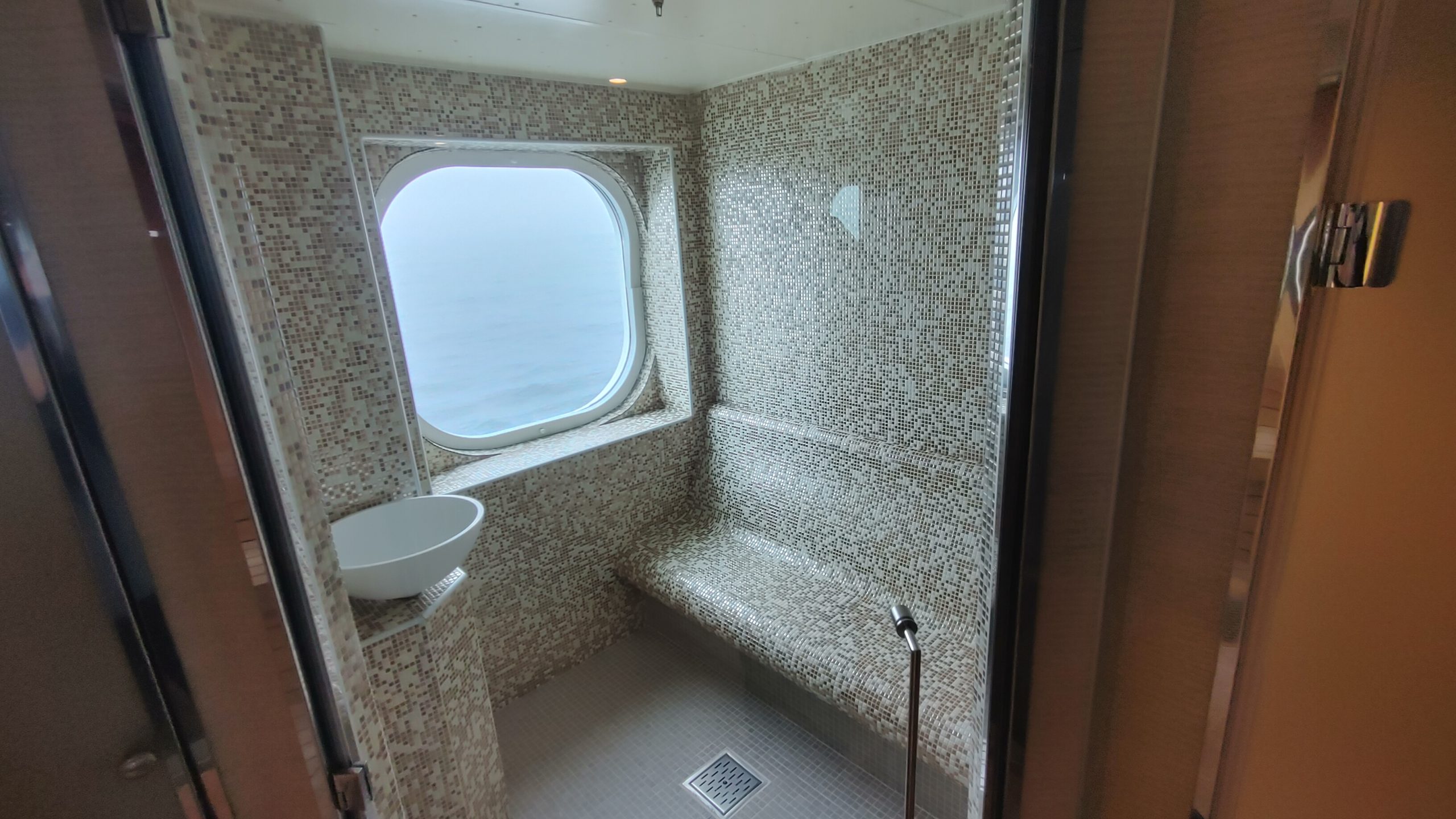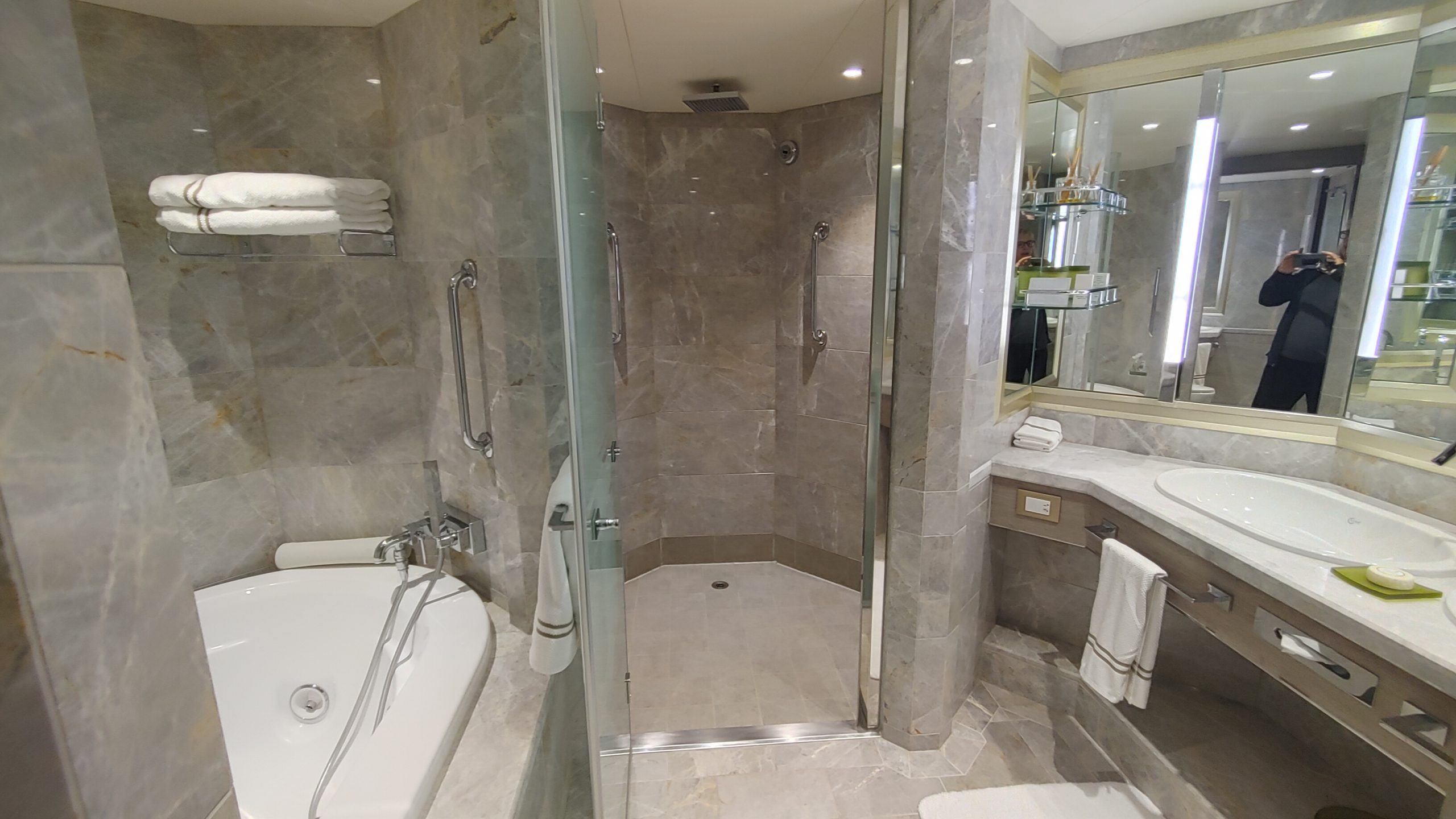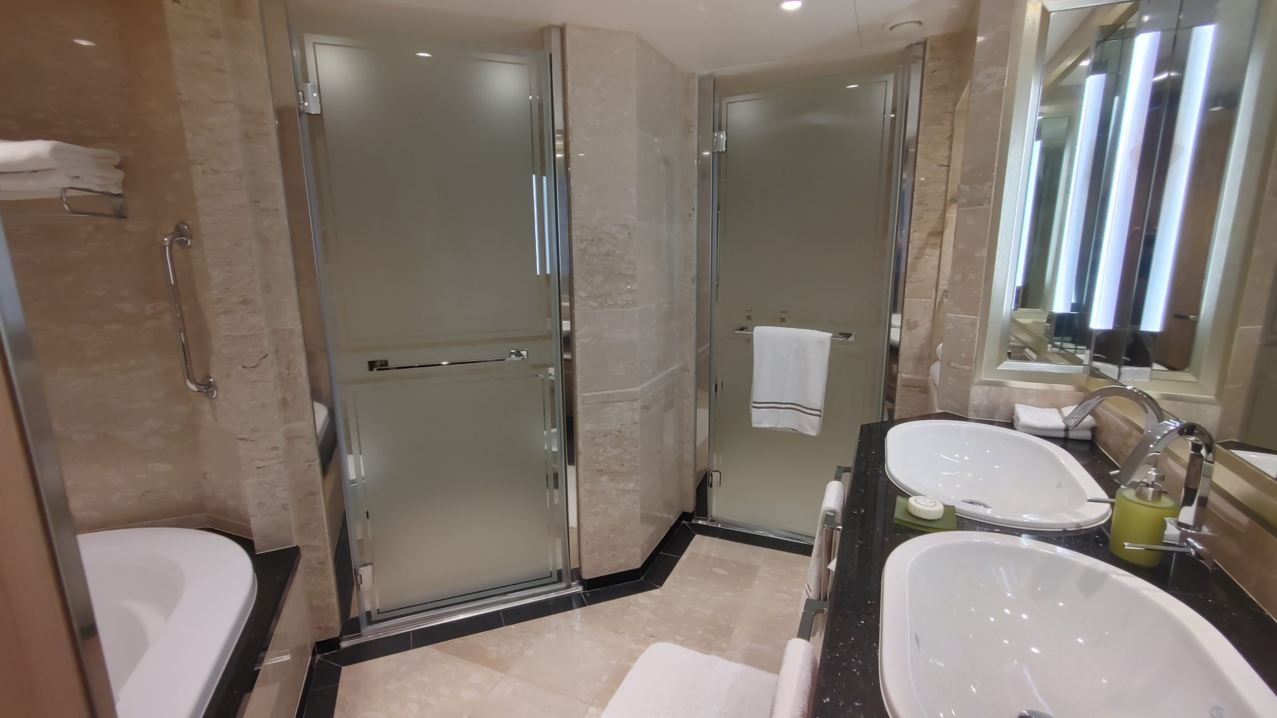 Our suite had a walk in closet and large bath with a shower and tub and large counter with a sink. Two people could easily fit in the bathroom. The room was nicely set up with our preferred arrangement of the bed by the entry to the room and the sofa and desk closer to the balcony. On some ships, only every other room has this configuration. There was also a set of black-out curtains that can be used as a room divider if one guests wakes earlier than the other. The room had two TV’s that were built into the mirrors, which was a nice touch as the TV was not obvious or obtrusive. The suites come with that famous butler service also, so either a glass of wine or some hot tea was just a phone call away.
