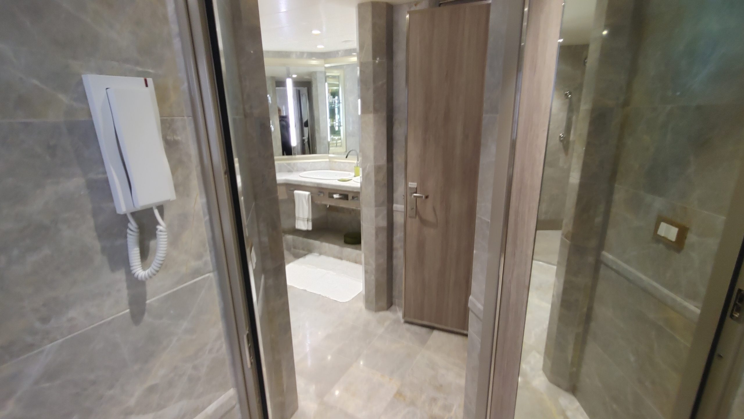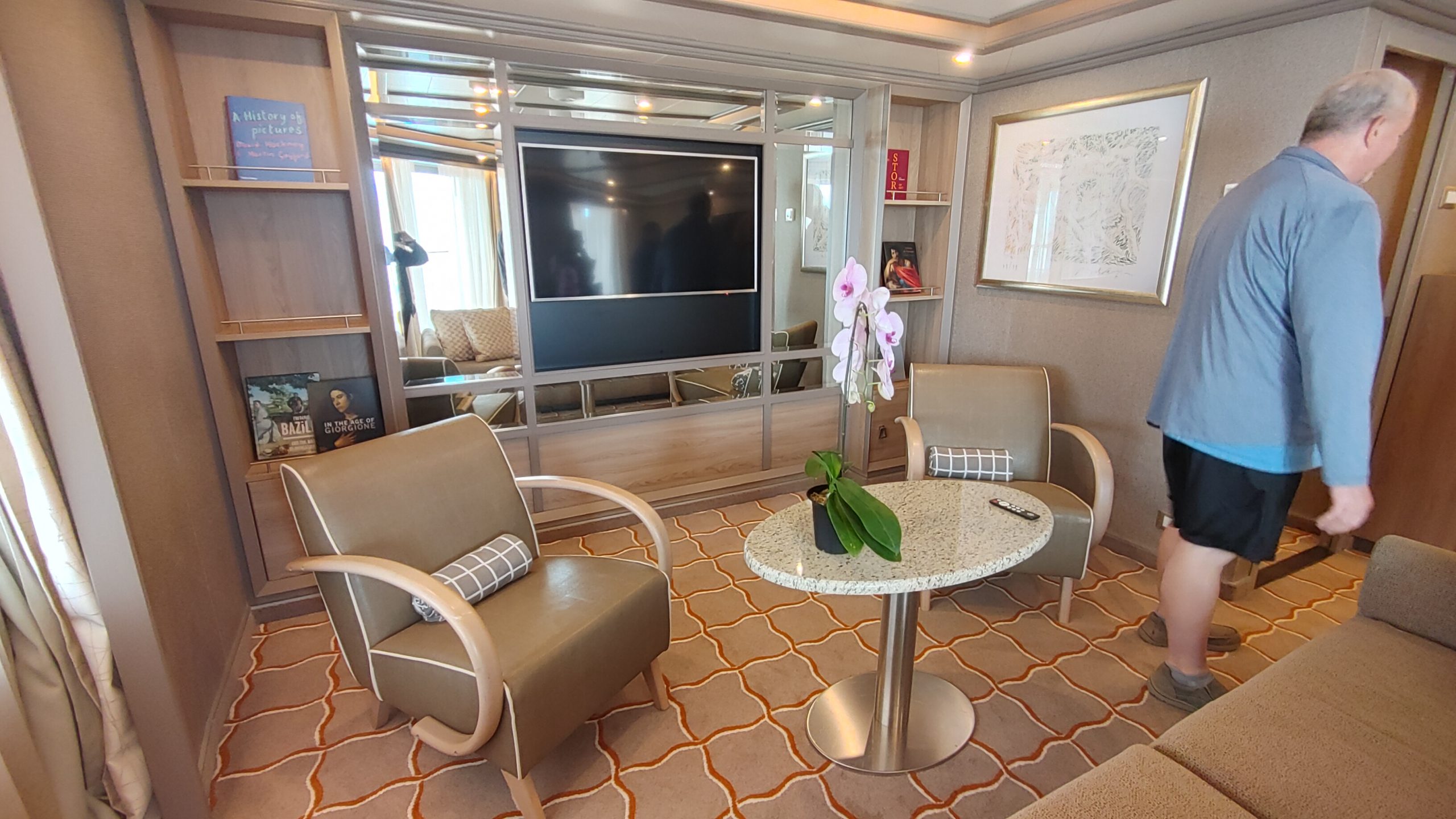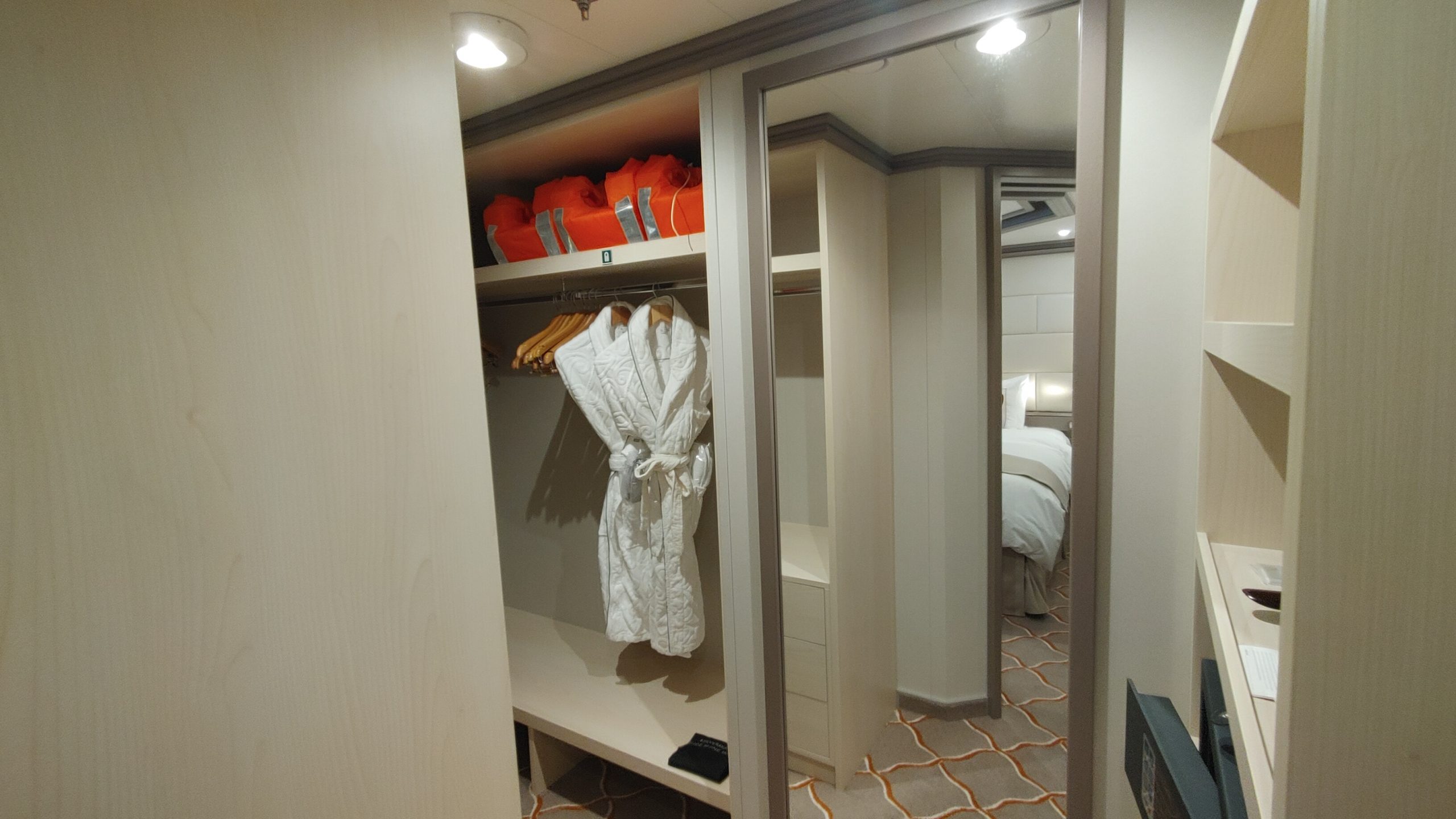 Our suite had a walk in closet and large bath with a shower and tub and large counter with a sink. Two people could easily fit in the bathroom. The room was nicely set up with our preferred arrangement of the bed by the entry to the room and the sofa and desk closer to the balcony. On some ships, only every other room has this configuration. There was also a set of black-out curtains that can be used as a room divider if one guests wakes earlier than the other. The room had two TV’s that were built into the mirrors, which was a nice touch as the TV was not obvious or obtrusive. The suites come with that famous butler service also, so either a glass of wine or some hot tea was just a phone call away.