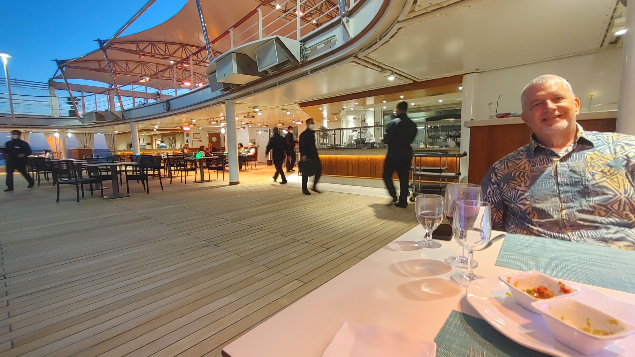 The crew were all happy to see guests back onboard, and even though they had to wear masks, you could see that they were all smiling. There didn’t seem to be anything we could ask for they they weren’t able to get. During afternoon trivia sometimes I would have glass of champagne and other times it was hot tea. But they always came right to me for my request and came back promptly with the item. There was absolutely no standing in line at any point to be seated or served. It tried to imagine how it would be if the ship was at full capacity, and with the high staff to guest ratio that they have, even at full capacity it would never be a wait. I’ll cover the dining service in more detail on the dining review page, but I’ll just touch on the fact that there was never a wait or a want, if they didn’t have exactly what you requested, they would get it for you. My husband wanted salsa for his eggs, the chef made it from scratch in about 5 minutes and had it for him. At every meal they were poring a white and red wine, but if you wanted something else they would ask you what you like and then just bring you what you wanted. There was also never a wait to speak with guest relations. My husband and I both bought the upgraded internet package and when we realized that it would have been a lot less to add an additional device to my plan, they consolidated us and refunded his upgrade price. When I had a question about my shore excursion, I just walked up and asked, no waiting there either.