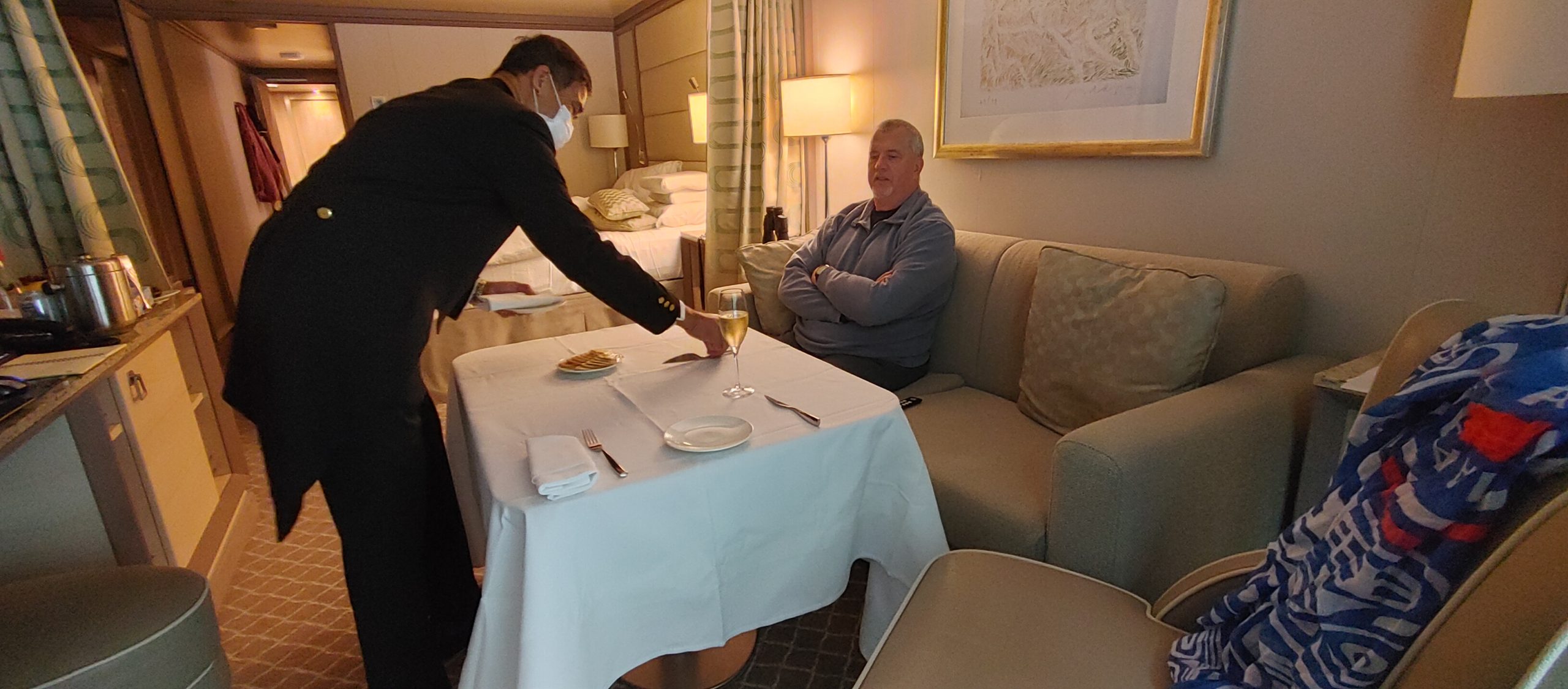 Service – It is hard to put into words how the service exceed expectations. Starting with that butler service where if you want hot tea or a glass of wine in the afternoon all you have to do is call. The butler even came by to polish Steve’s shoes before formal night. We had in-suite room service breakfast and dinner and a nice touch that Silversea adds is that they have a table topper that fits right on the coffee table so that you have a full size table for in room dining. They cover it with a white table cloth, and it is elegant dining right in your room.