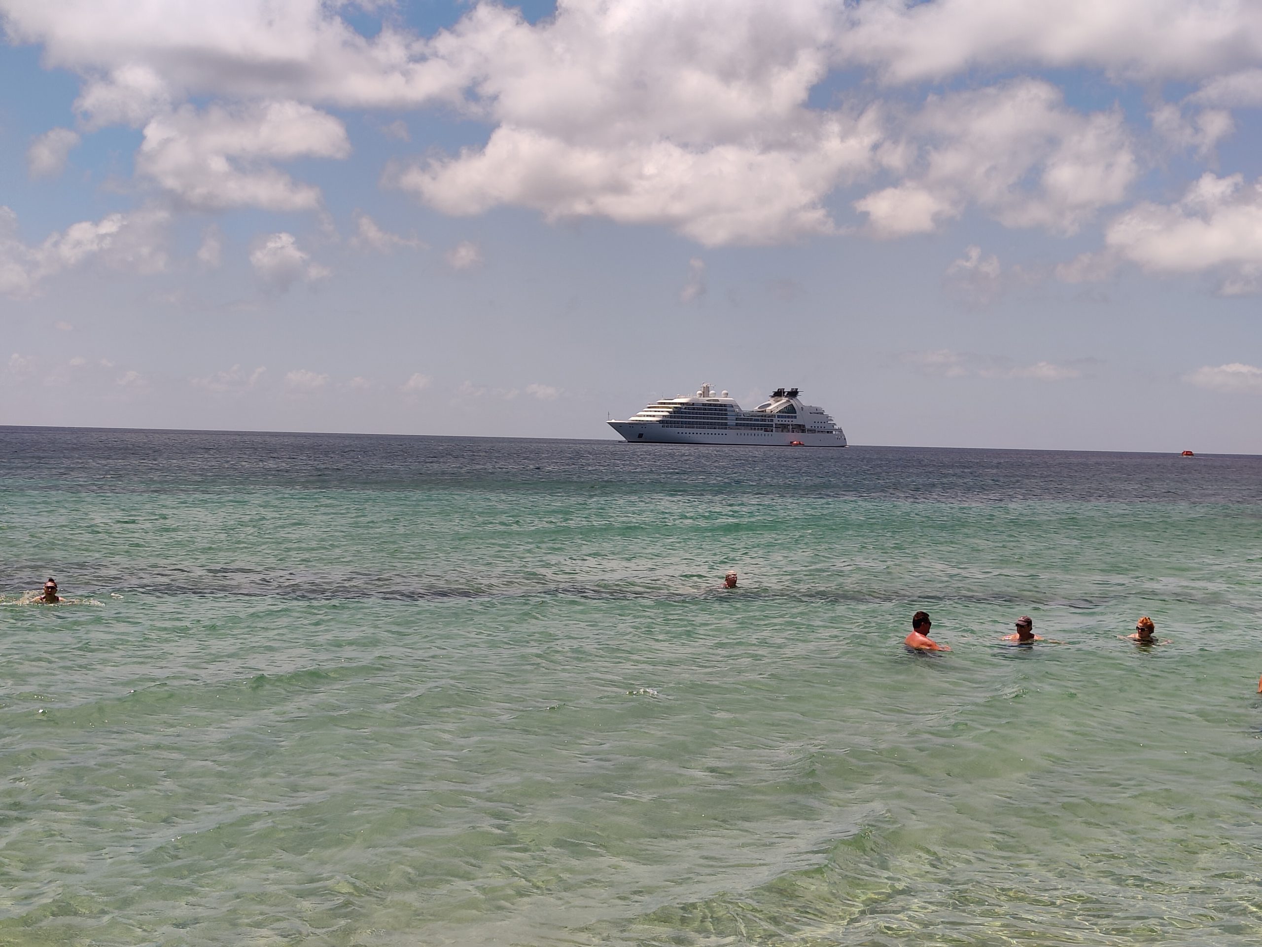 Our day at Carambola Beach in St. Kitts and Nevis might be my favorite day of the cruise. This was some what like a private island experience with the tender boats taking us to Carambola Beach Club. Here, we had access to beautiful clear ocean waters and a small snorkeling cove. Beach chairs and umbrellas were all set up for our use at no charge, and the ship brought ashore their marina “toys” including the paddle boards, banana boats and other equipment. The highlight of the day was the Caviar in the Surf when the Captain and Cruise director arrived on zodiacs. The whole crew served champagne to the guests in the surf (with plastic flutes) and then the dining staff served us all a taste of caviar on a toast or cracker. Quite the experience. For lunch time they set up an elaborate buffet of lobster tails, ribs, chicken and more. After lunch, I even tried a go at water skiing. I couldn’t get up so I’ll blame it on the low powered boat, not my lack of athletic activity over he last 40 years since the last time I water skied. This was a wonderful day of surf, sand, food and fun.