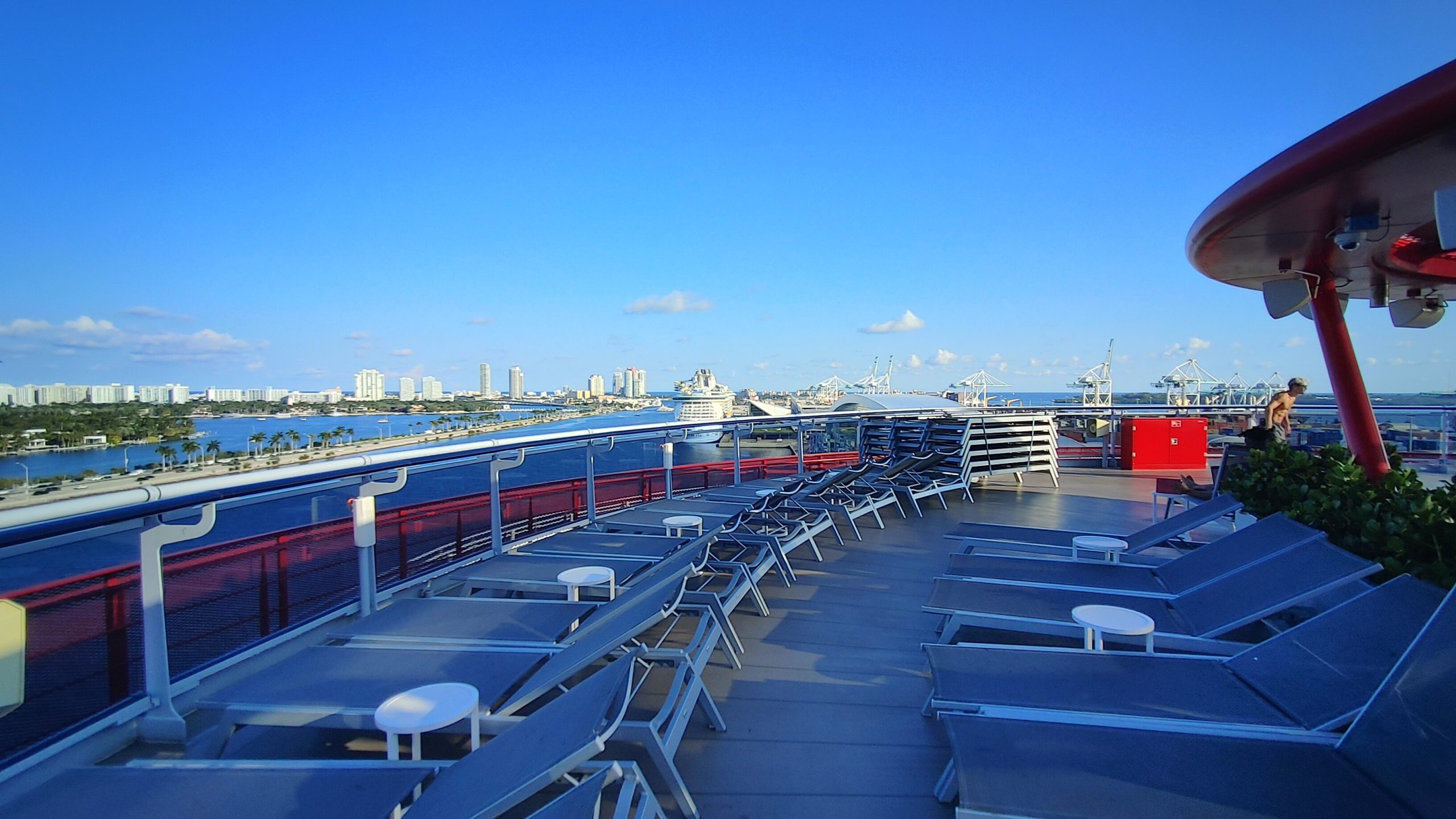 Guests can used the app to find a variety of activities through out the ship through-out the day and evening. These included trivia contests. The Scarlett Lady sail away party was spectacular for three reasons: the great funk band, the free flowing champagne and the spectacular Miami Sky line. The captain, from whom we didn’t hear very often, took the ship out towards Miami before turning the ship around and heading out to sea. Champagne was handed out left and right and the band kept the party going. Following the sail away, the ship hosted a Pajama Party on the aft ourdoor deck.