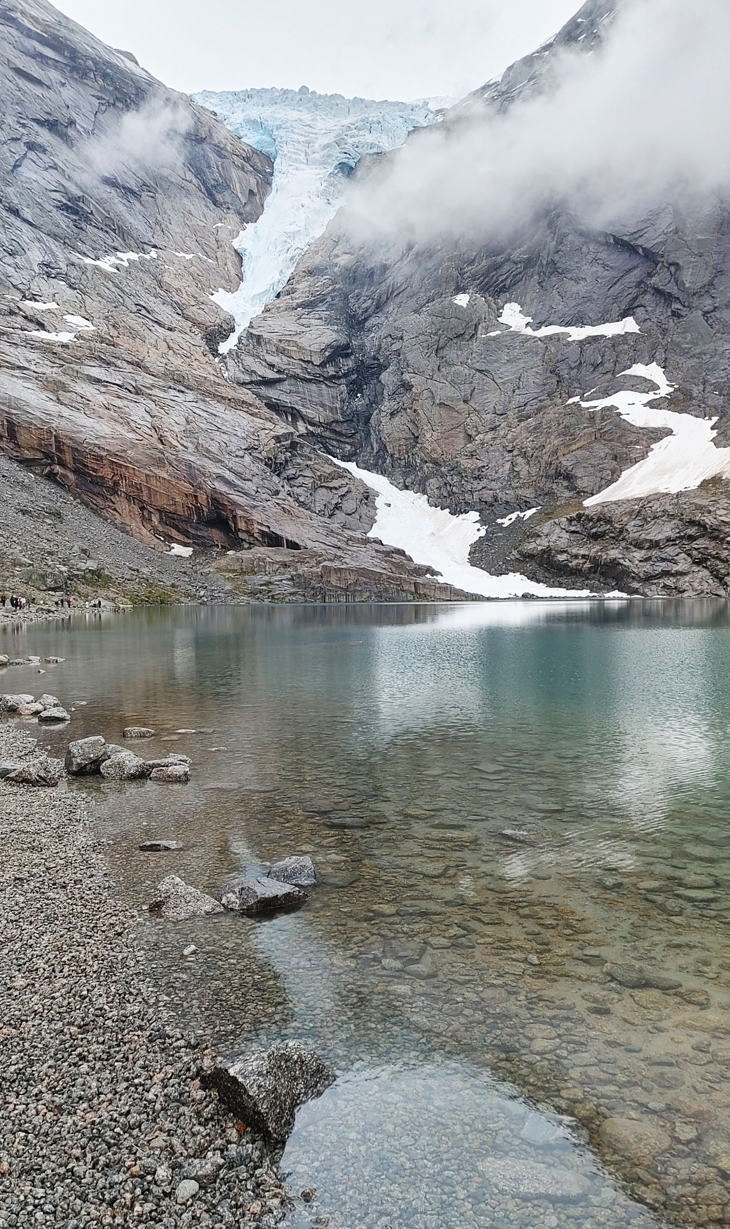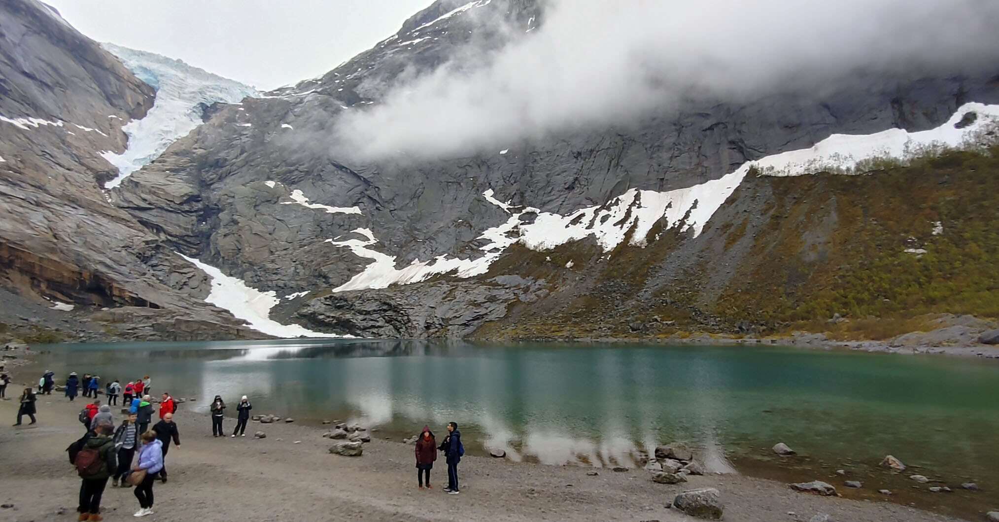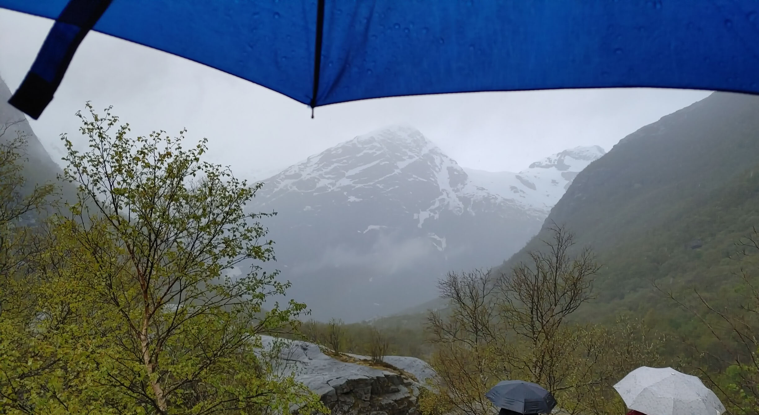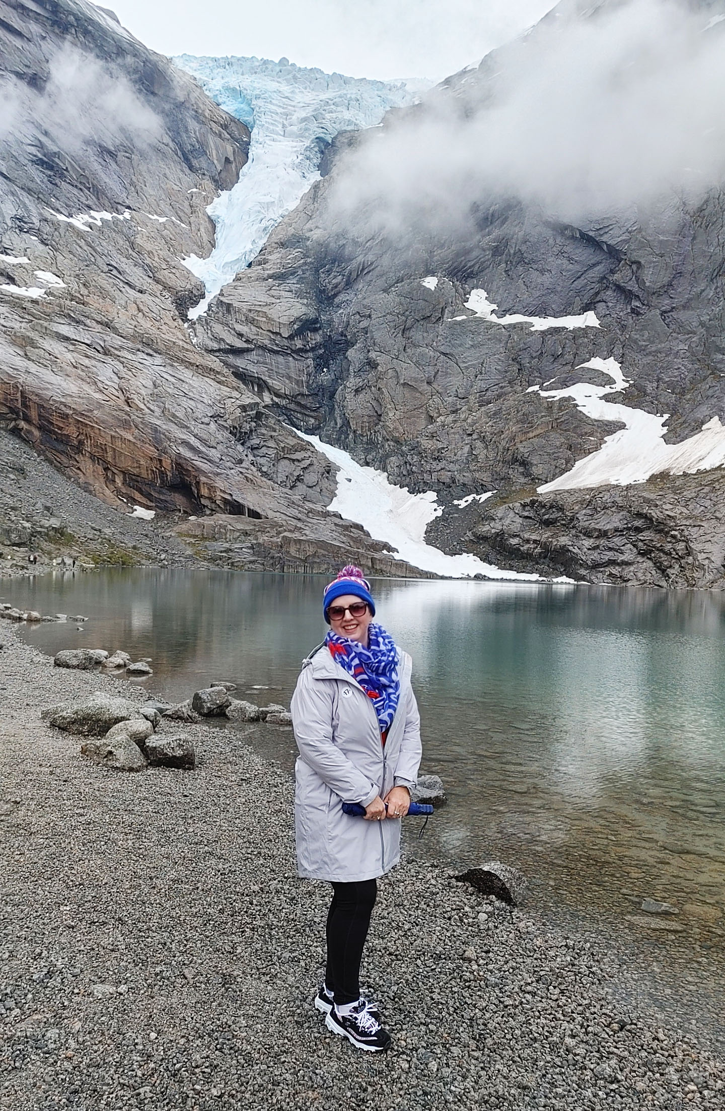 Norwegians have a saying “There is no Bad Weather, Just Bad Clothing”. Good clothing for this day included a raincoat and a umbrella as we got light rain off and on during the hike. Even so, we were treated to the beautiful scenery of the gorge carved out by the glacier over thousands for year, multiple waterfalls and a beautiful lake at the top of the hill below the glacier. The water in the lake is said to be so pure that you can fill up your water bottle and drink it straight. I could not confirm that in any of my research, but several folks in our group did this and didn’t get sick. It was pretty overcast for most of our journey, but you can see that even in the rain and clouds, the scenery was well worth the journey.