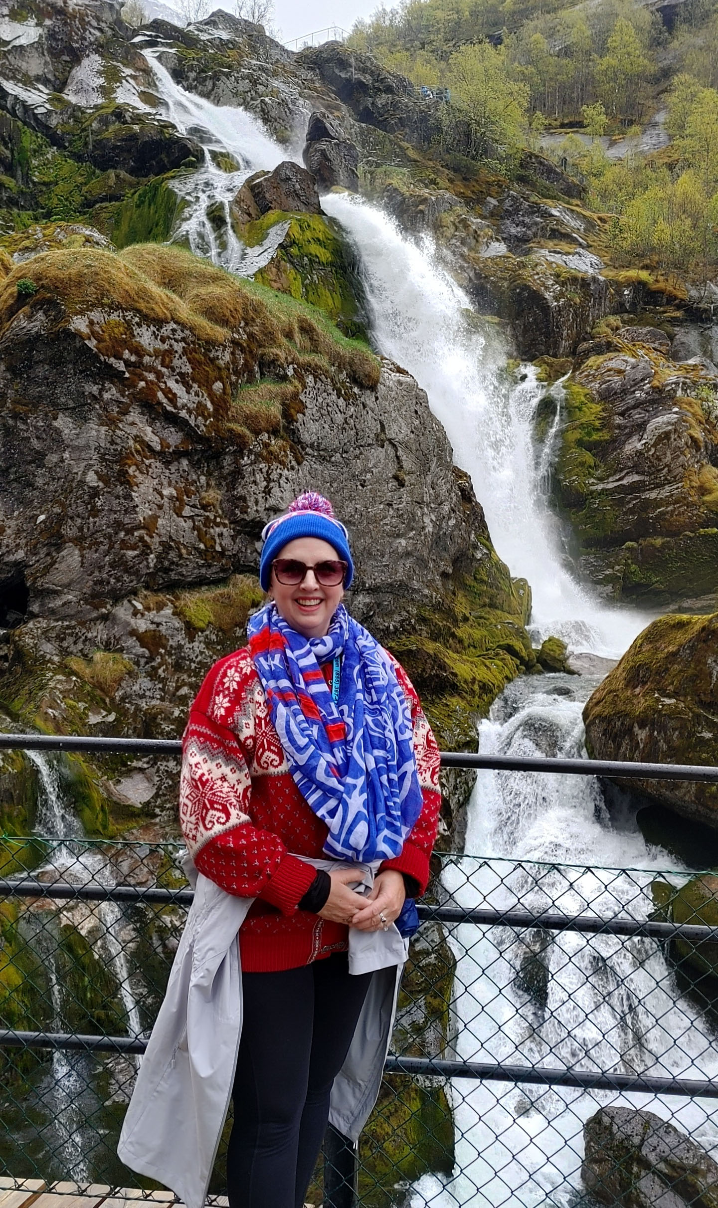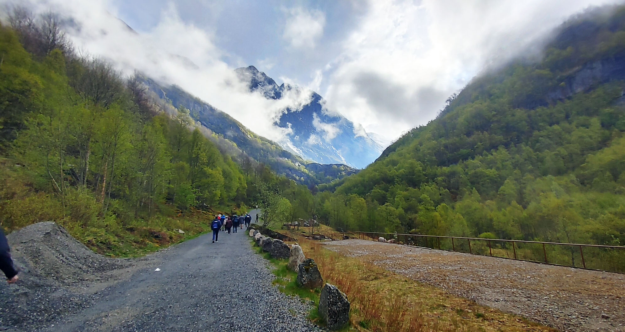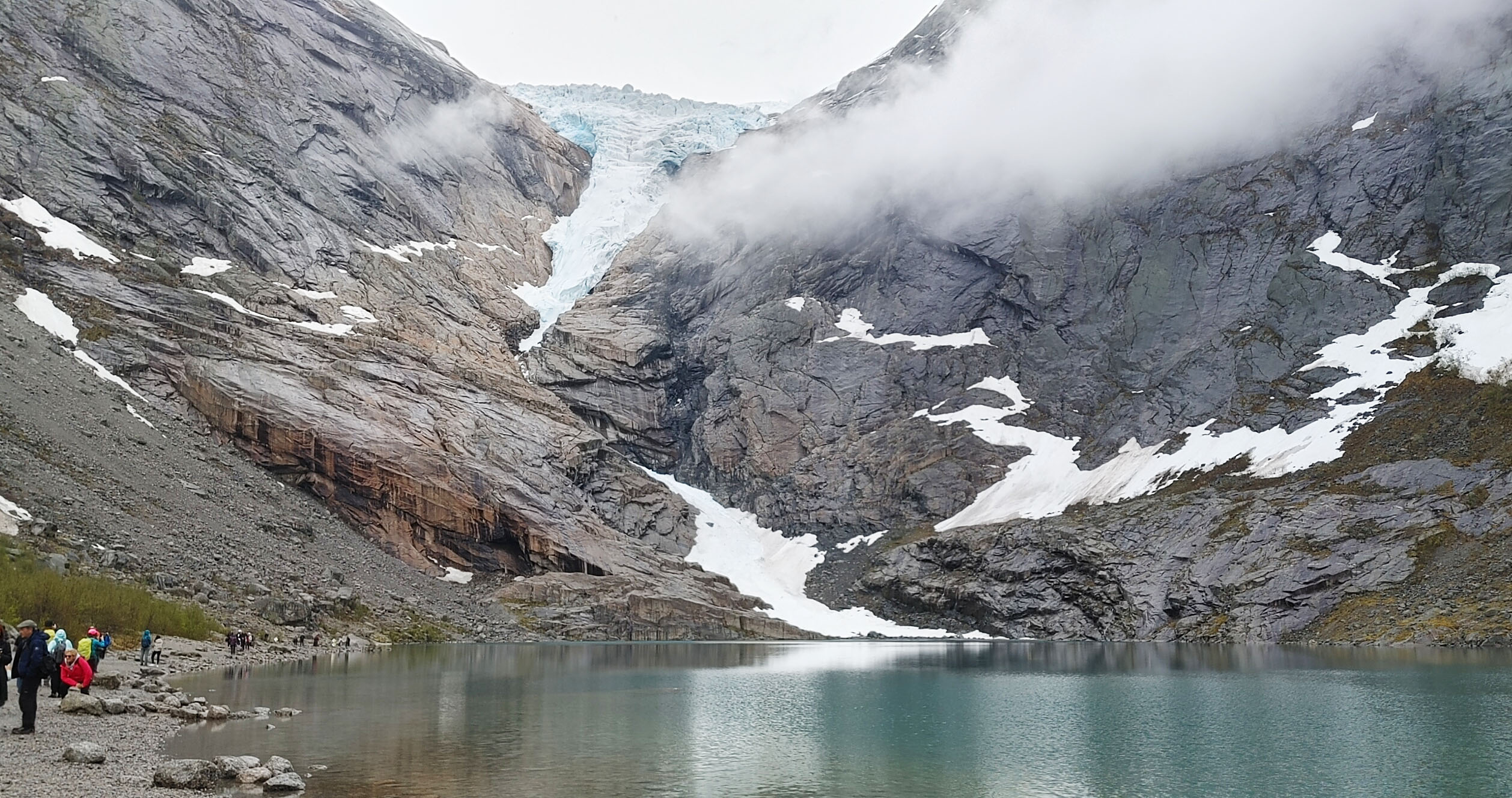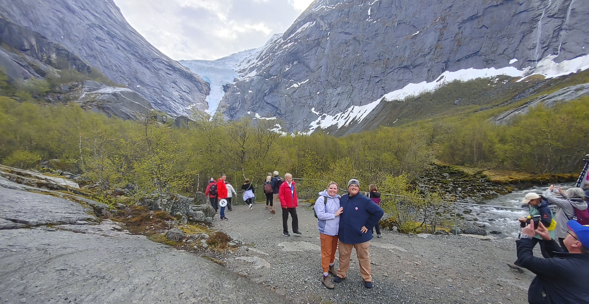 Norwegians have a saying “There is no Bad Weather, Just Bad Clothing”. Good clothing for this day included a raincoat and a umbrella as we got light rain off and on during the hike. Even so, we were treated to the beautiful scenery of the gorge carved out by the glacier over thousands for year, multiple waterfalls and a beautiful lake at the top of the hill below the glacier. The water in the lake is said to be so pure that you can fill up your water bottle and drink it straight. I could not confirm that in any of my research, but several folks in our group did this and didn’t get sick. It was pretty overcast for most of our journey, but you can see that even in the rain and clouds, the scenery was well worth the journey.