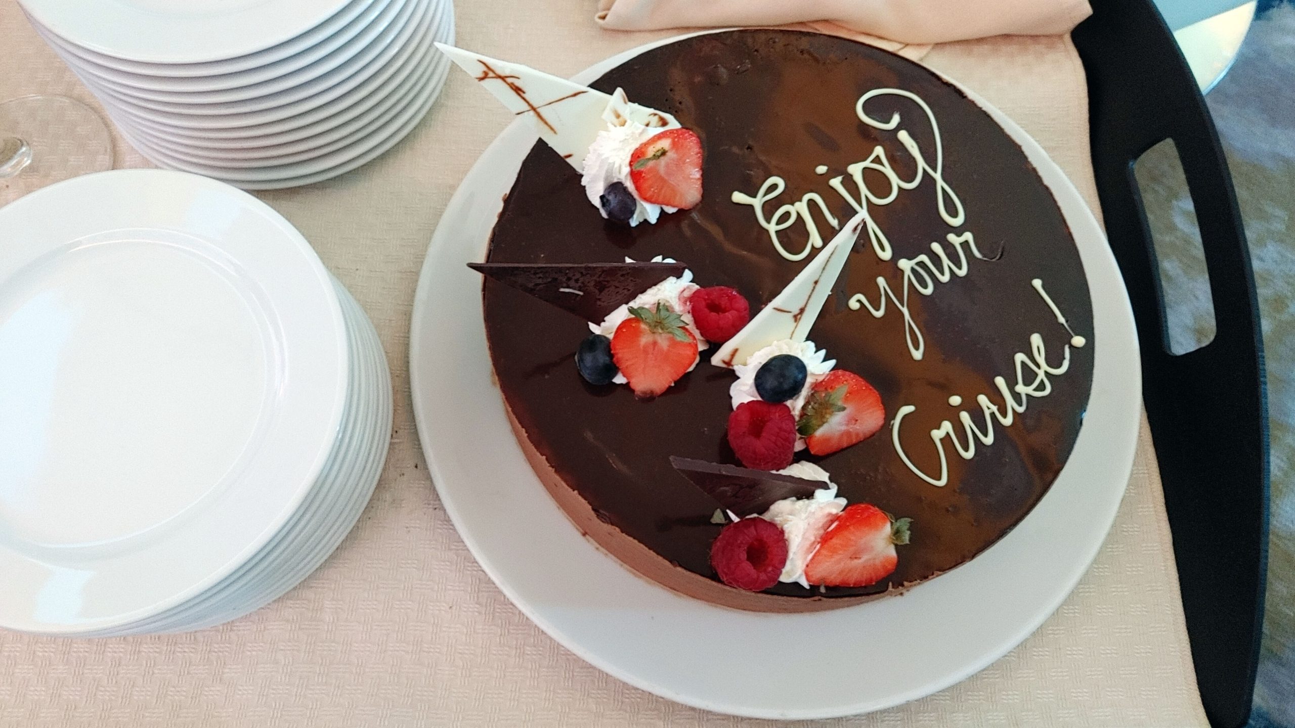 We had our meeting with the onboard event planner and the cellar master to make sure that our wine events were all going as planned. We had to work out one final time and dates for our second wine tasting but this was easily done. We wanted some place with views as it was during our sail away from Olden, and they were able to schedule us from 4:00 to 5:00 in the aft facing Tuscan grill