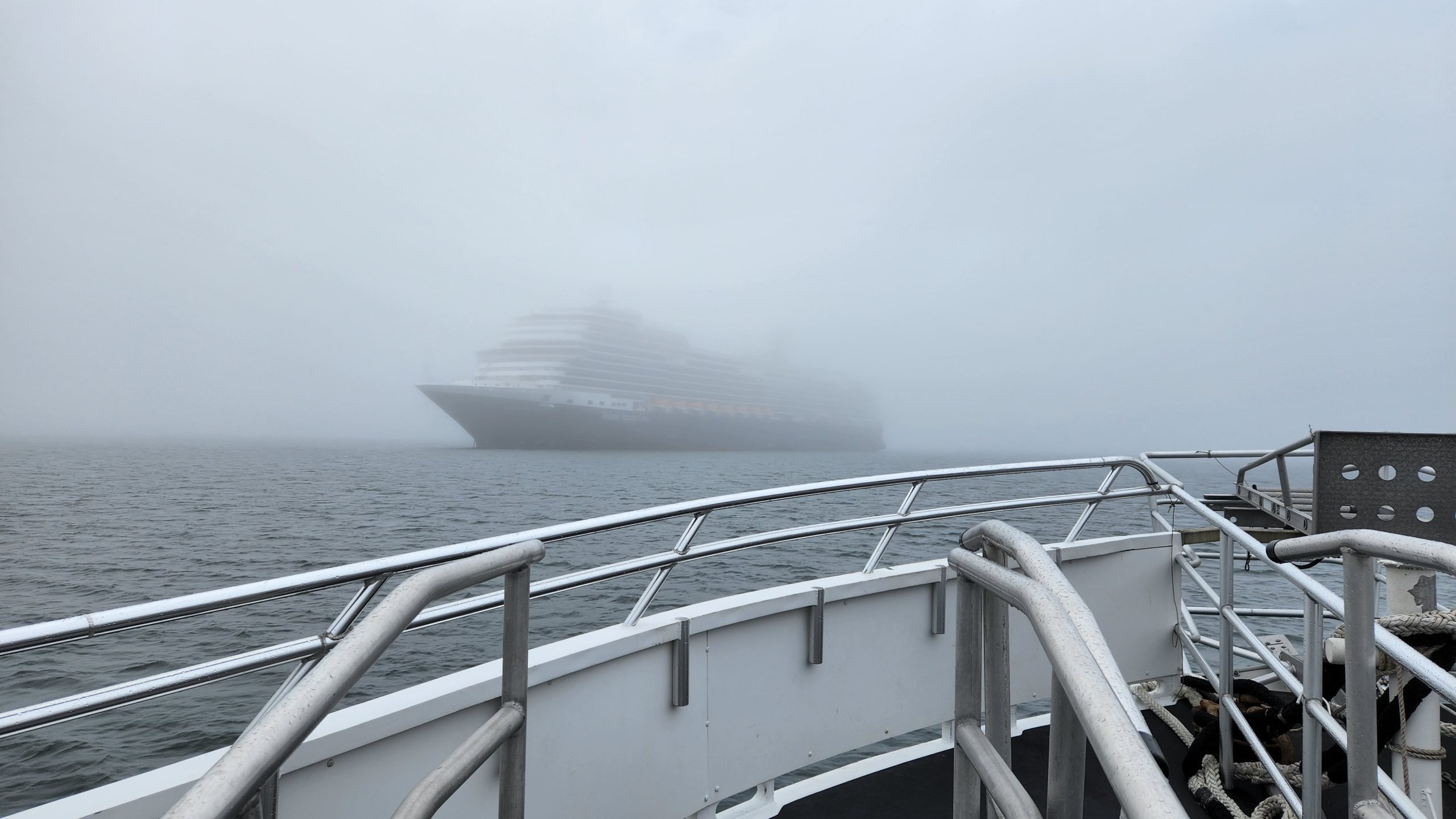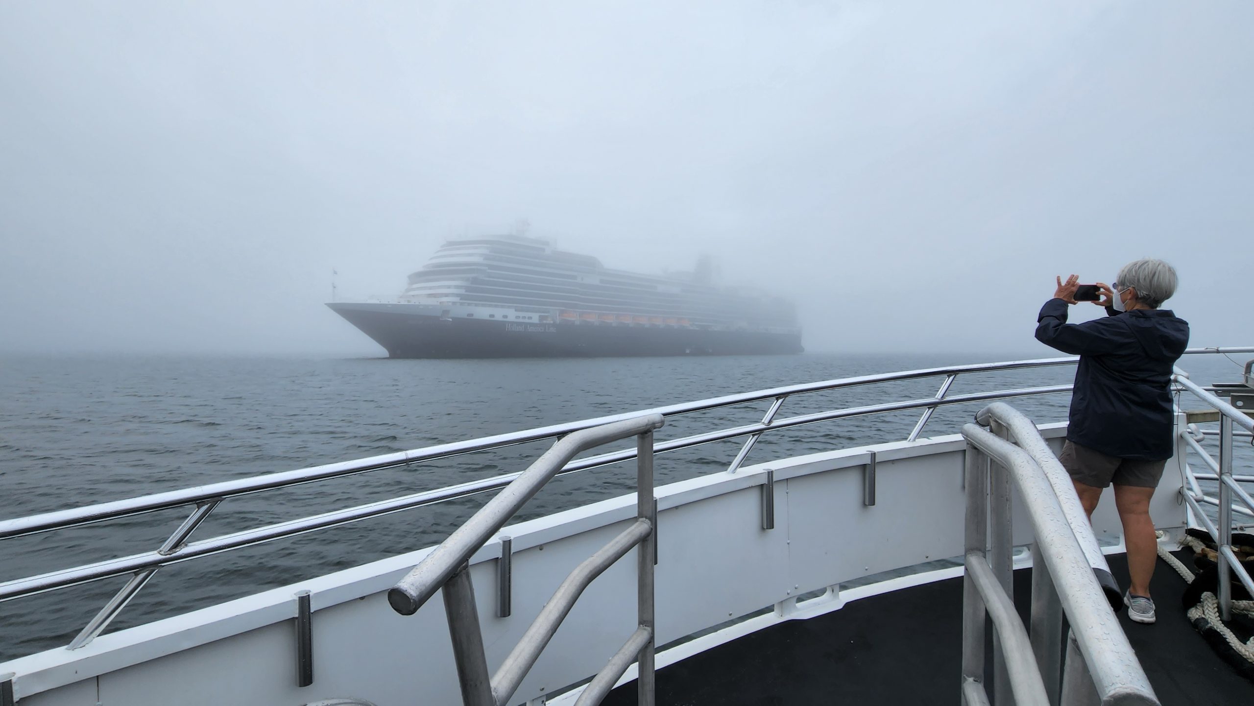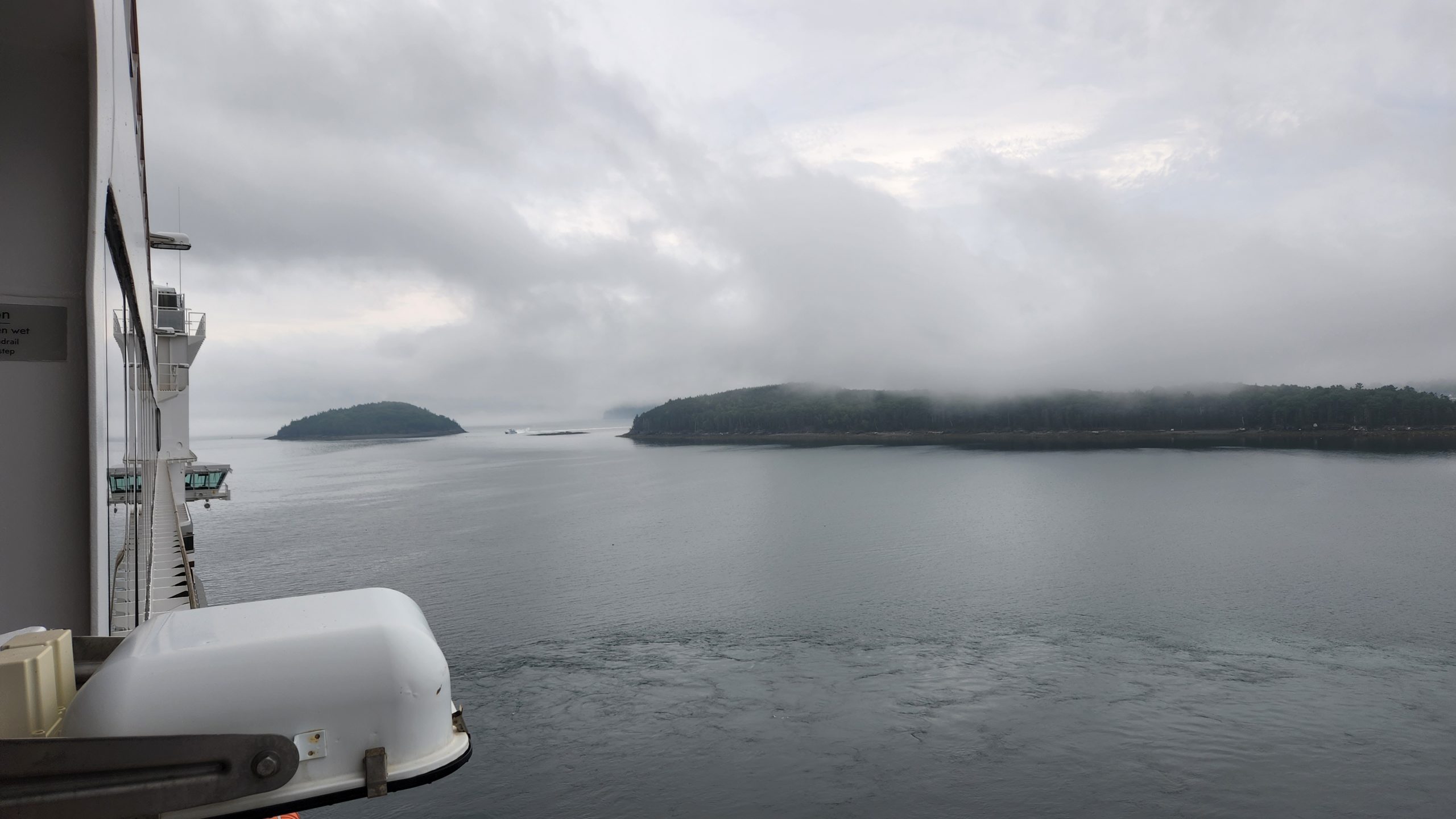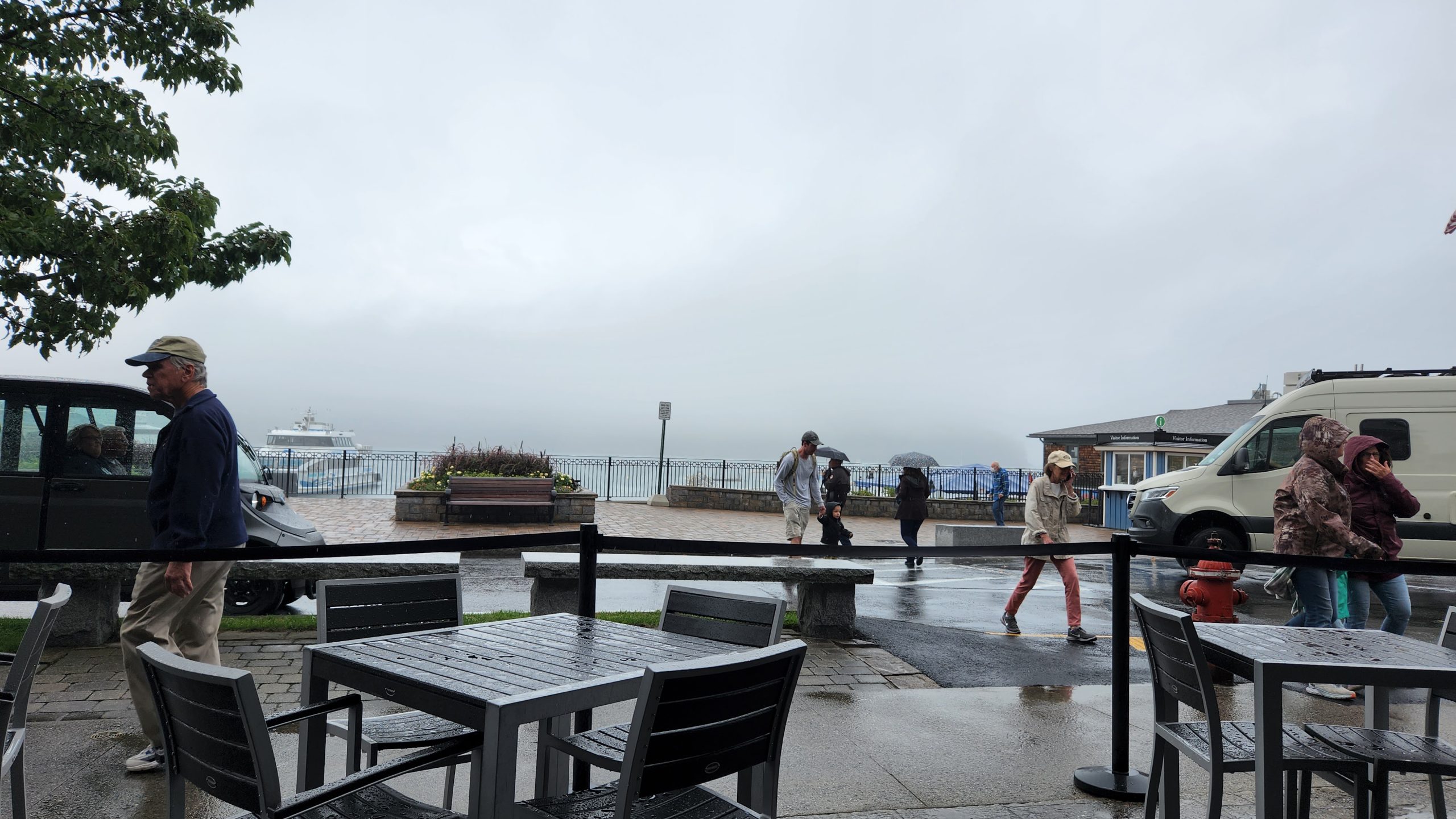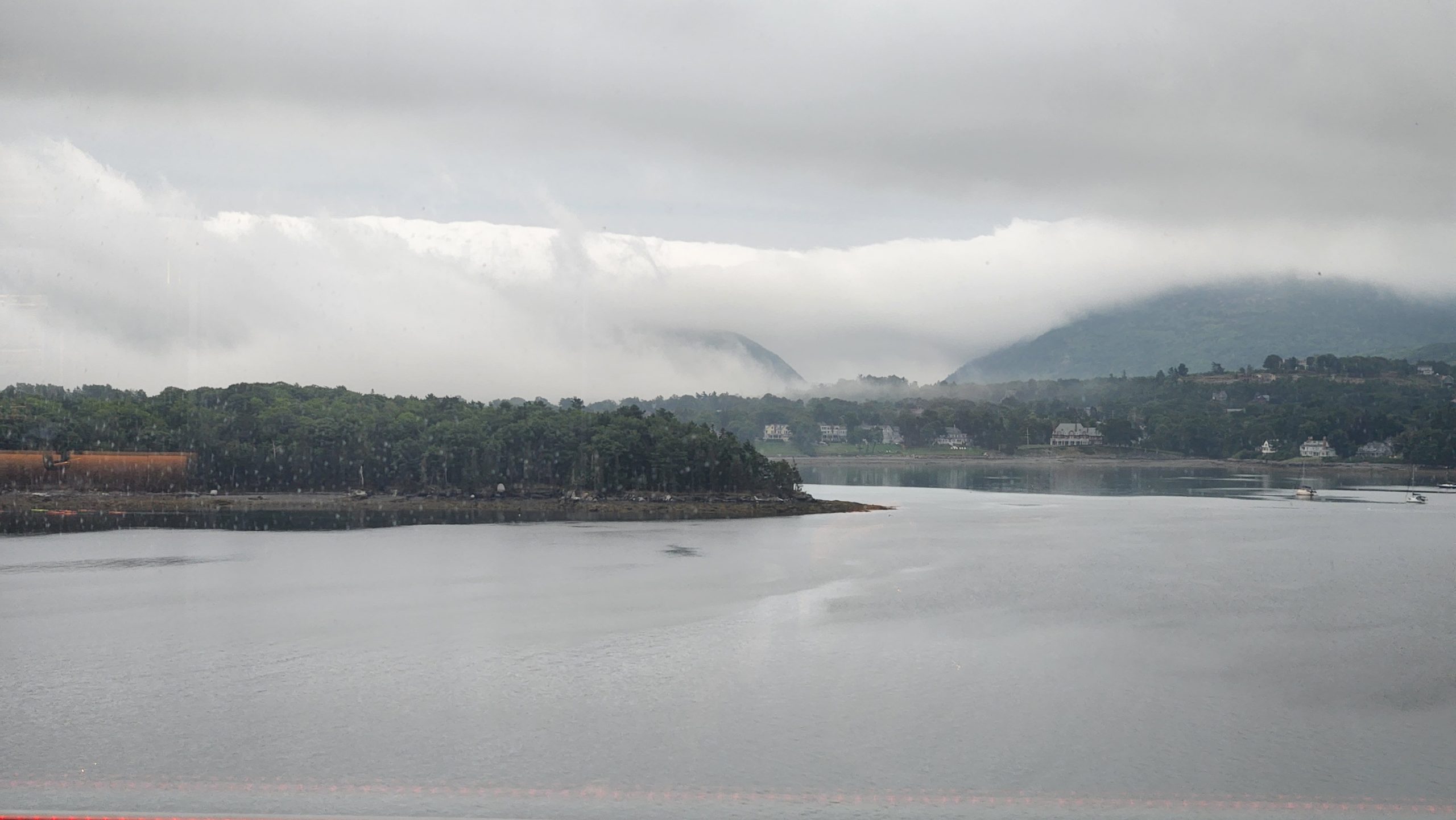 While Bar Harbor is a lovely place, I have to say the weather was not so good during our visit. However we made the most of it with a little walk around town, purchases in the gift shops and then a lobster lunch. The back to the ship in the fog.