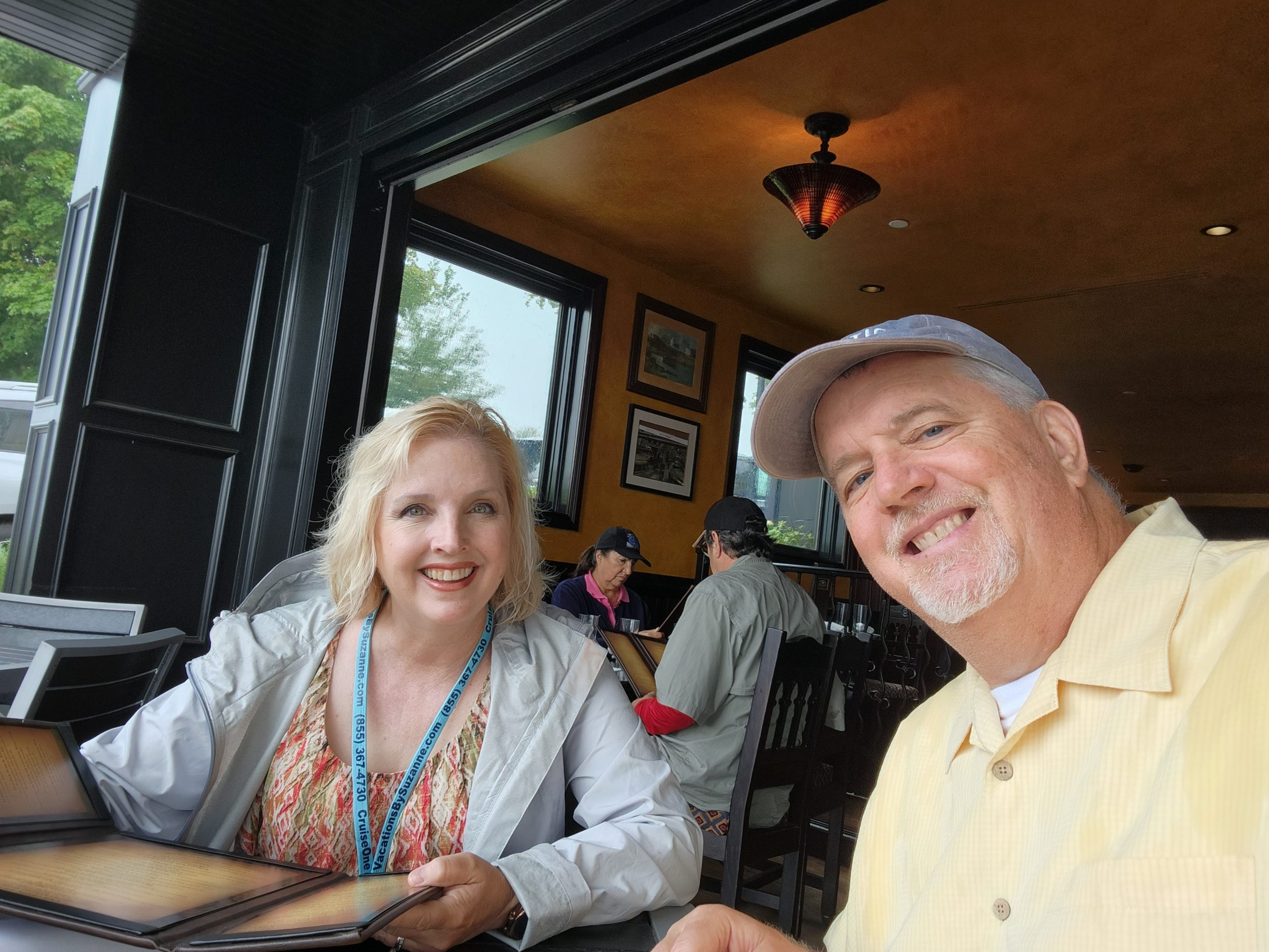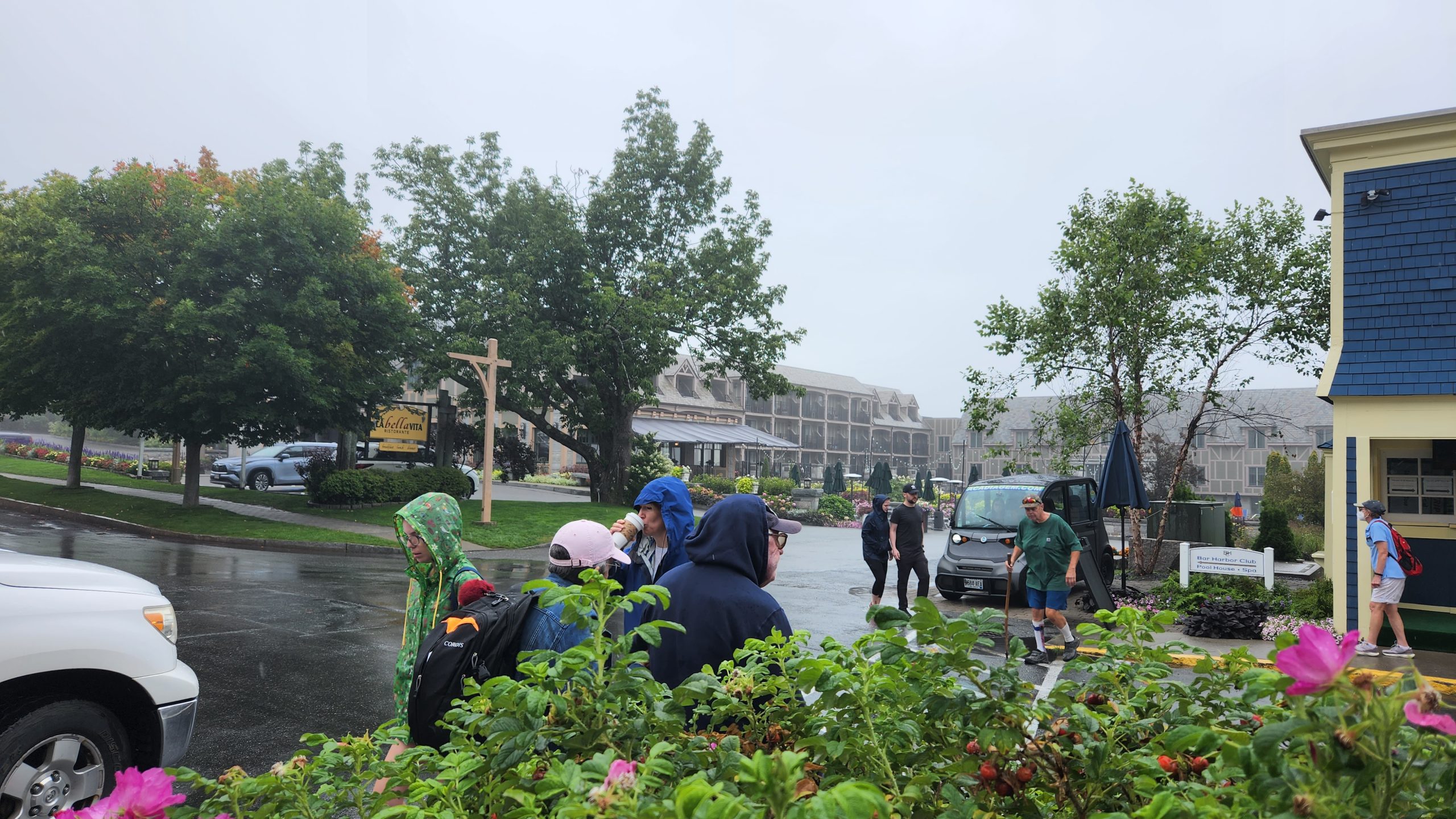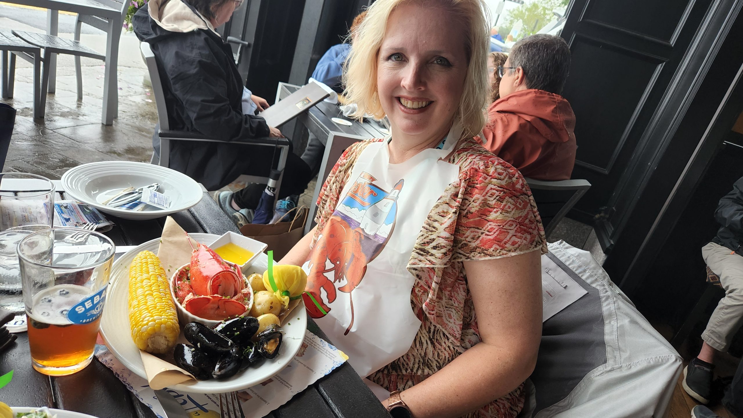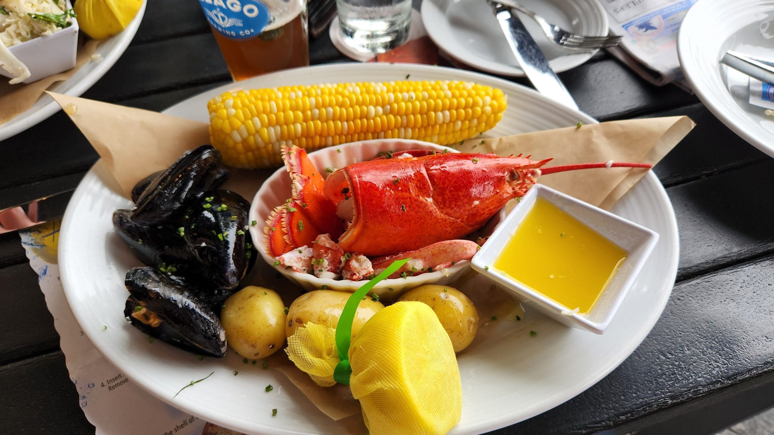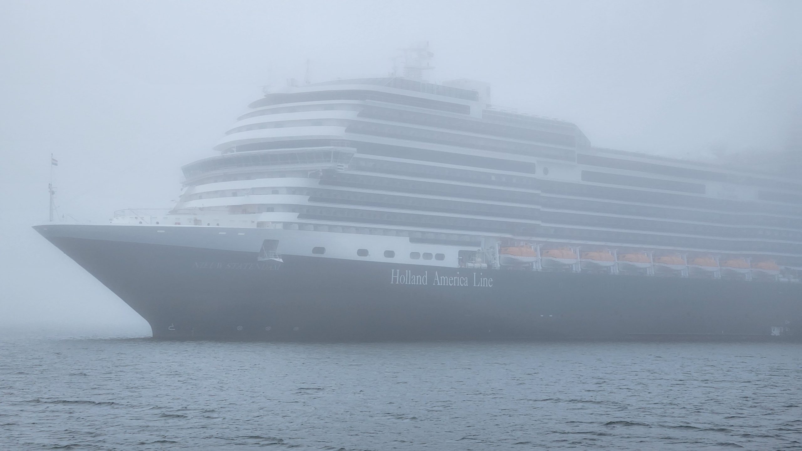While Bar Harbor is a lovely place, I have to say the weather was not so good during our visit. However we made the most of it with a little walk around town, purchases in the gift shops and then a lobster lunch. The back to the ship in the fog.