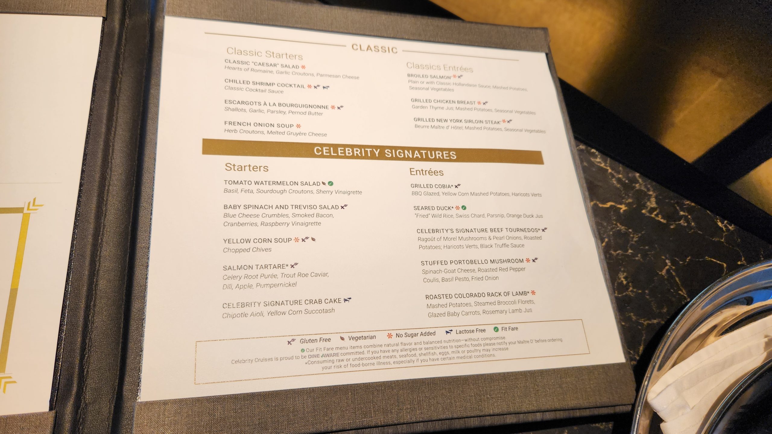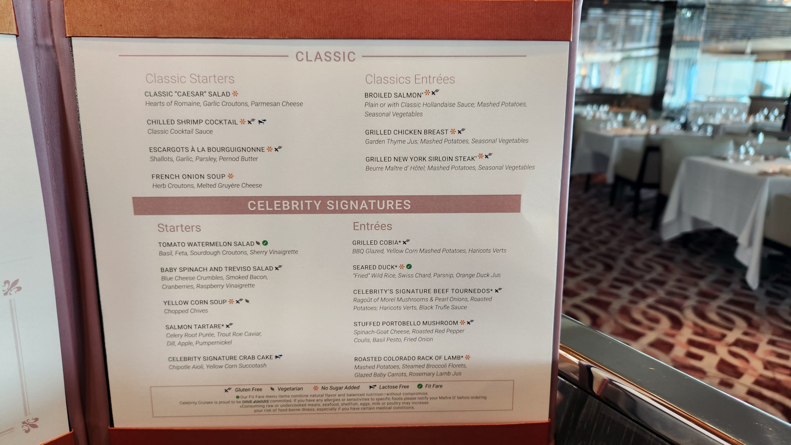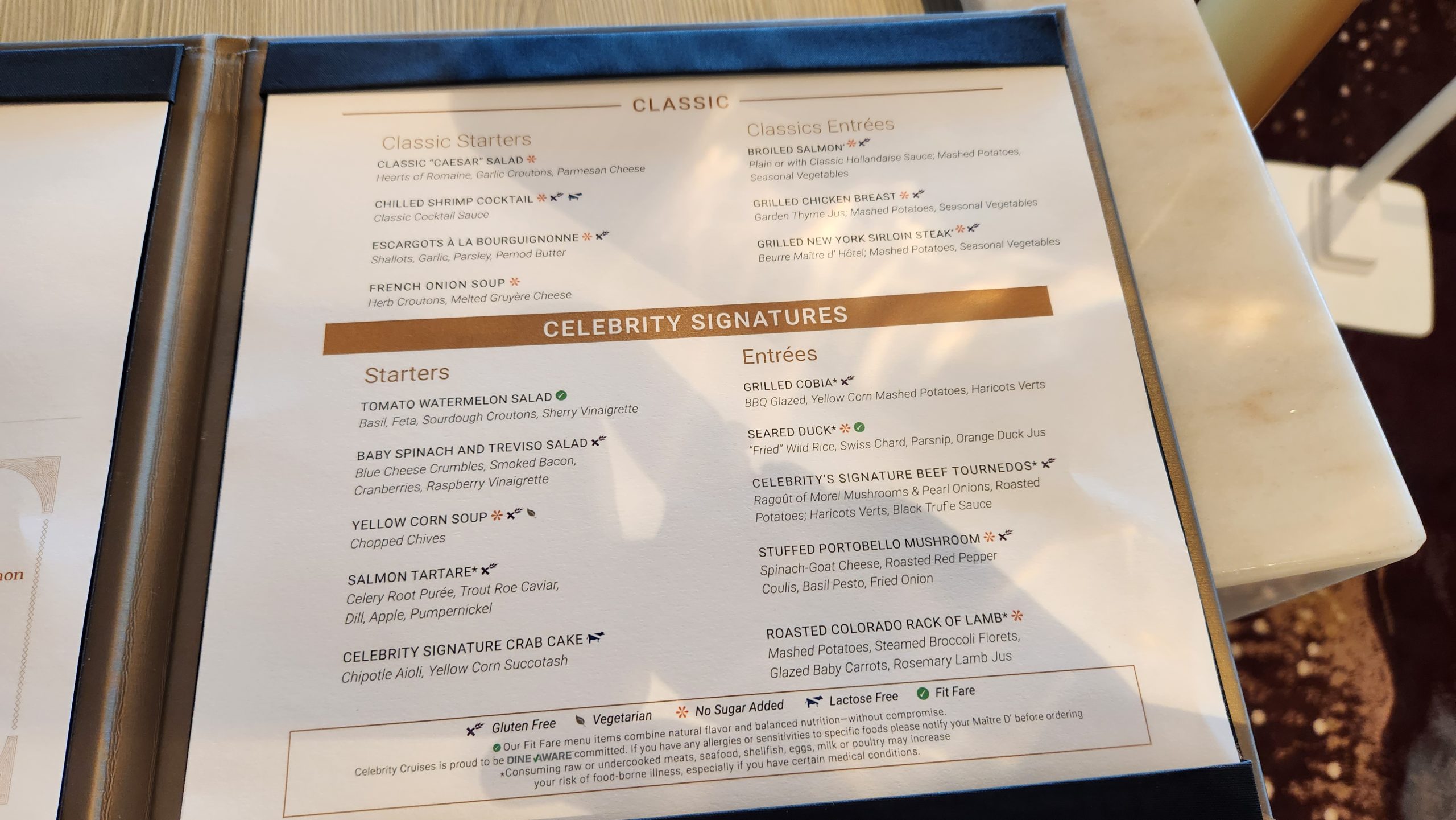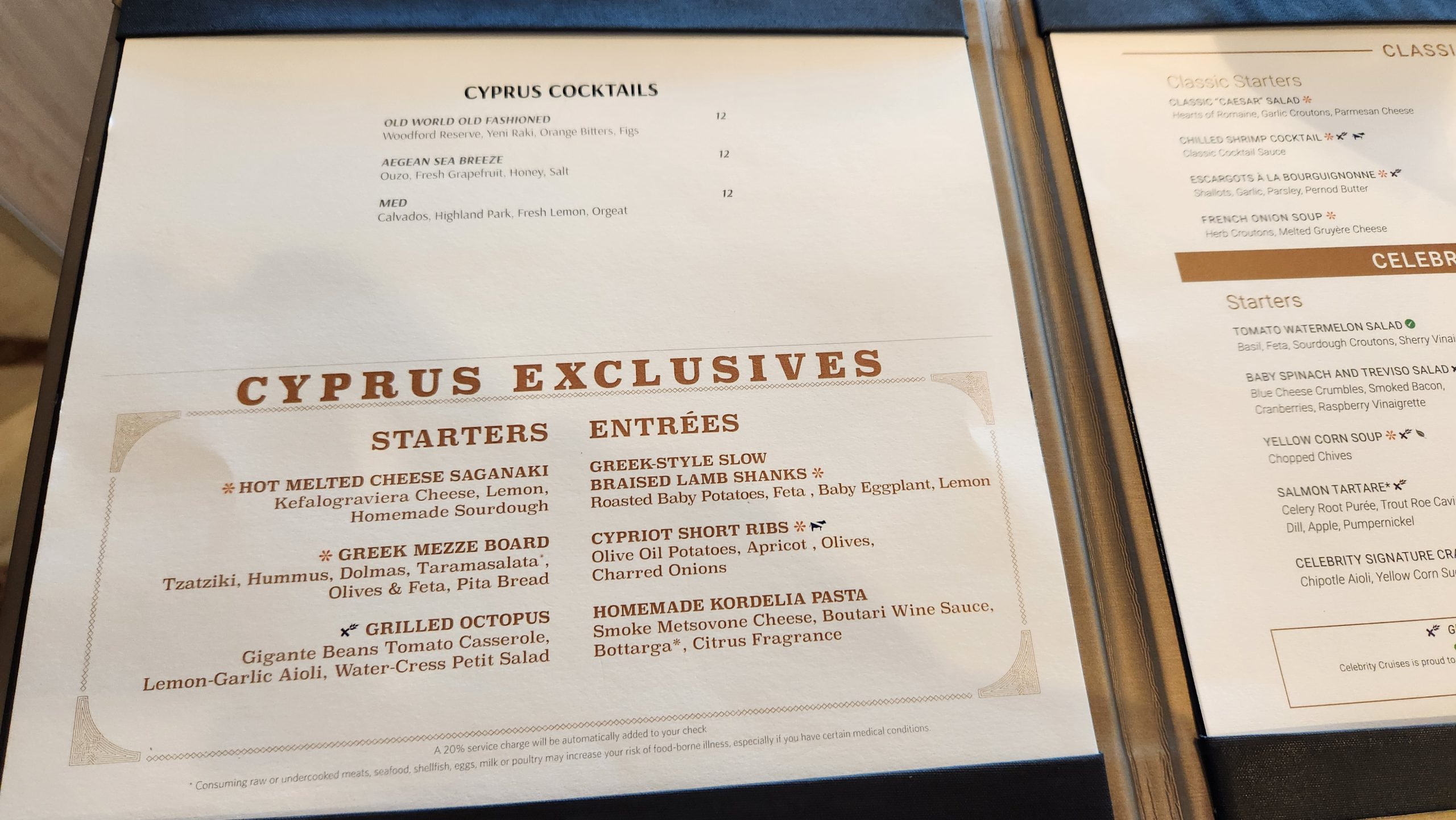 For standard dining there are 4 different venues that each have their own themed specialties and the standard rotating menu. Cosmopolitan, Cyprus, Tuscan and Normandie! We had a chance to dine at all three of these venues in their original home on the Celebrity Edge a few weeks later. The food in all them was outstanding!