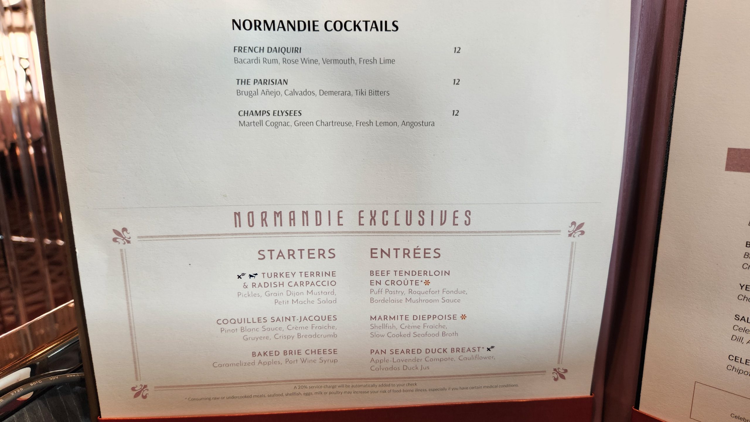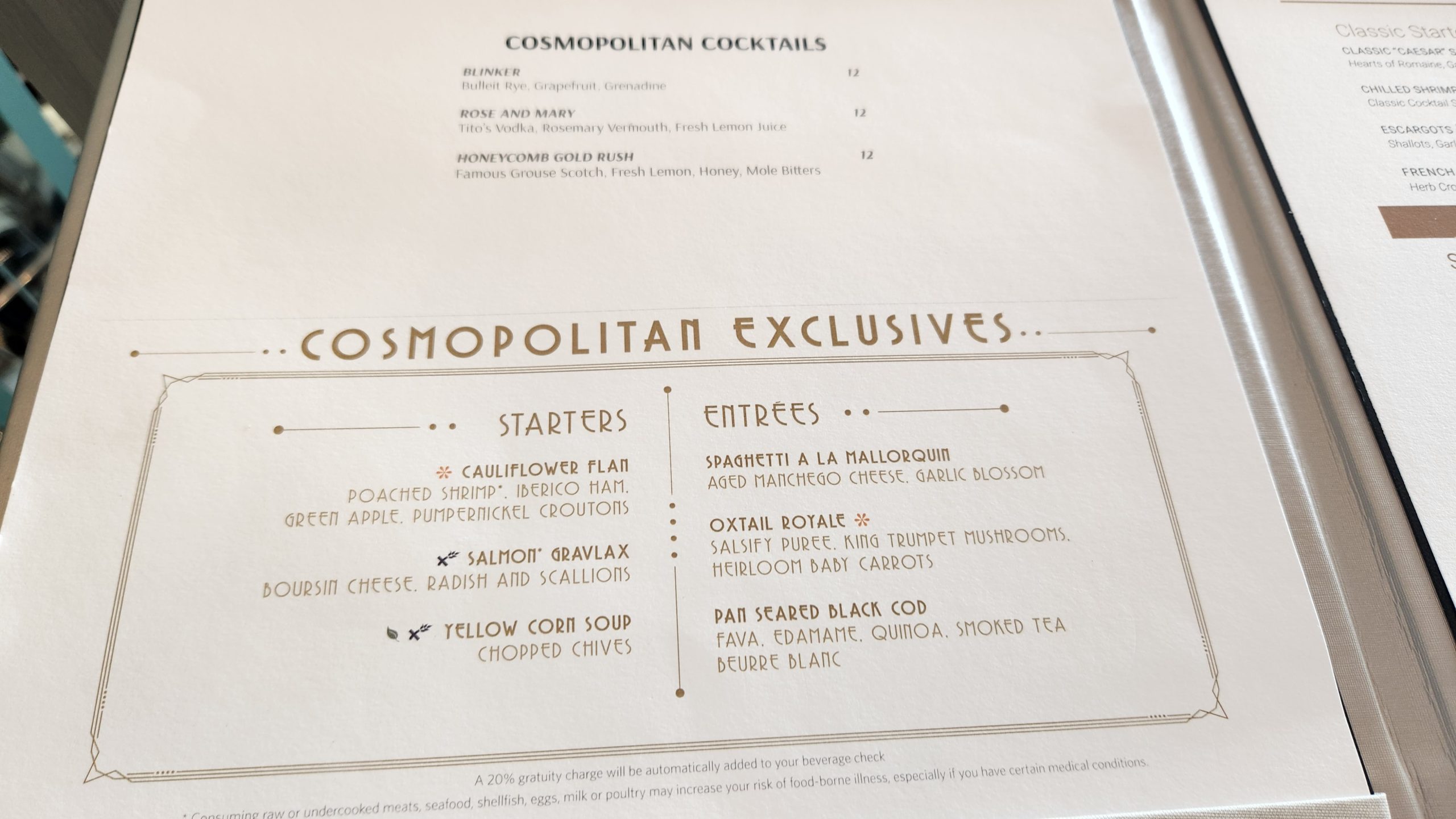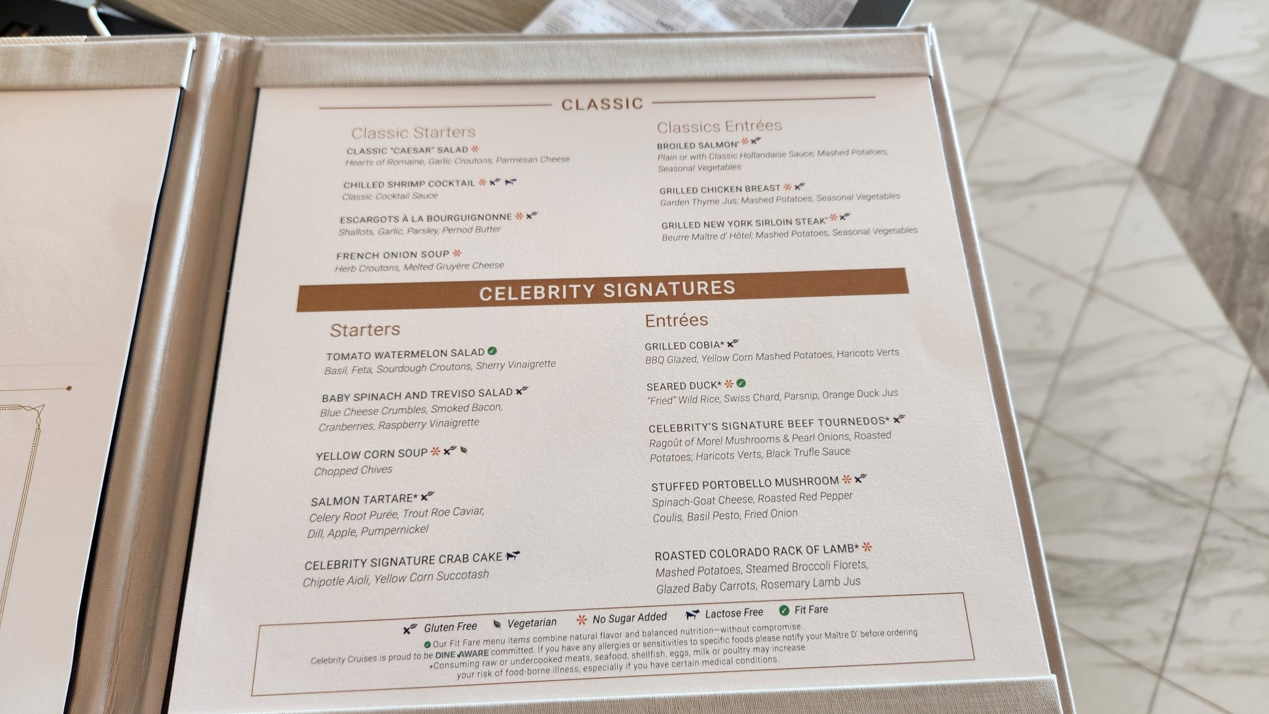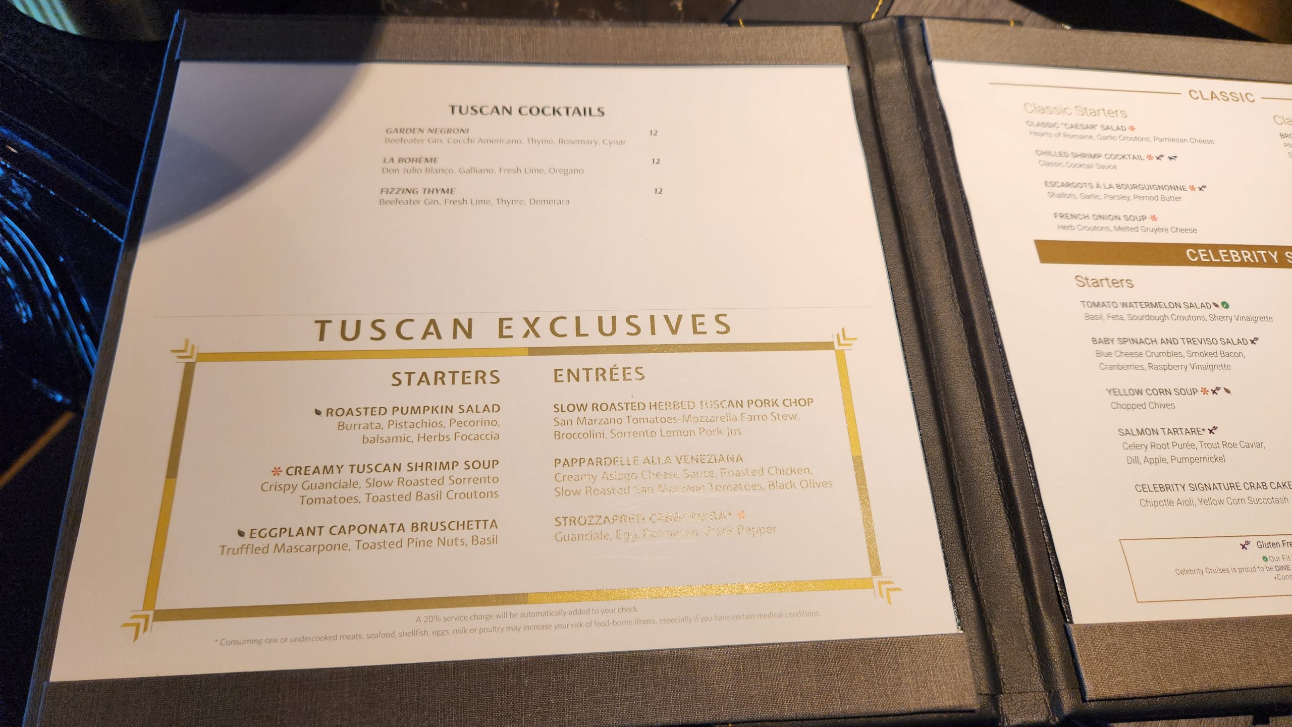 For standard dining there are 4 different venues that each have their own themed specialties and the standard rotating menu. Cosmopolitan, Cyprus, Tuscan and Normandie! We had a chance to dine at all three of these venues in their original home on the Celebrity Edge a few weeks later. The food in all them was outstanding!