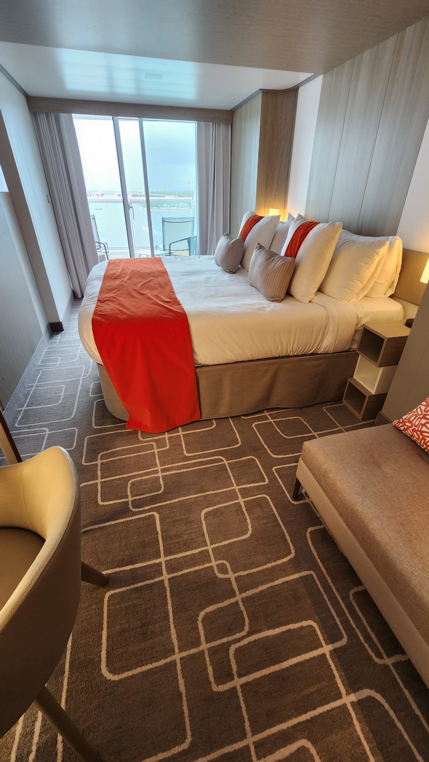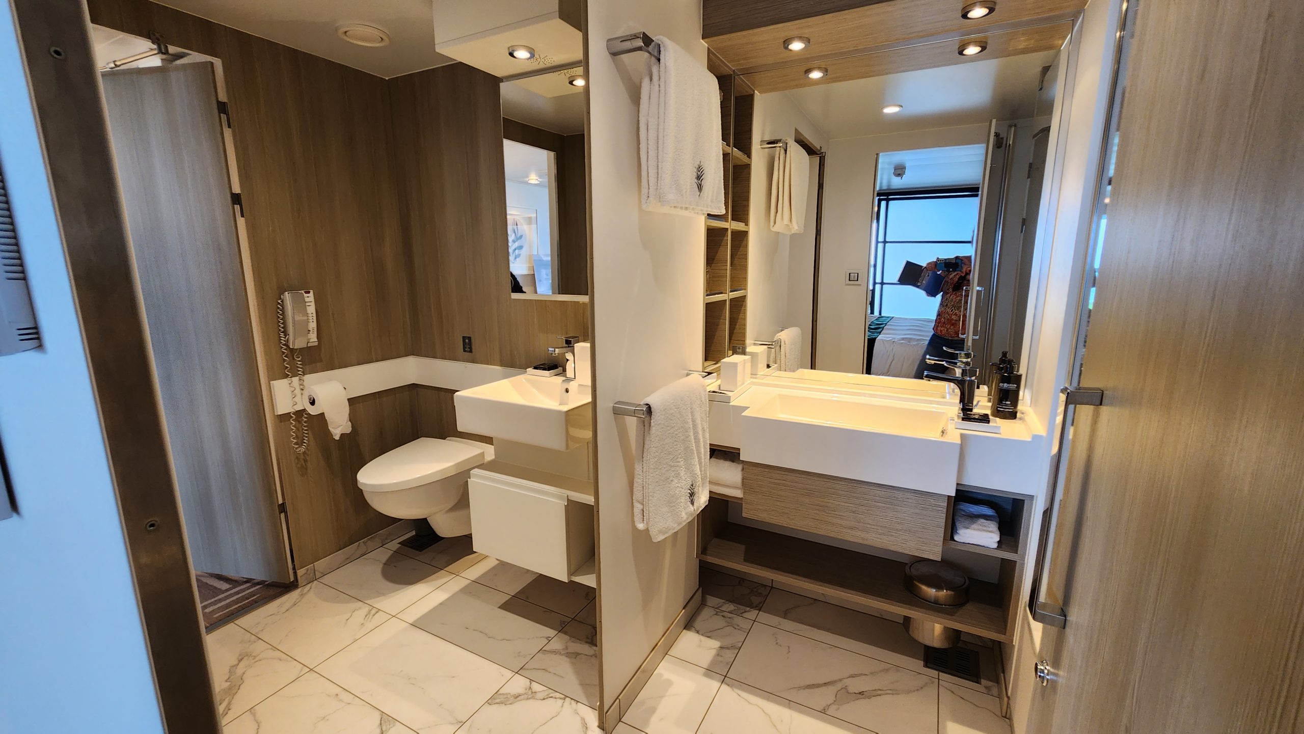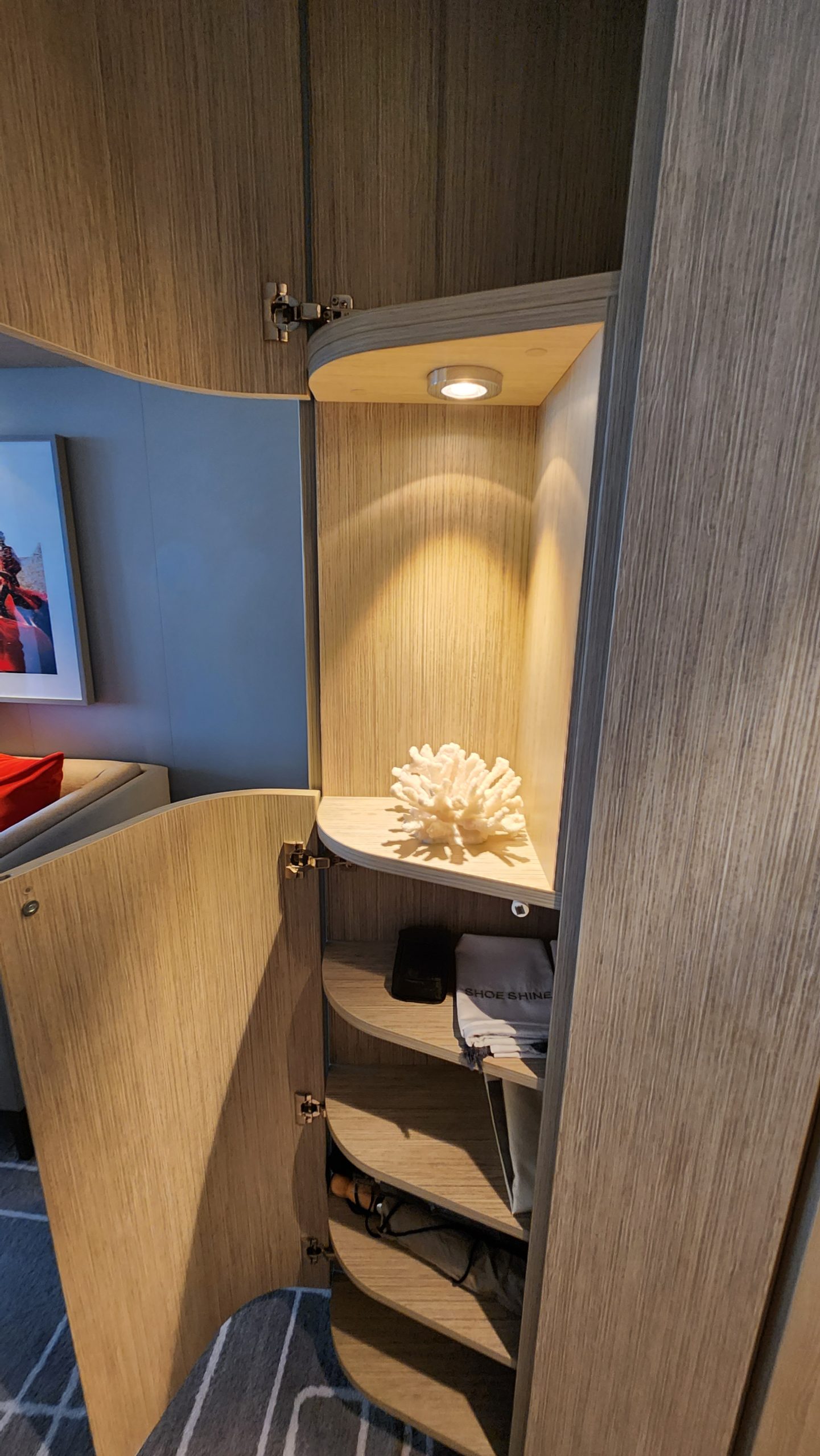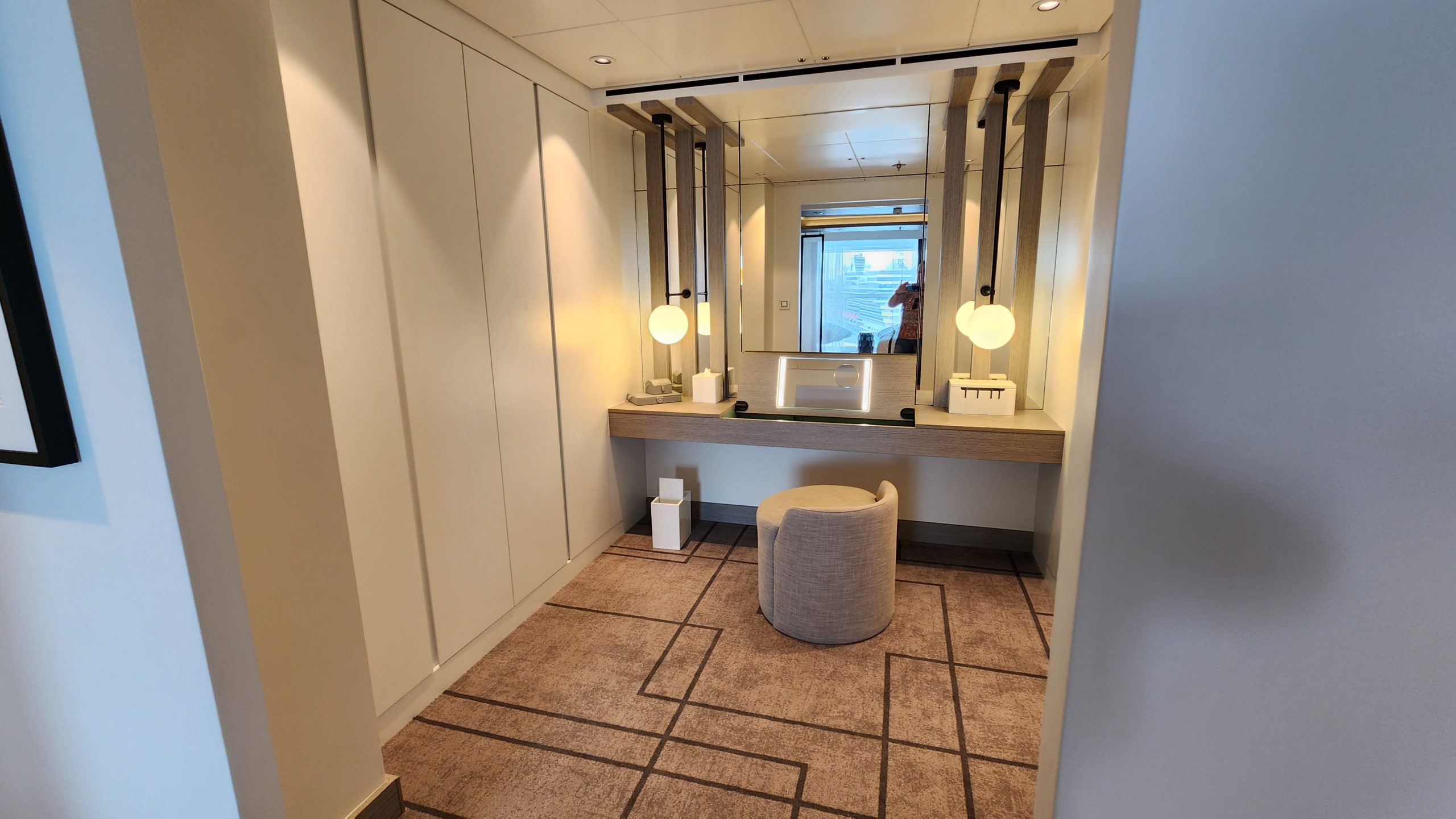 The Infinite Veranda is a balcony cabin with convertible indoor-outdoor space. We actually sailed on one of these on the Edge a few weeks later. There are many pros and cons of this design, but I actually loved having the flex space which could be indoors or out. There were a few things I didn’t like: having to hold the button the entire time while the window and blinds opened and closed was the main thing and the inability to slip out on the balcony and keep the blinds closed while my husband slept. There were a few things I was neutral about, for example it did not bother me that the ship had to close the window in rainy weather. I can’t imagine wanting to be on a traditional open balcony in the rain anyway. Also the rail height is the same height as a traditional balcony rail, so I don’t understand the complaint about that. What I really really loved about the infinite veranda concept is on a day when there is cooler weather outside having the balcony extend all the way into the room. I loved working at my desk with the cool breeze and ocean sounds. Our room on the Edge was configured with the opposite layout, so my desk was by the balcony and the bed was by the bath. I also loved the large baths, with more storage space, and the shelving and drawer space, though we felt the hanging space in the closet was a little too small.
