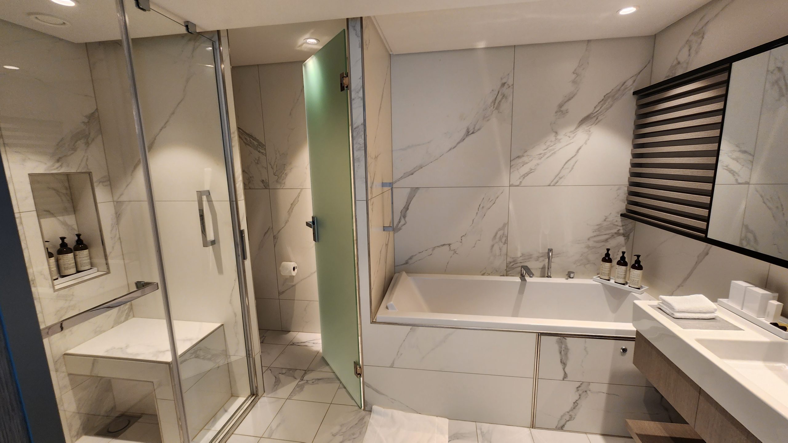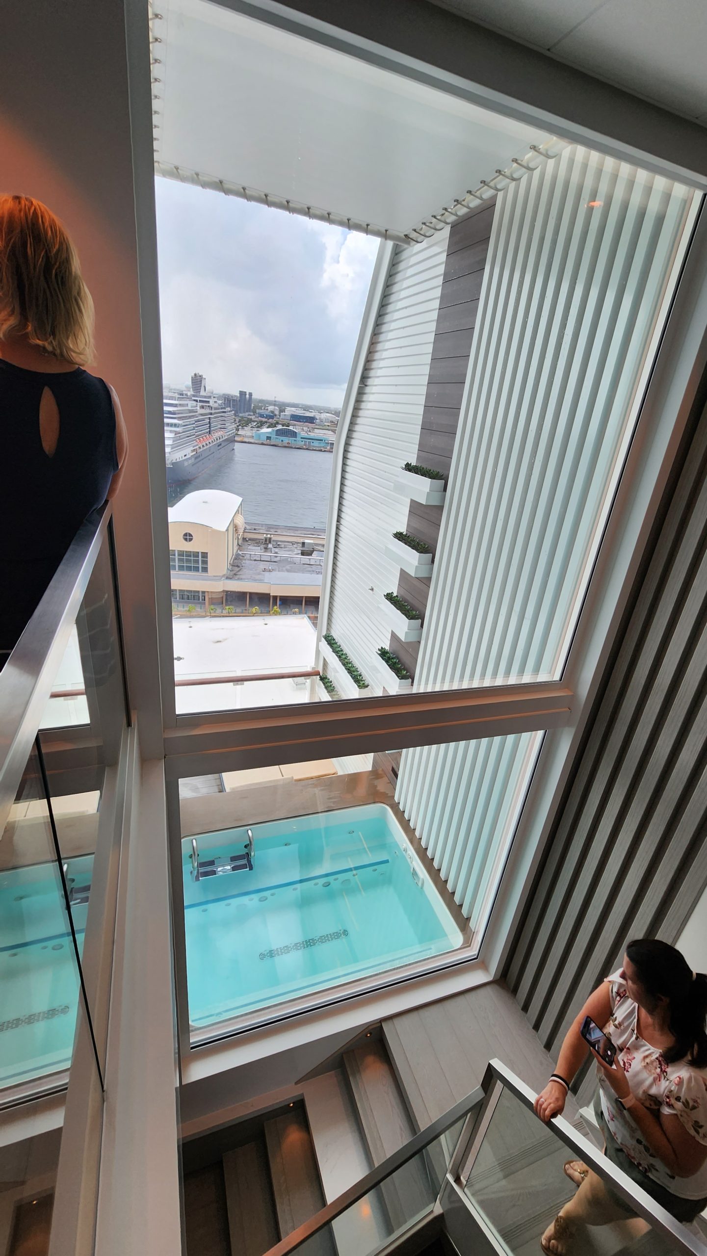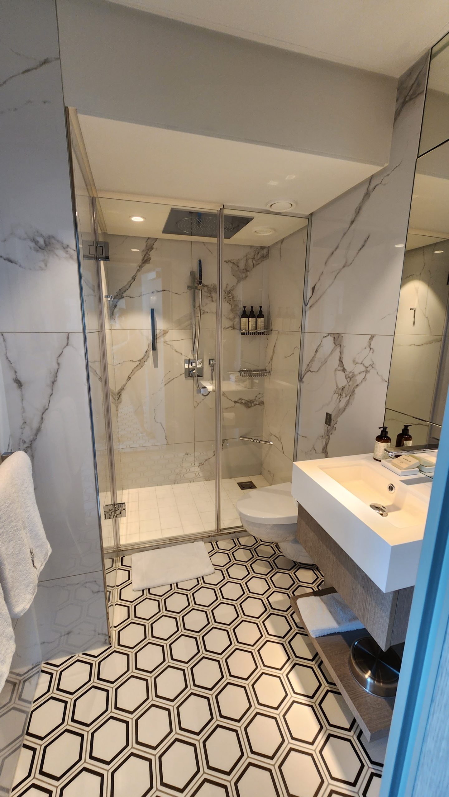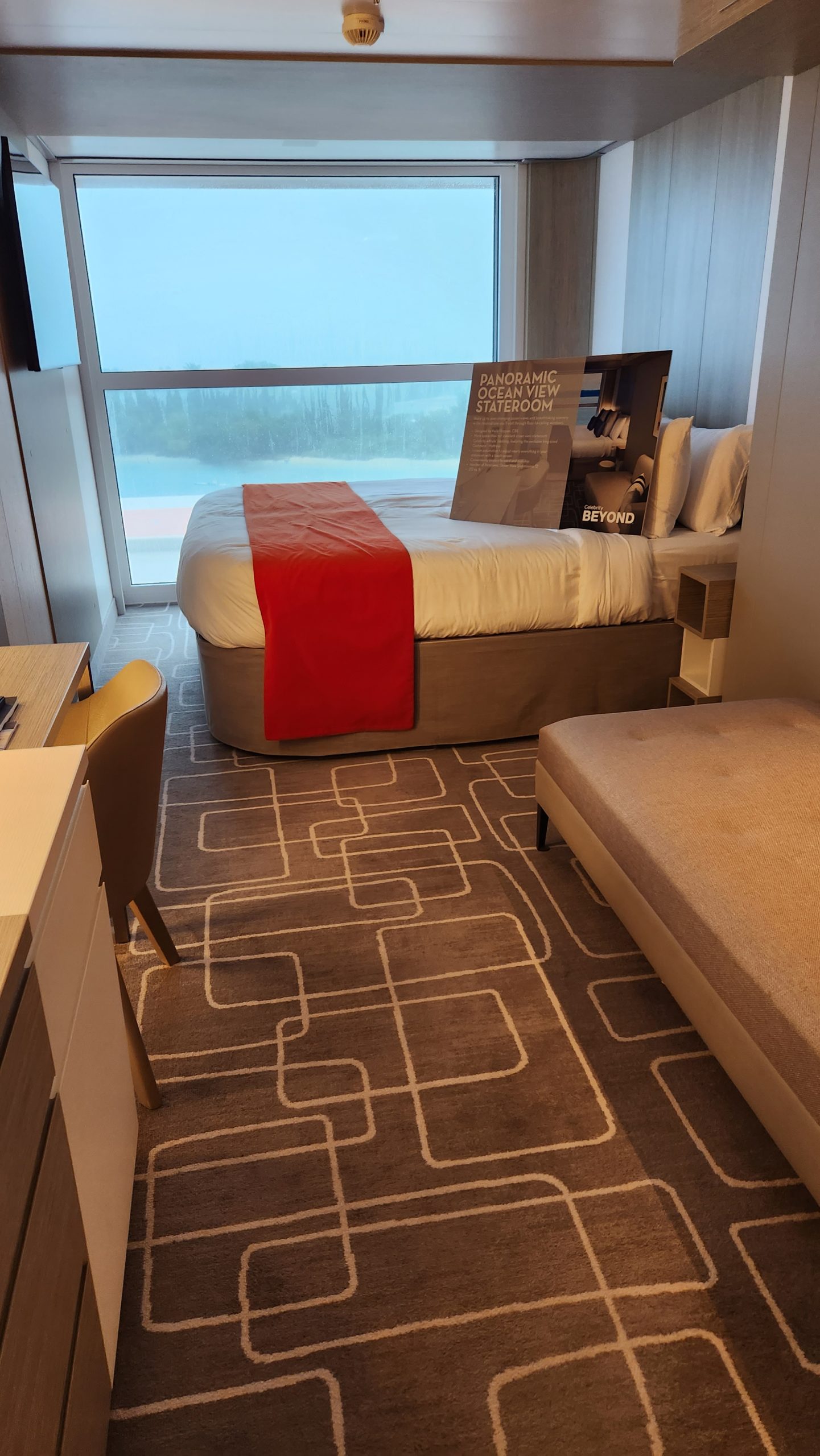The Infinite Veranda is a balcony cabin with convertible indoor-outdoor space. We actually sailed on one of these on the Edge a few weeks later. There are many pros and cons of this design, but I actually loved having the flex space which could be indoors or out. There were a few things I didn’t like: having to hold the button the entire time while the window and blinds opened and closed was the main thing and the inability to slip out on the balcony and keep the blinds closed while my husband slept. There were a few things I was neutral about, for example it did not bother me that the ship had to close the window in rainy weather. I can’t imagine wanting to be on a traditional open balcony in the rain anyway. Also the rail height is the same height as a traditional balcony rail, so I don’t understand the complaint about that. What I really really loved about the infinite veranda concept is on a day when there is cooler weather outside having the balcony extend all the way into the room. I loved working at my desk with the cool breeze and ocean sounds. Our room on the Edge was configured with the opposite layout, so my desk was by the balcony and the bed was by the bath. I also loved the large baths, with more storage space, and the shelving and drawer space, though we felt the hanging space in the closet was a little too small.