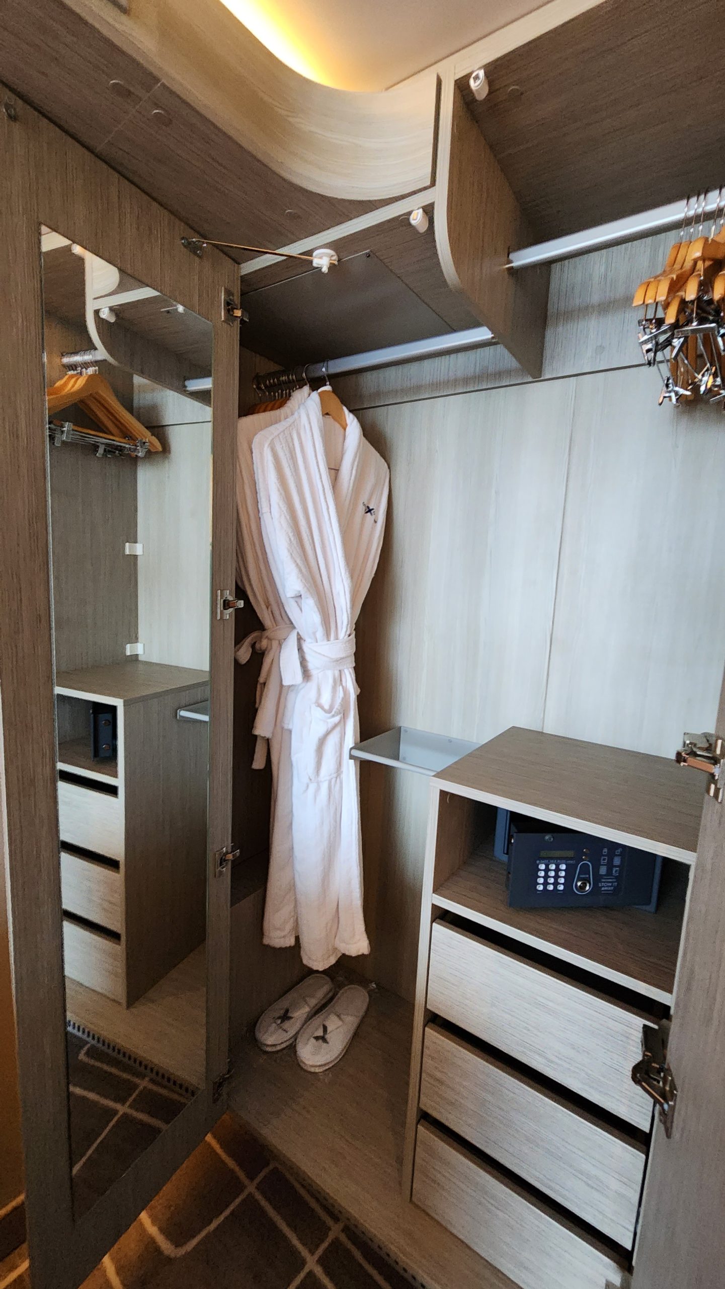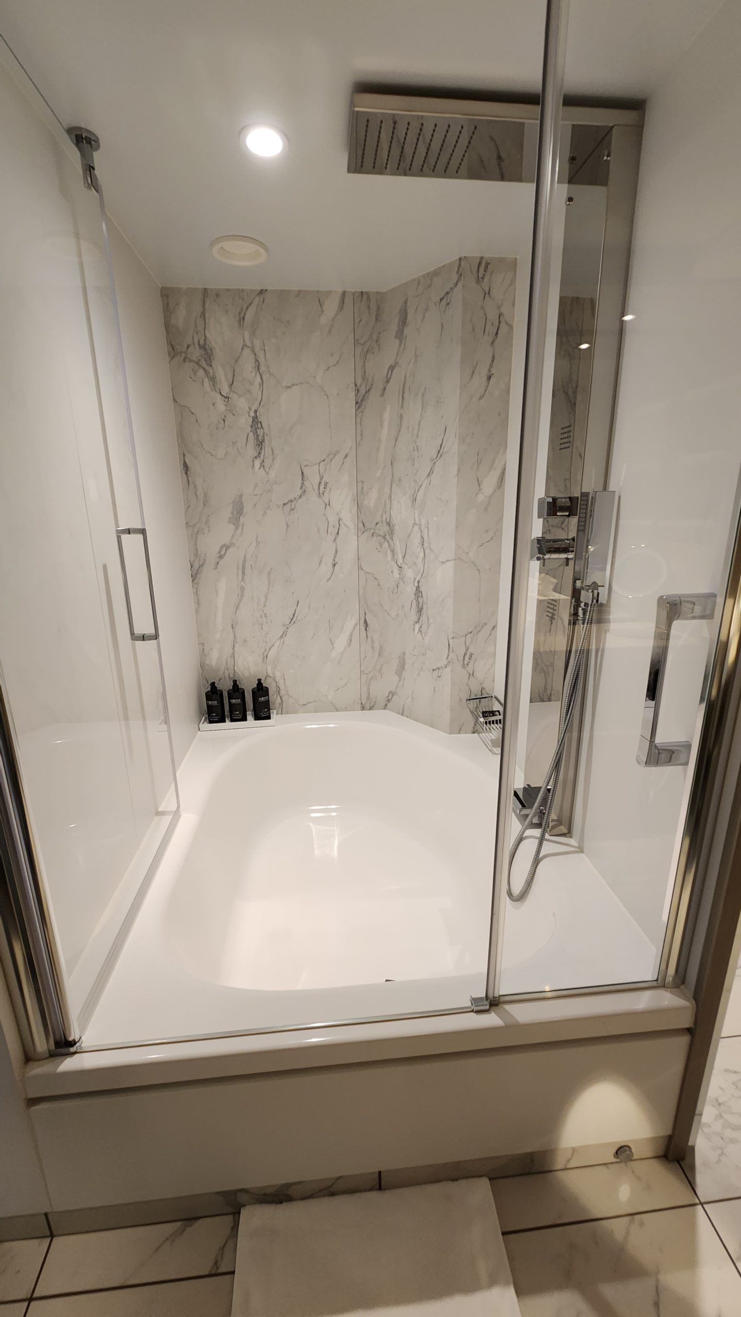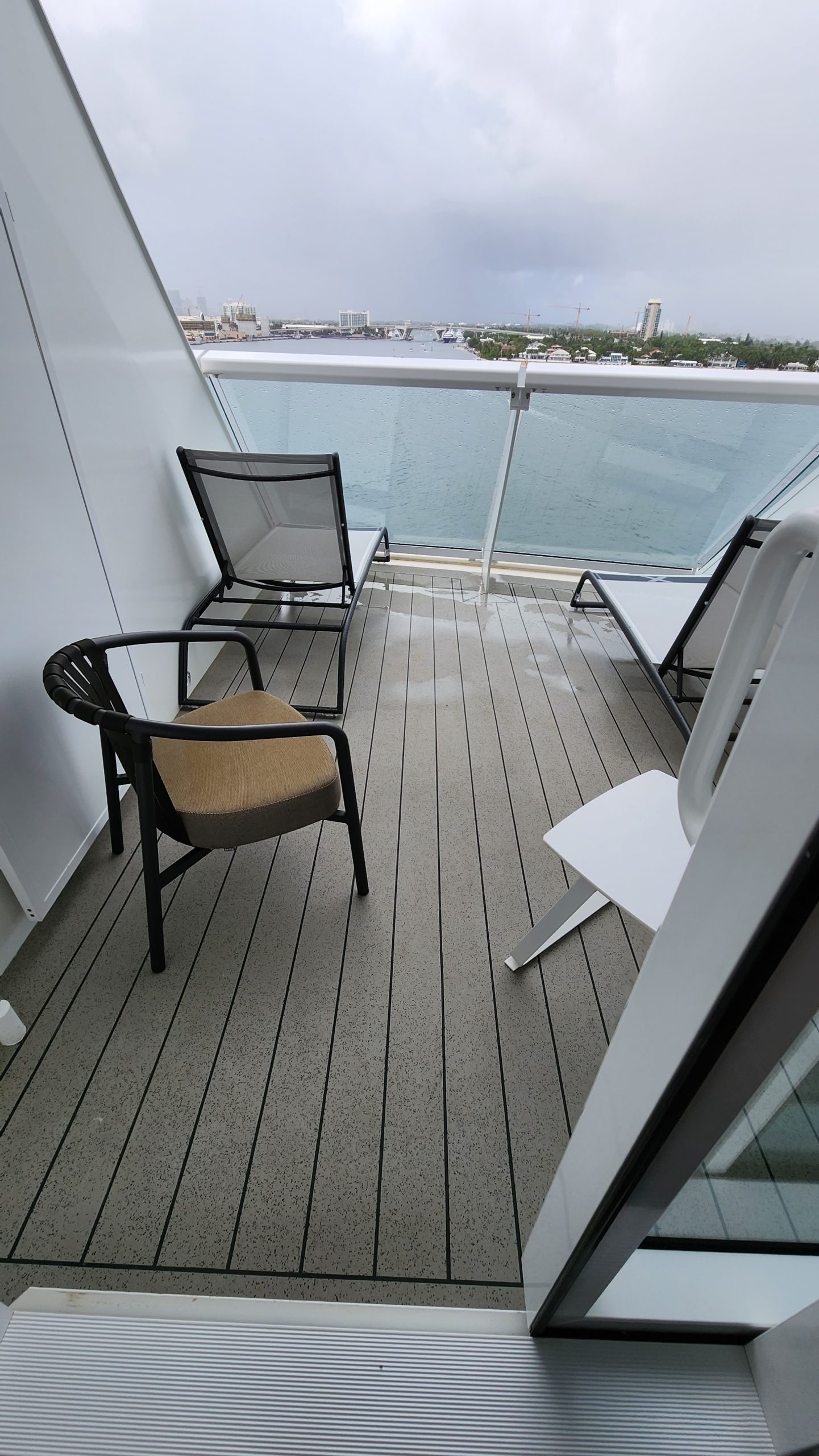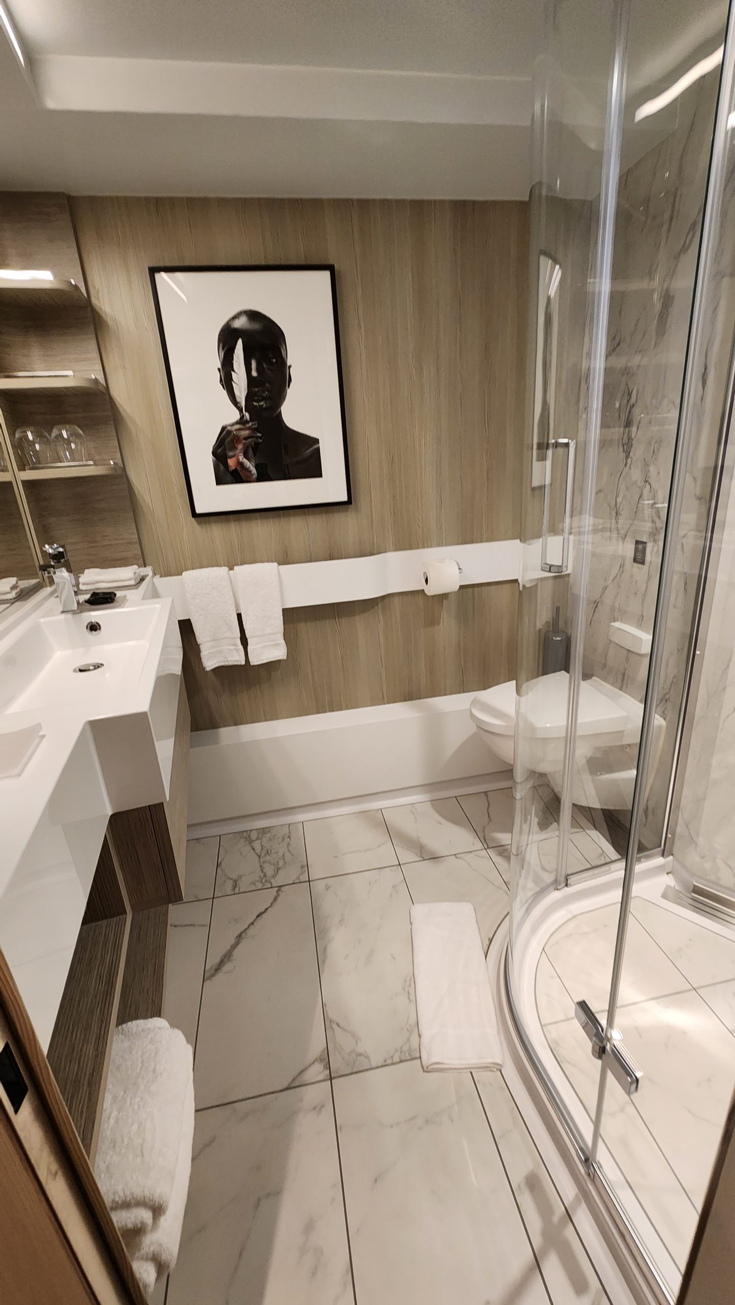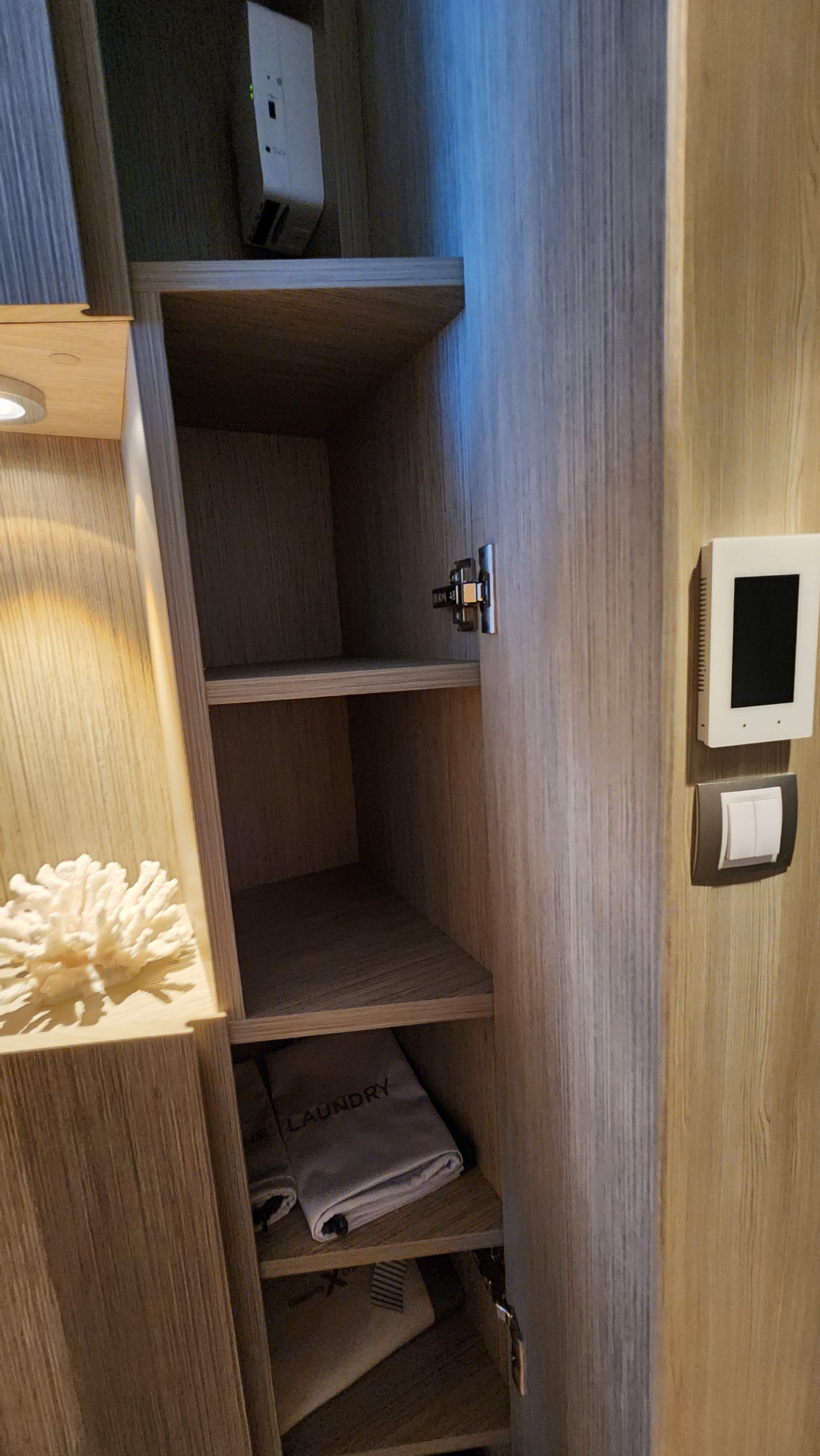 The Infinite Veranda is a balcony cabin with convertible indoor-outdoor space. We actually sailed on one of these on the Edge a few weeks later. There are many pros and cons of this design, but I actually loved having the flex space which could be indoors or out. There were a few things I didn’t like: having to hold the button the entire time while the window and blinds opened and closed was the main thing and the inability to slip out on the balcony and keep the blinds closed while my husband slept. There were a few things I was neutral about, for example it did not bother me that the ship had to close the window in rainy weather. I can’t imagine wanting to be on a traditional open balcony in the rain anyway. Also the rail height is the same height as a traditional balcony rail, so I don’t understand the complaint about that. What I really really loved about the infinite veranda concept is on a day when there is cooler weather outside having the balcony extend all the way into the room. I loved working at my desk with the cool breeze and ocean sounds. Our room on the Edge was configured with the opposite layout, so my desk was by the balcony and the bed was by the bath. I also loved the large baths, with more storage space, and the shelving and drawer space, though we felt the hanging space in the closet was a little too small.