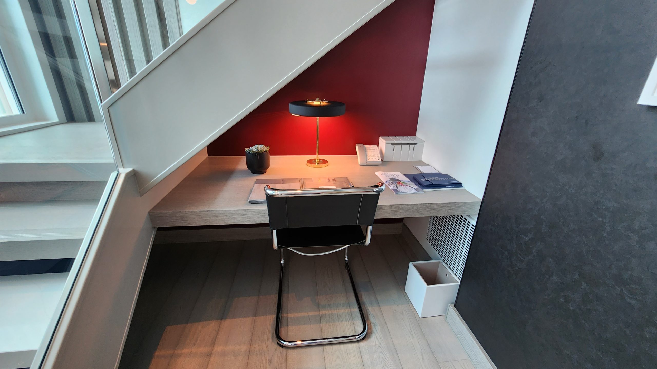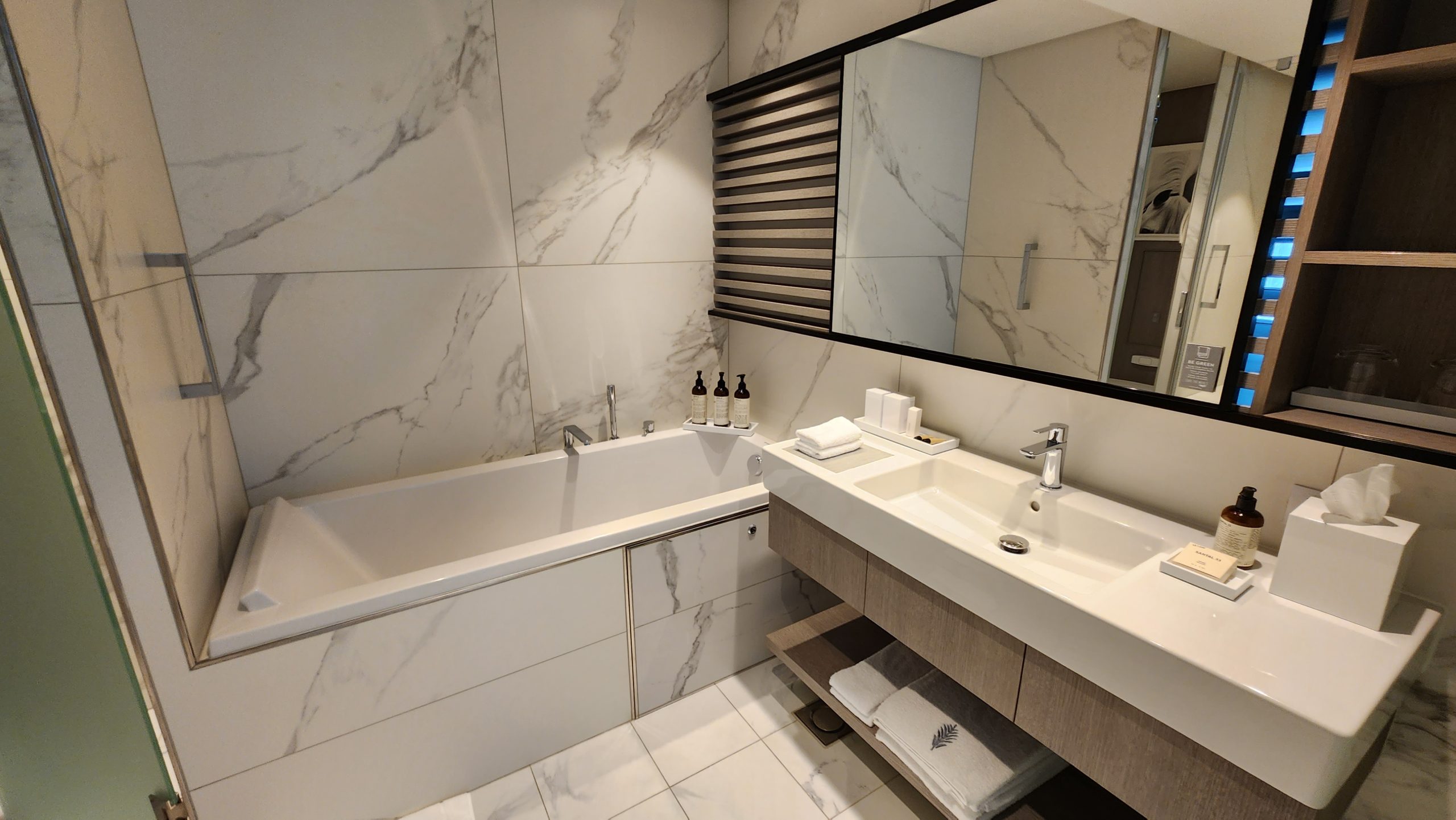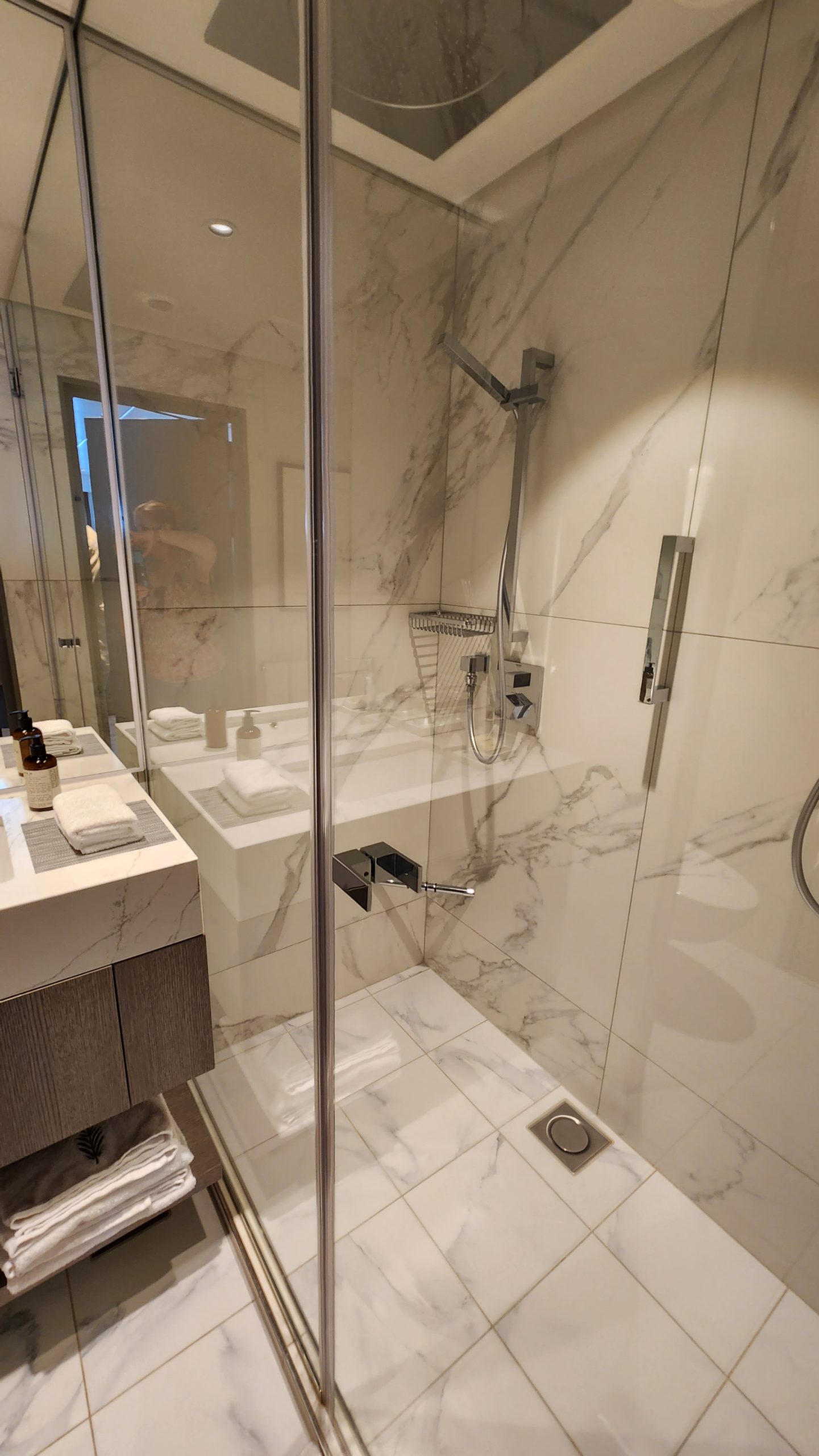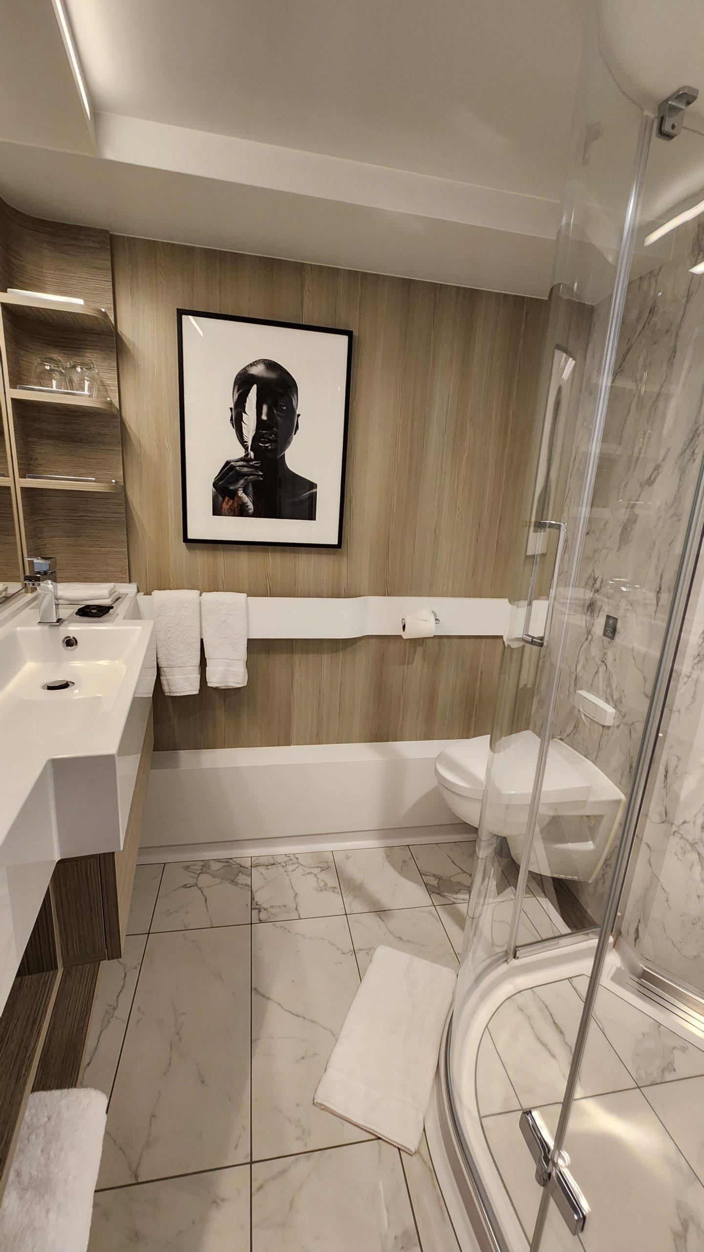 The Infinite Veranda is a balcony cabin with convertible indoor-outdoor space. We actually sailed on one of these on the Edge a few weeks later. There are many pros and cons of this design, but I actually loved having the flex space which could be indoors or out. There were a few things I didn’t like: having to hold the button the entire time while the window and blinds opened and closed was the main thing and the inability to slip out on the balcony and keep the blinds closed while my husband slept. There were a few things I was neutral about, for example it did not bother me that the ship had to close the window in rainy weather. I can’t imagine wanting to be on a traditional open balcony in the rain anyway. Also the rail height is the same height as a traditional balcony rail, so I don’t understand the complaint about that. What I really really loved about the infinite veranda concept is on a day when there is cooler weather outside having the balcony extend all the way into the room. I loved working at my desk with the cool breeze and ocean sounds. Our room on the Edge was configured with the opposite layout, so my desk was by the balcony and the bed was by the bath. I also loved the large baths, with more storage space, and the shelving and drawer space, though we felt the hanging space in the closet was a little too small.