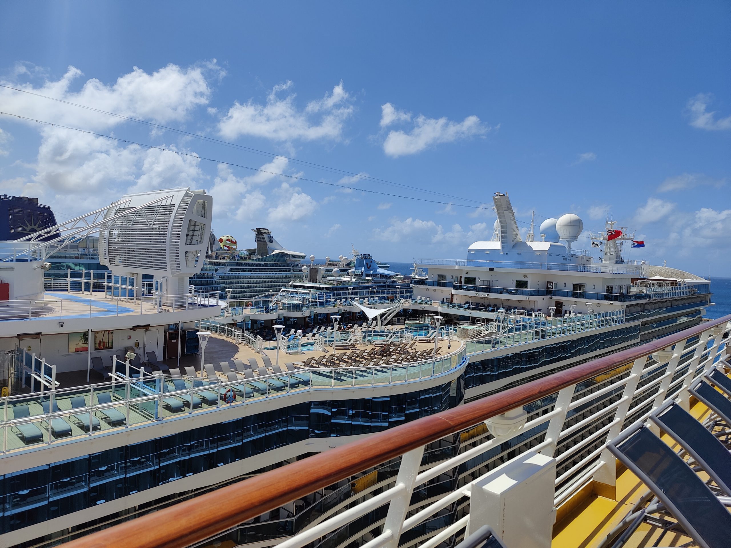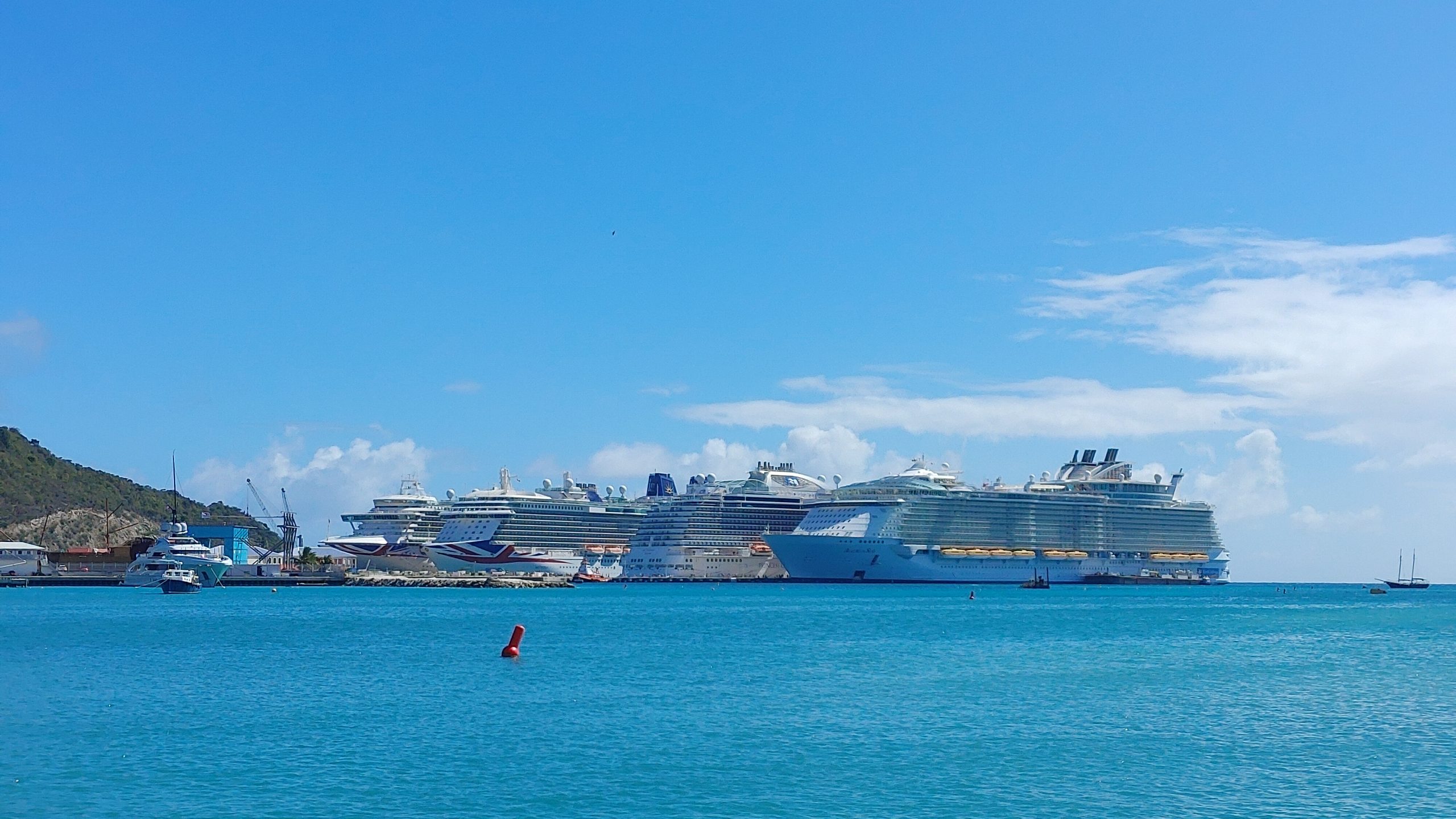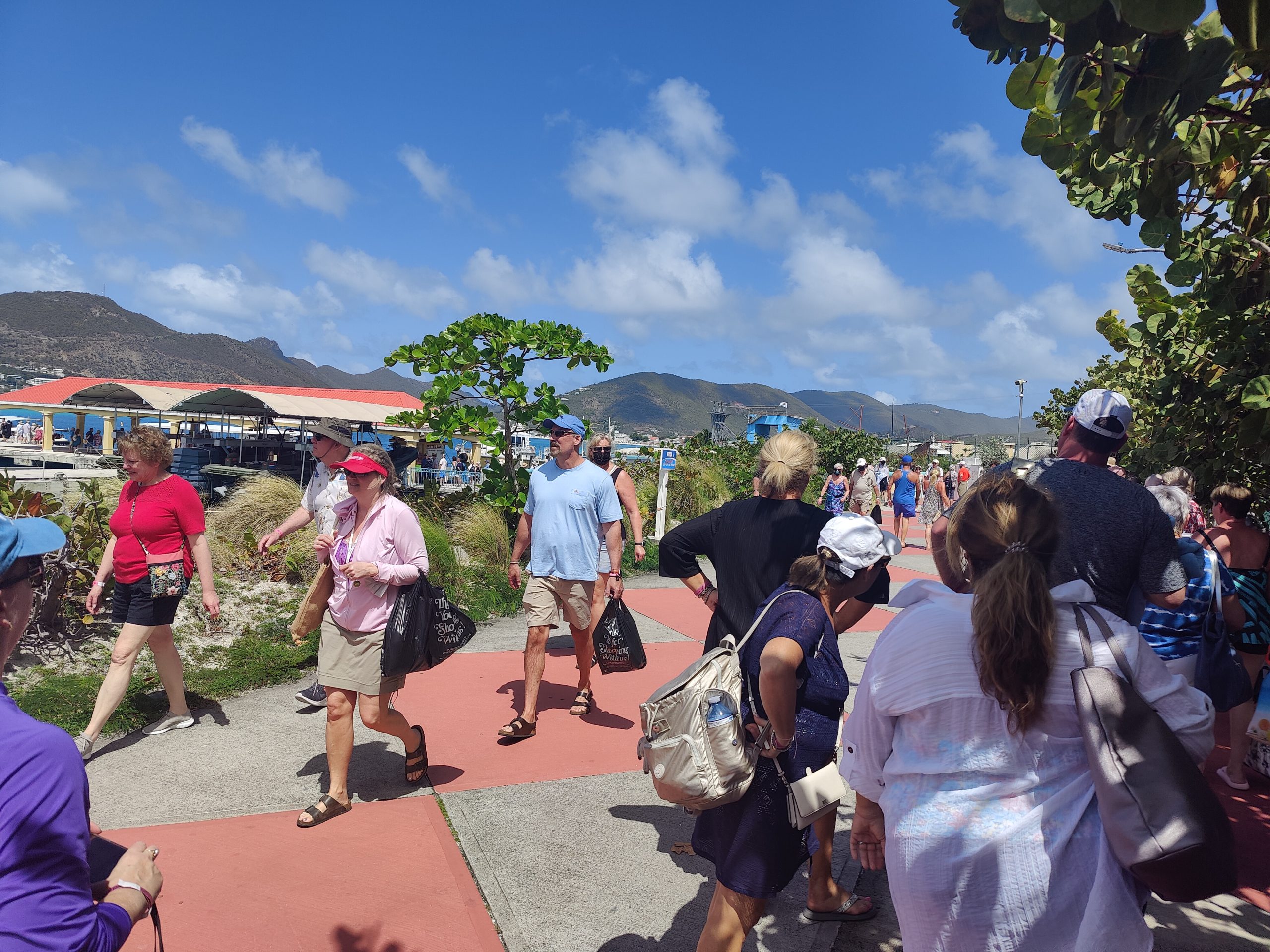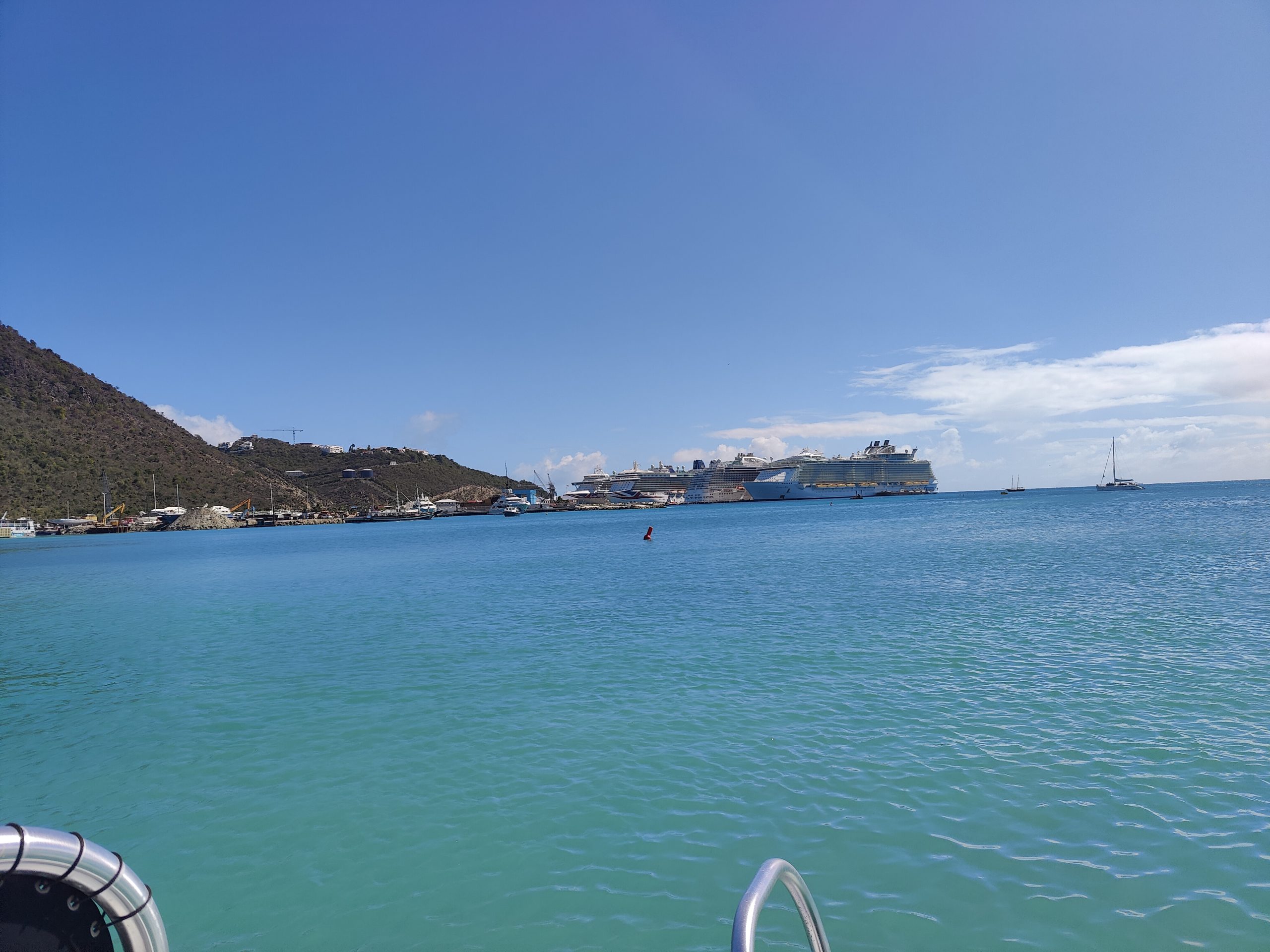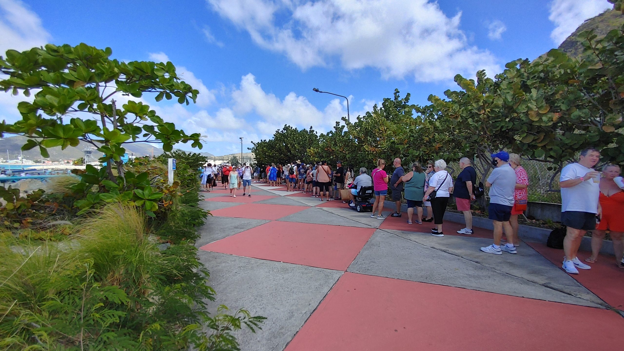 St. Maarten is one of those ports that thrives on cruise ships, and it is not uncommon to have 7 or more ships in port at a time. We had 6 ships in port this stop. That many guests disembarking at once can create a bottle neck for the ferry system, but I think our wait to get our ferry into town was about 20 minutes even with the long line you see in one of the pictures below.