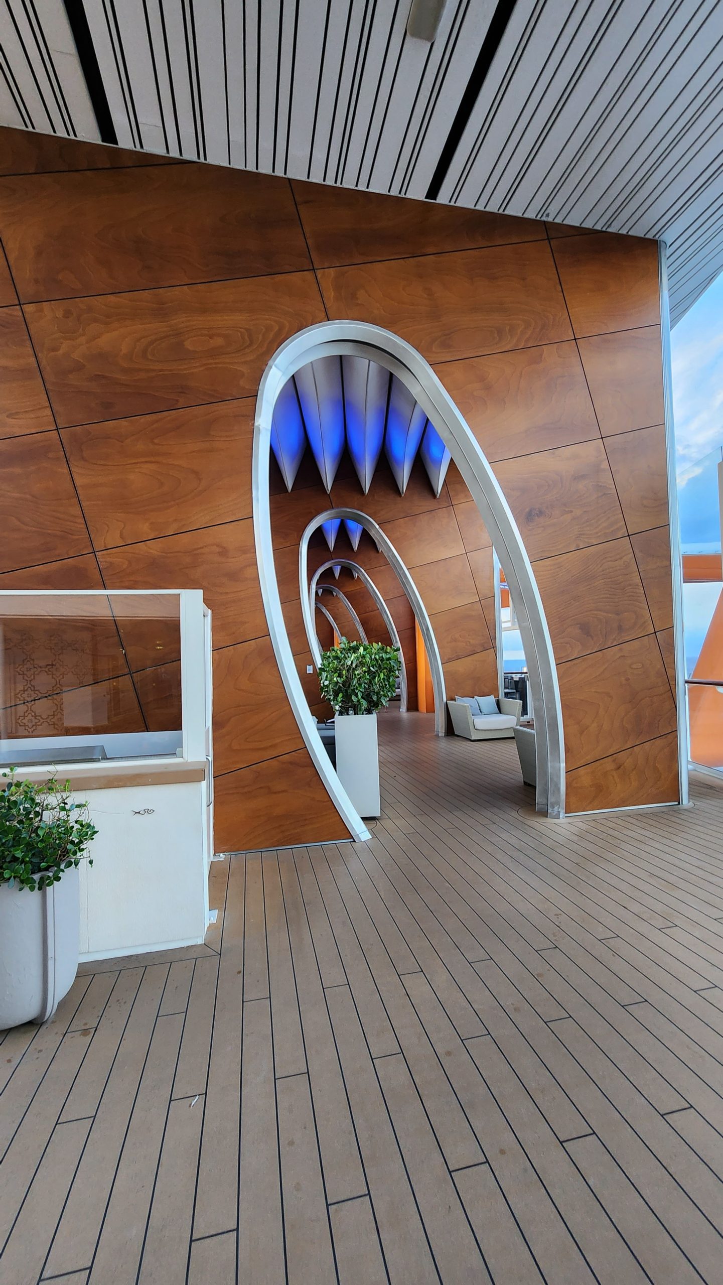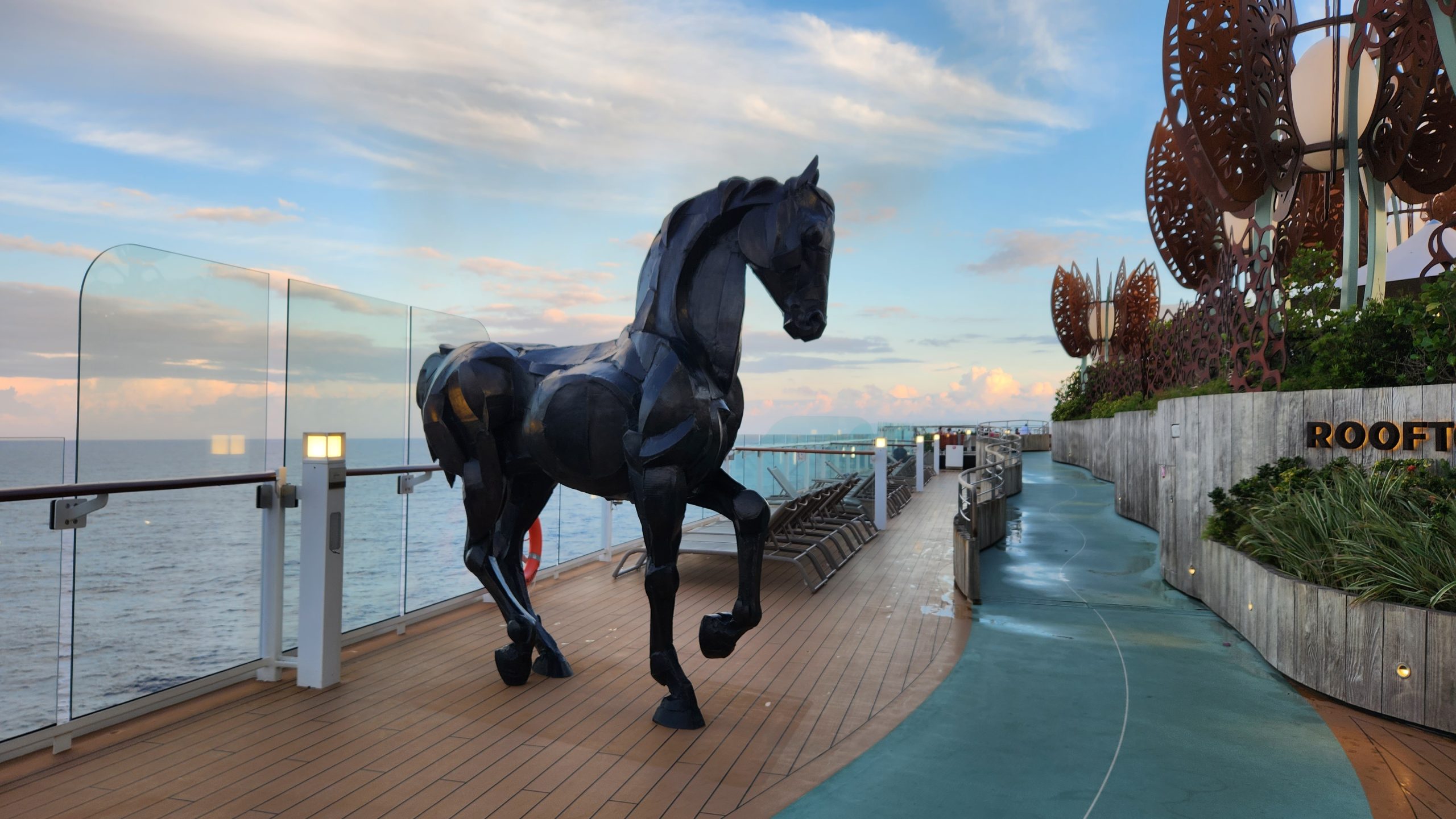 Other outdoor spaces include the walking track, which is over two levels, so you get a bit of an elevation changes while doing laps, the roof-top terrace and the Roof Top garden. The cantilevered Magic Carpet platform spends most of its time as and extension of the pool deck, a bar with great ocean views. The aft Sunset Bar on this ship is very small and we missed the expansiveness of the Sunset Bar that we experienced previously on the Beyond. Hopefully, they will expand the area to be similar to the Beyond at some point when the ship visits dry dock.