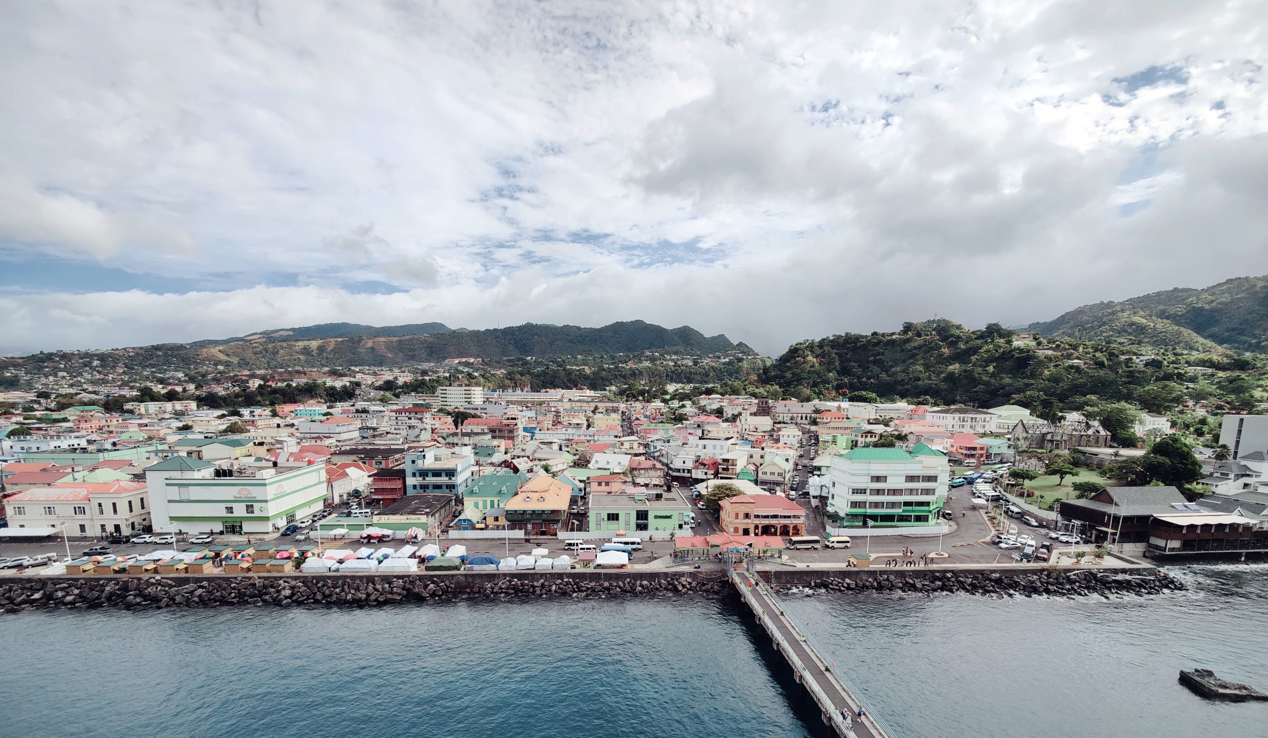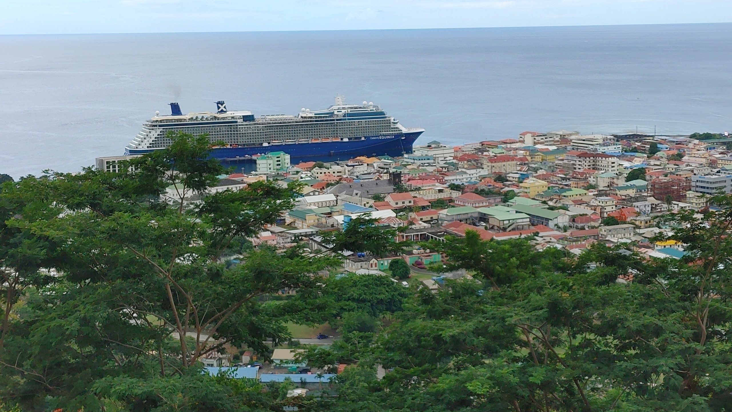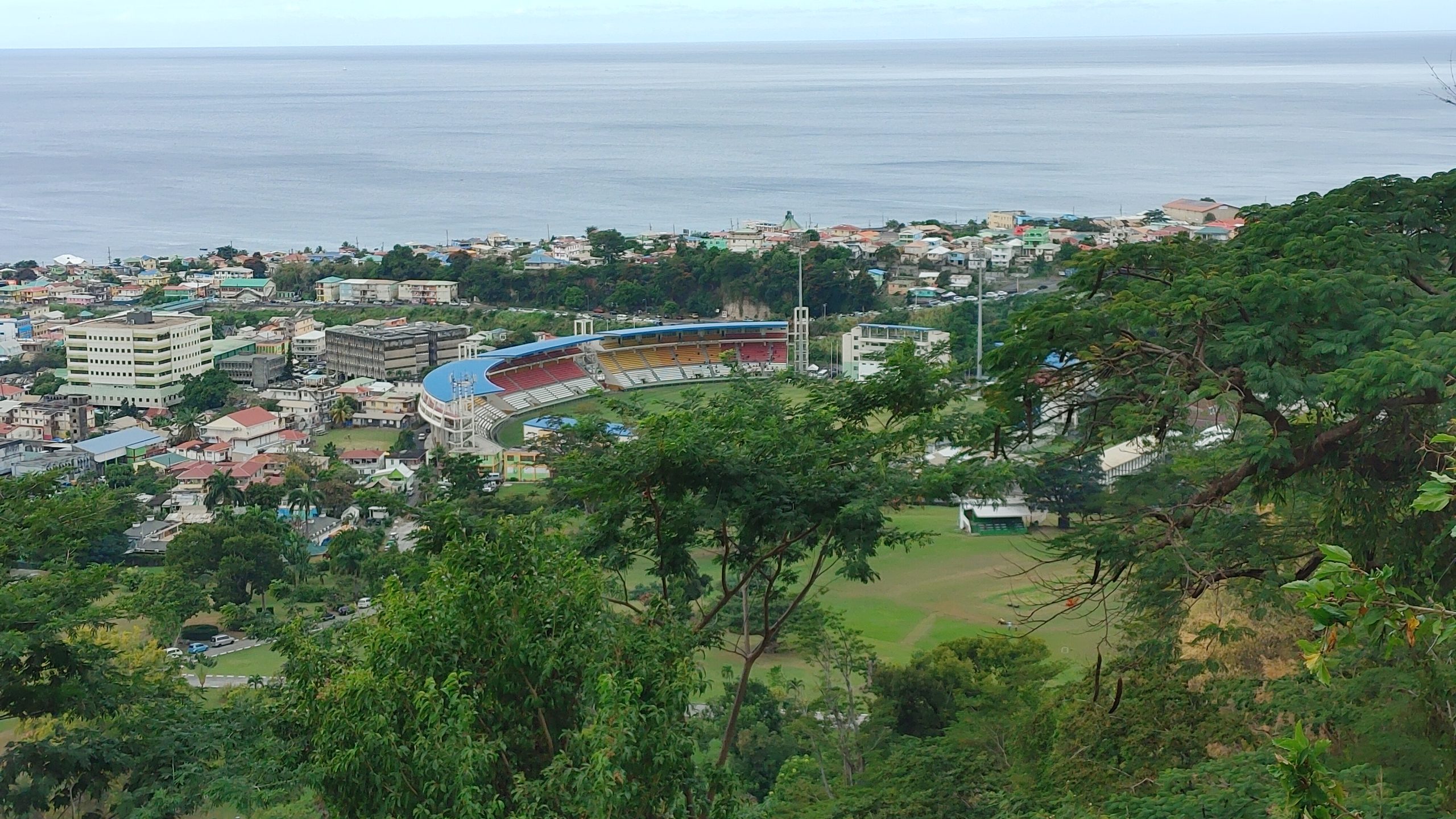 We disembarked with our private tour tickets and met the tour organizer ashore at the end of the pier. She helped us locate our driver and our private van. He was a friendly guy who loved his beautiful island and was happy to tell us all about it. Our first stop was the vista point on Morn Bruce Vista point where we could see the cruise ship and the biggest building in the town of Rousseau, the Cricket Stadium.