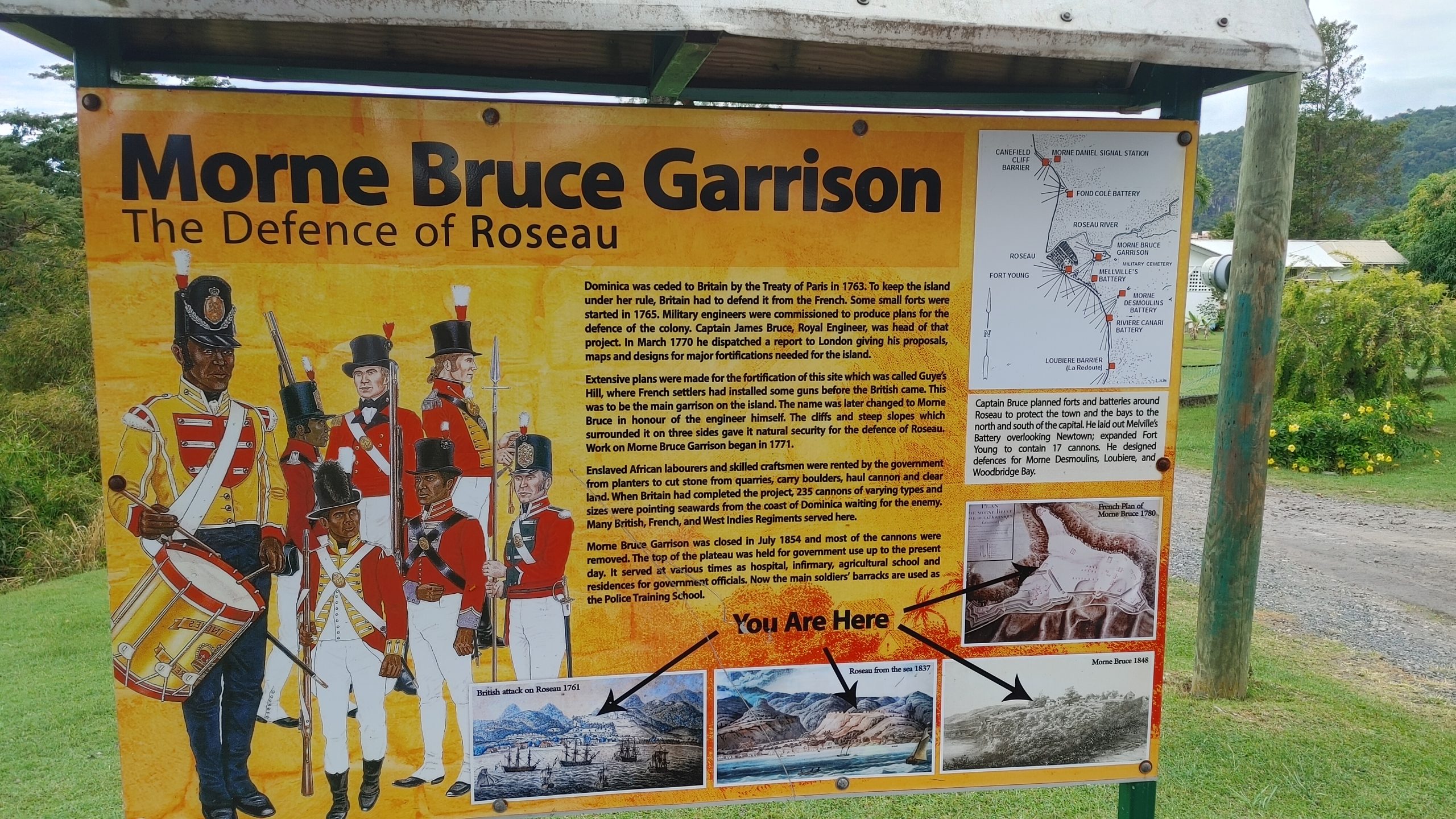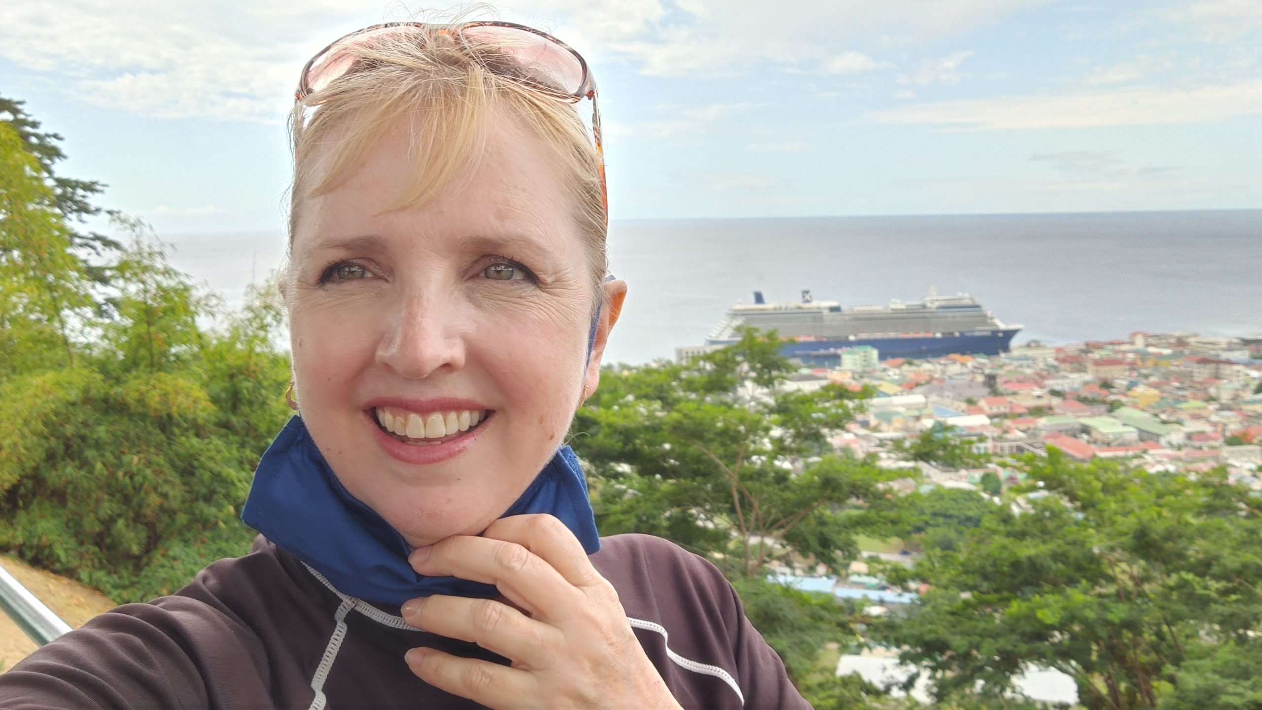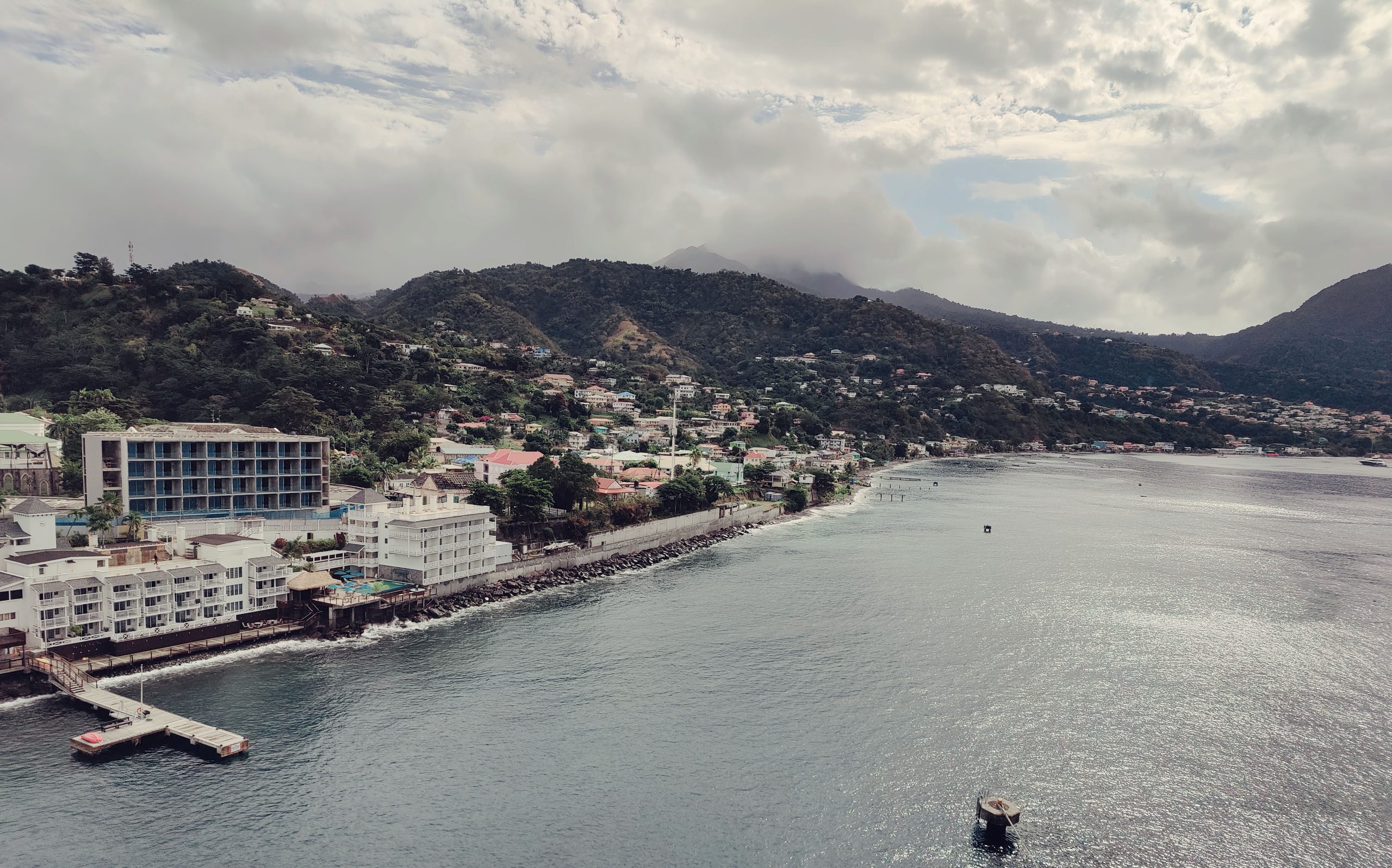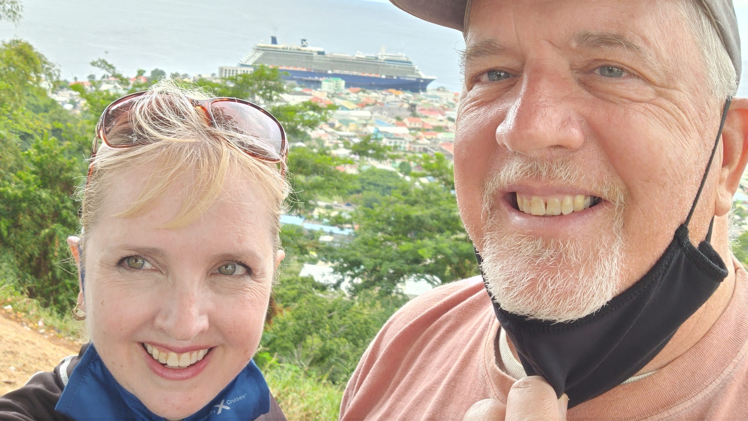 We disembarked with our private tour tickets and met the tour organizer ashore at the end of the pier. She helped us locate our driver and our private van. He was a friendly guy who loved his beautiful island and was happy to tell us all about it. Our first stop was the vista point on Morn Bruce Vista point where we could see the cruise ship and the biggest building in the town of Rousseau, the Cricket Stadium.