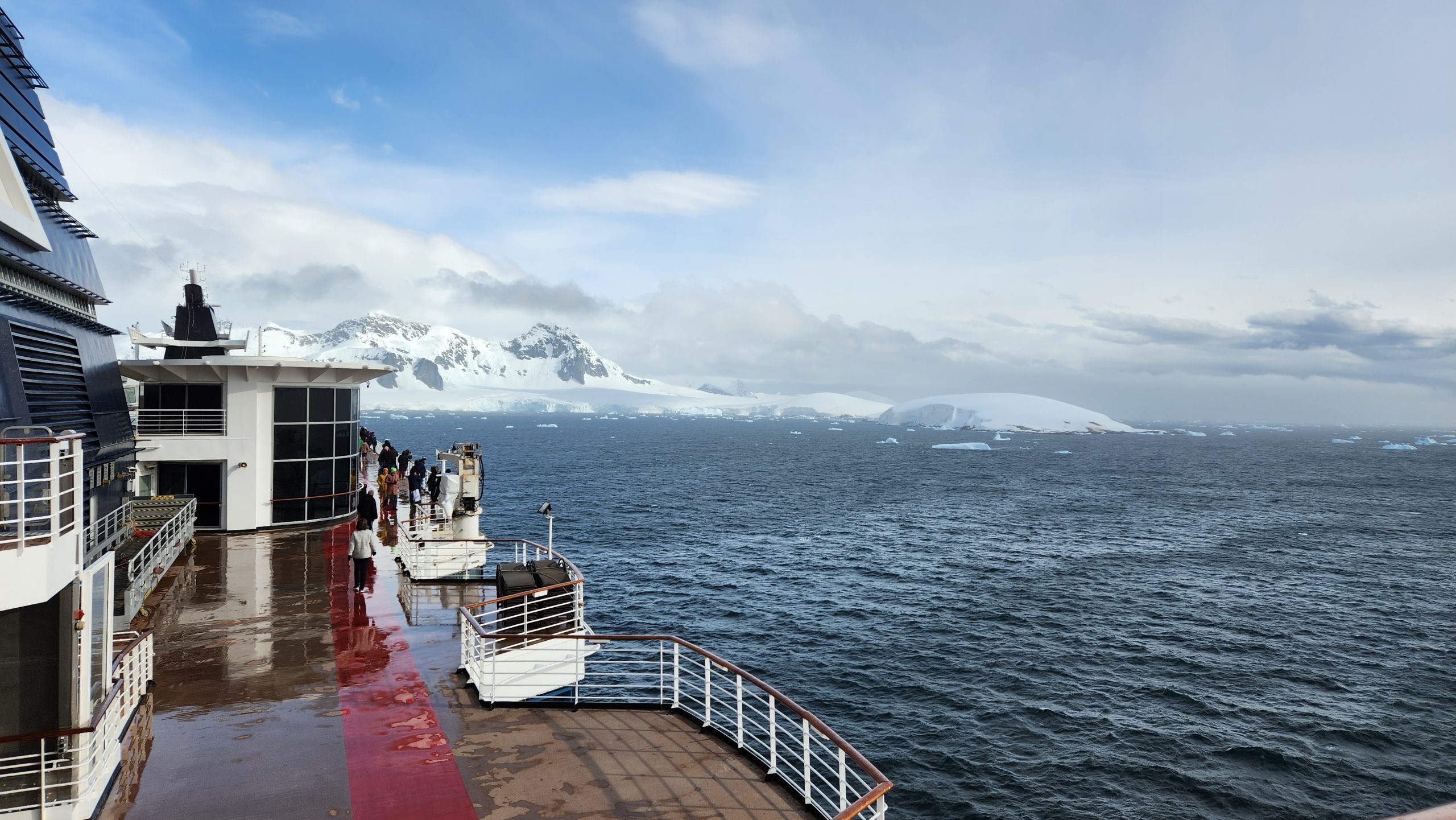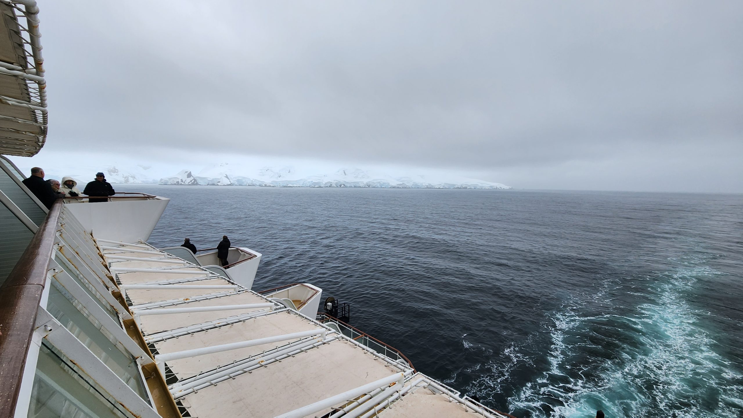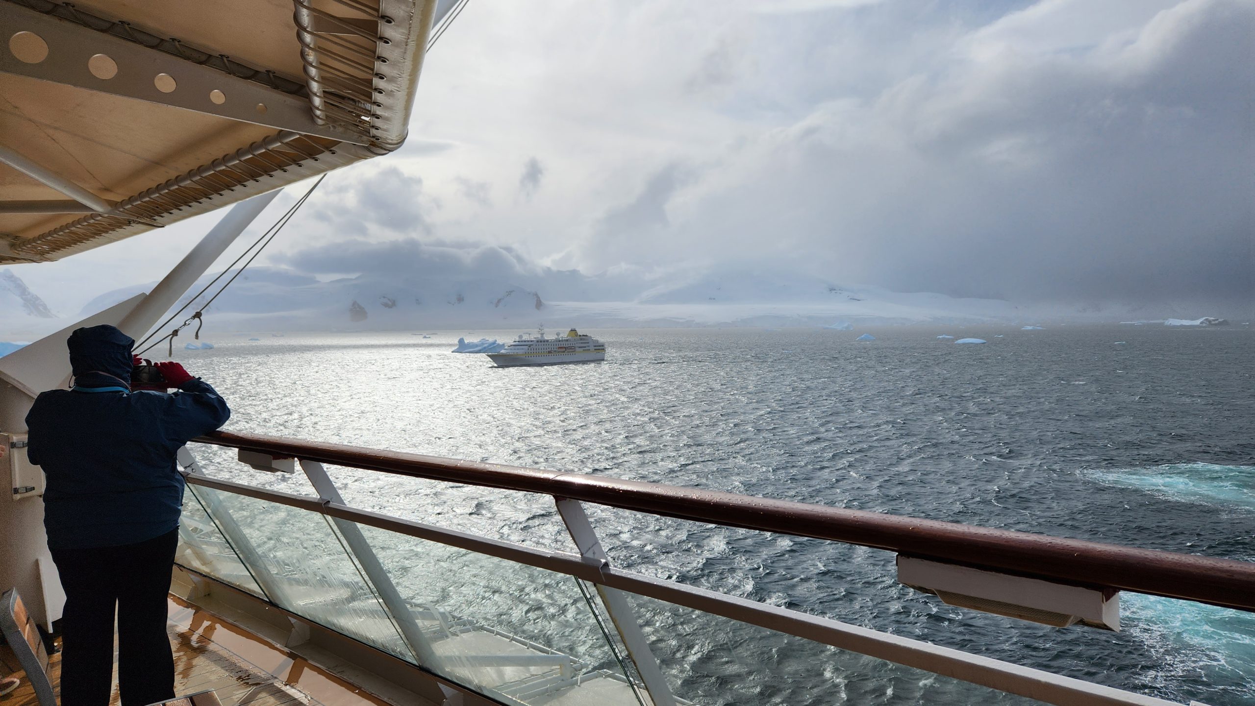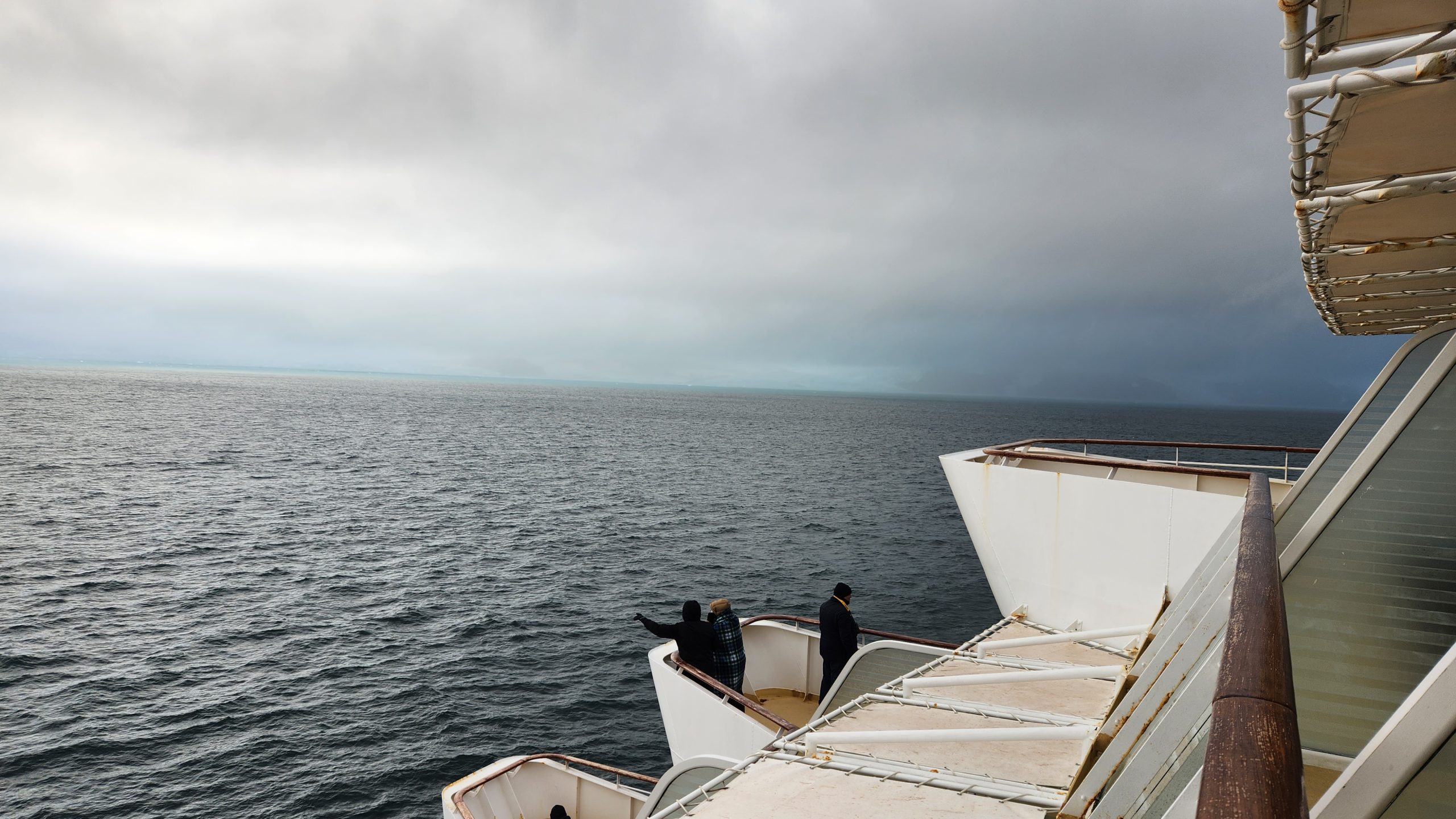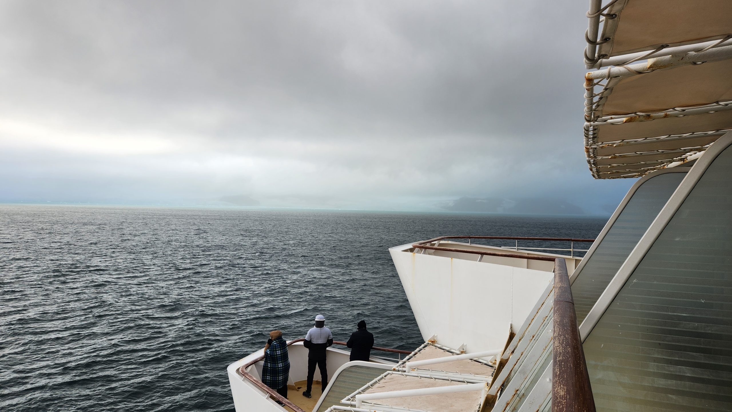 Still, it was a great day to watch the scnery and enjoy the southern ocean with friends. Our aft facing balcony was a wonderful way to be some what sheltered from the elements. We had a larger one as we upgraded last minute to an unoccupied concierge class accessible cabin. That made for a larger room and huge balcony on which we could host friends in our group.