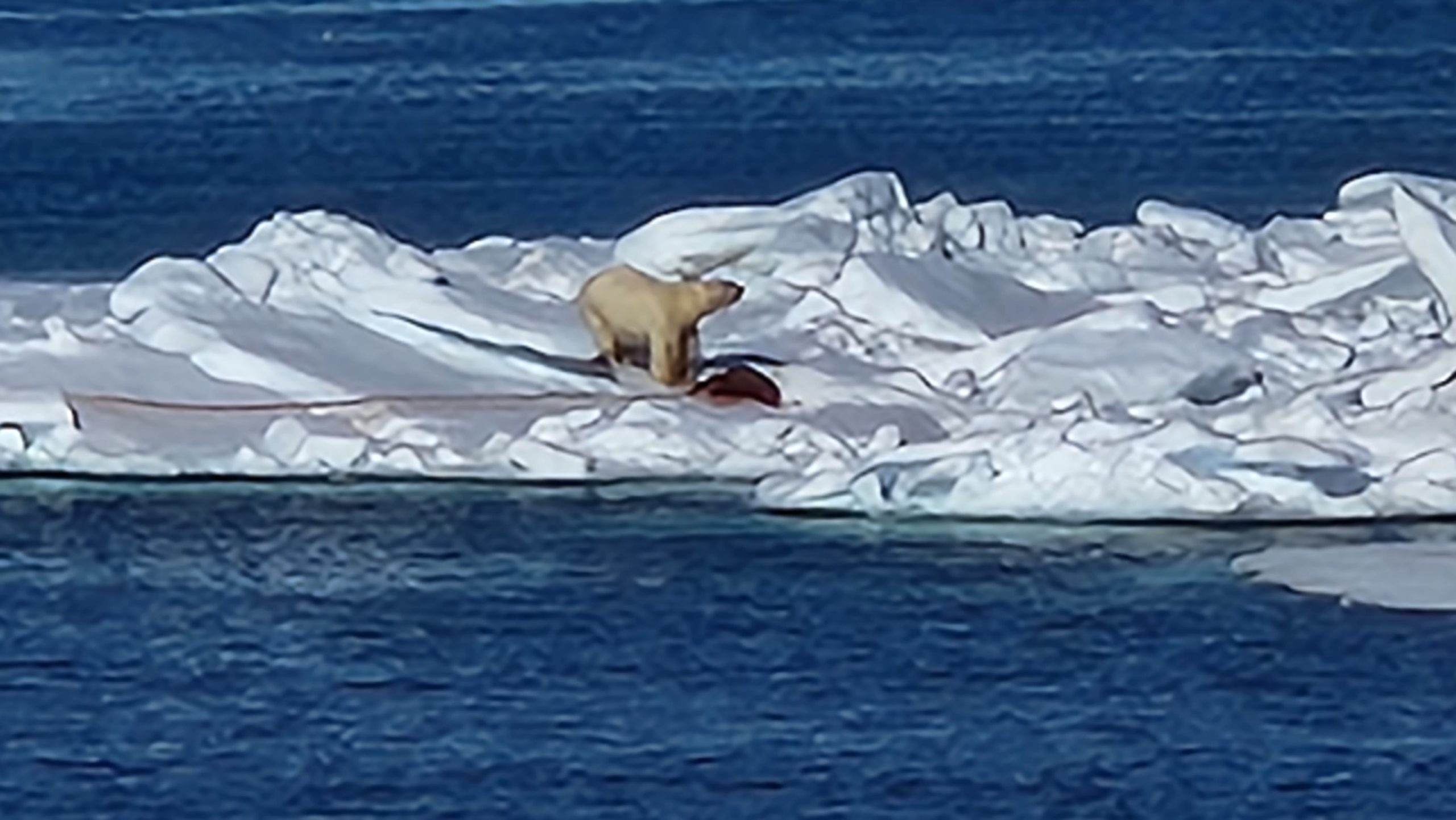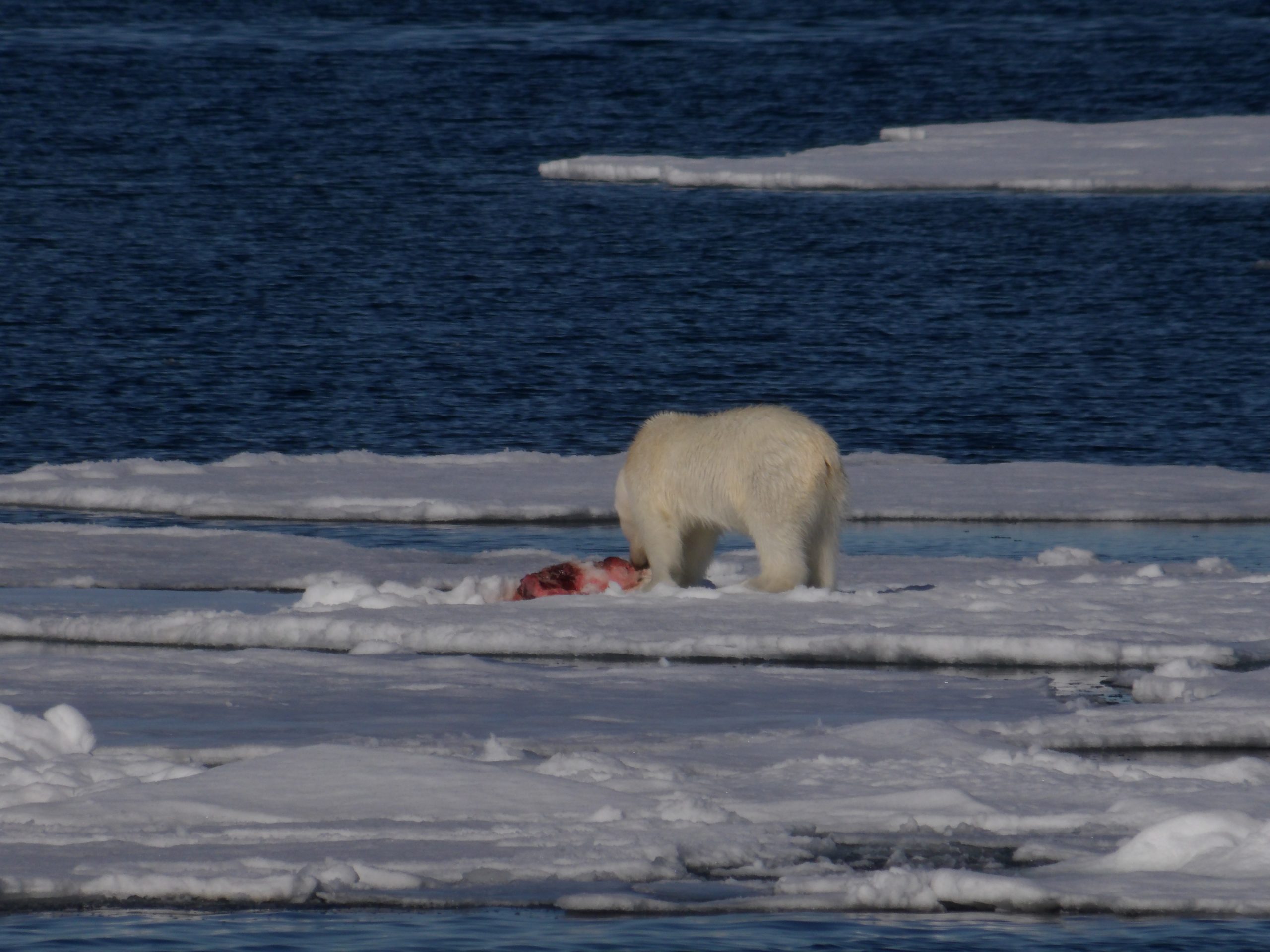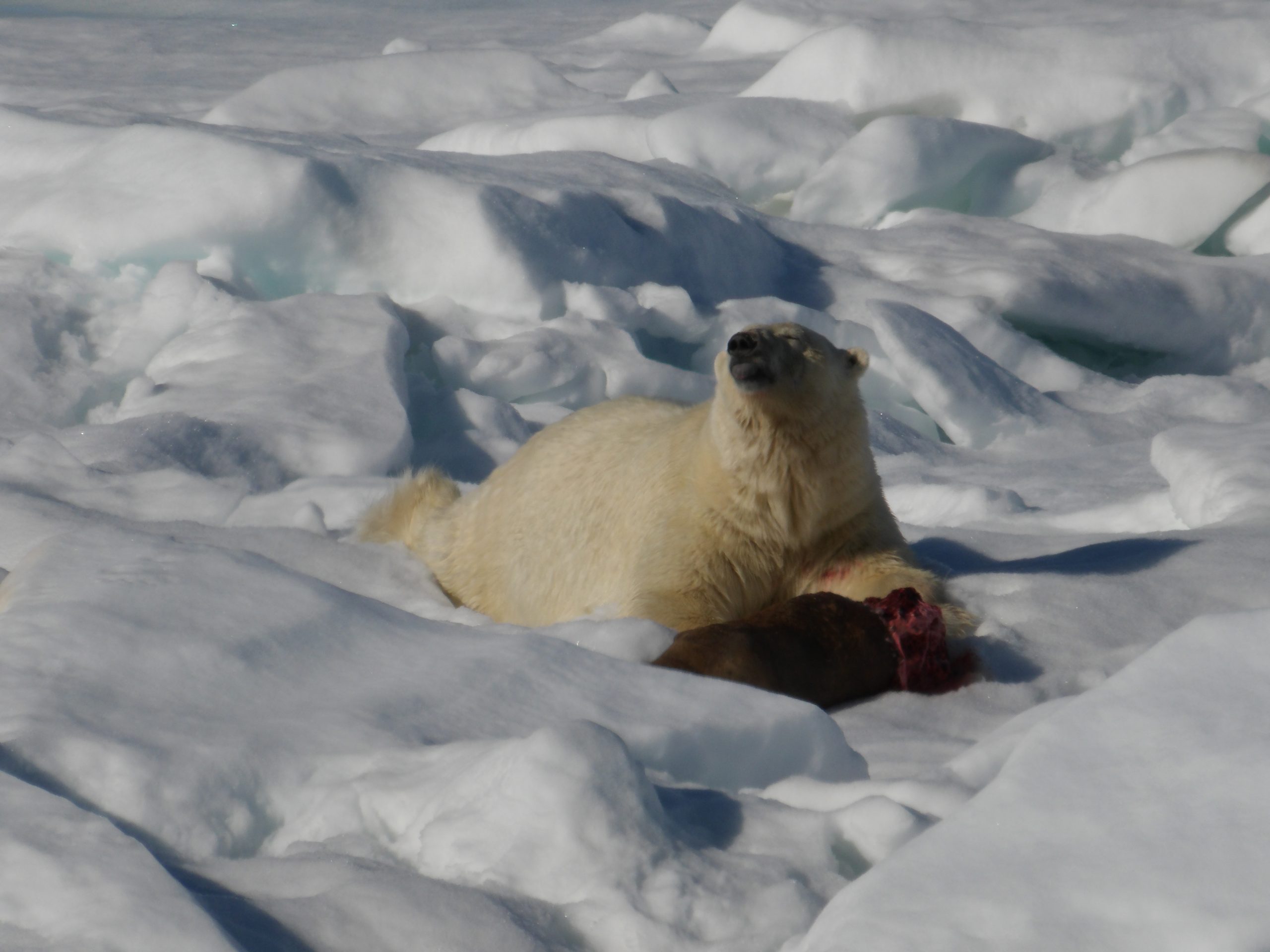 While some of these pictures are a little gory, this is a polar bear doing what they do as apex predators. Hunt and eat blubber on the sea ice.