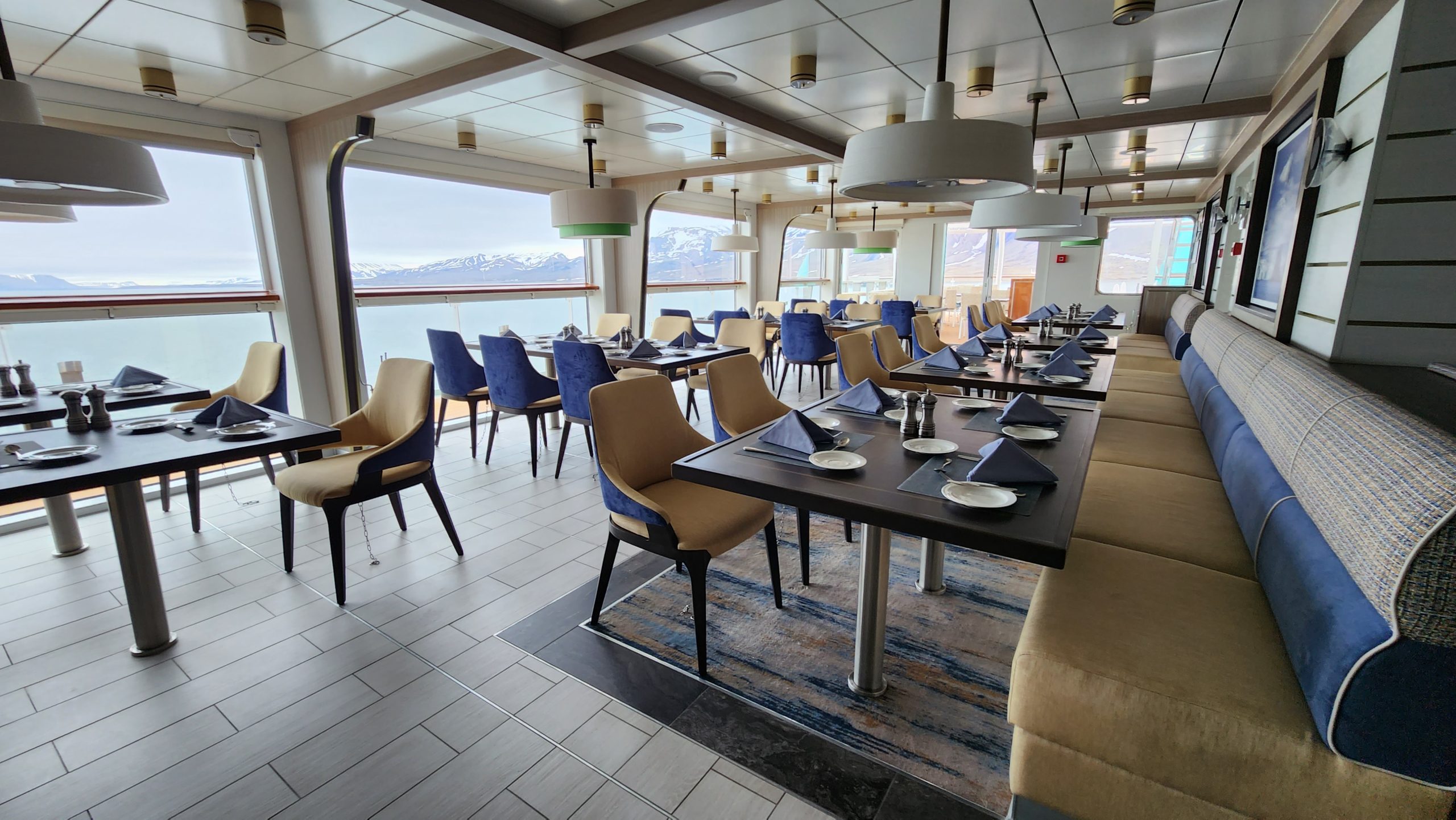 The ship featured two relaxing lounges/bars. The observation lounge on the top deck provided both a place where we could unwind from the day and enjoy whale watching experiences. Just outside the expedition lecture lounge, the reception lounge welcomed us for happy hour each day. The front of the ship housed the library, which boasted an extensive collection of books on the Arctic and Antarctic, as well as a citizen science center.