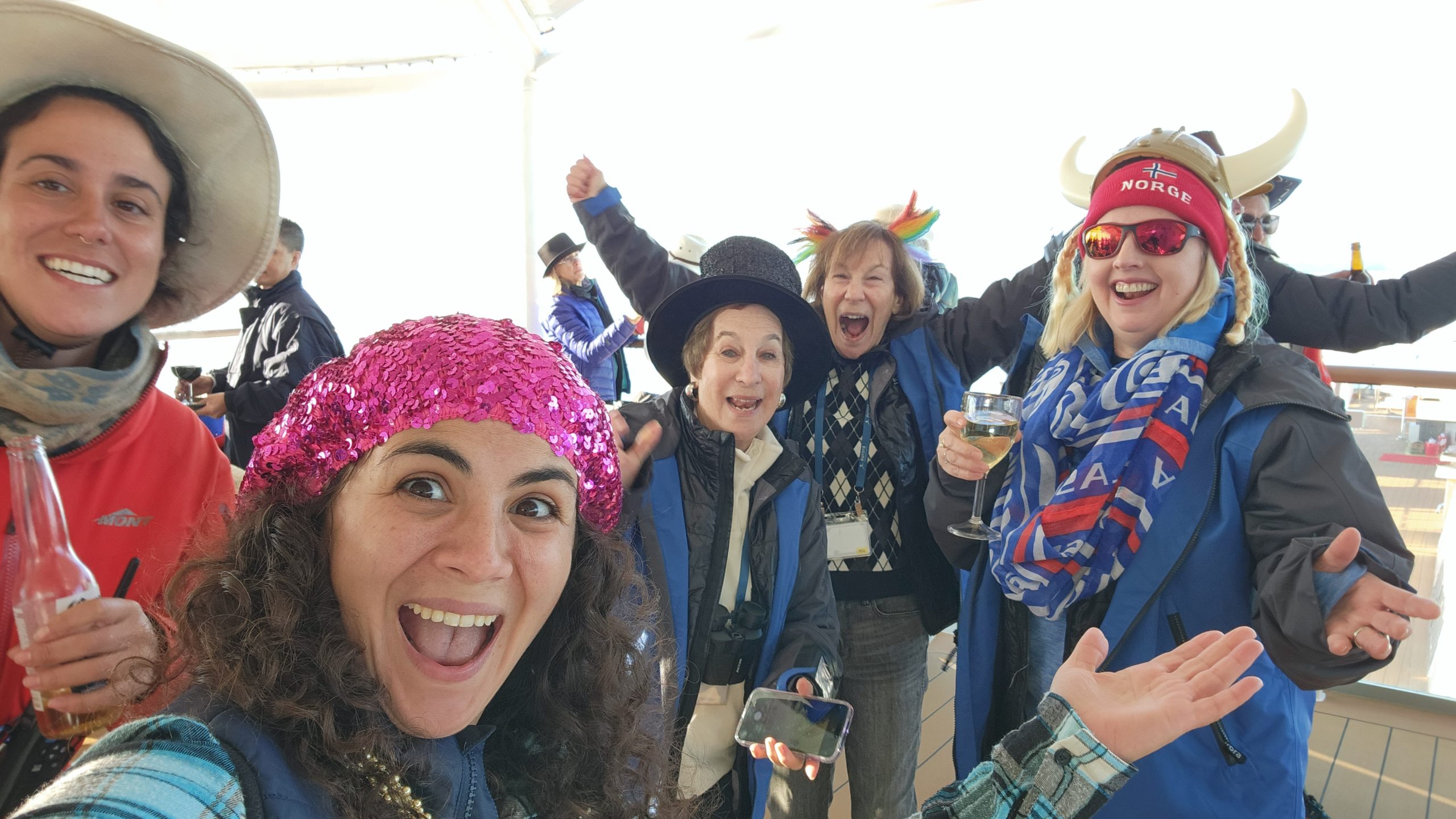 Following the exhilarating polar plunges, our group of around 34 plungers dried off and headed up to the top deck, where the program promised an evening of dancing, donning party hats, enjoying a delightful barbecue, and savoring mulled wine. The atmosphere was jubilant as we basked in the joy of our shared adventures and the beautiful weather that embraced us that day.