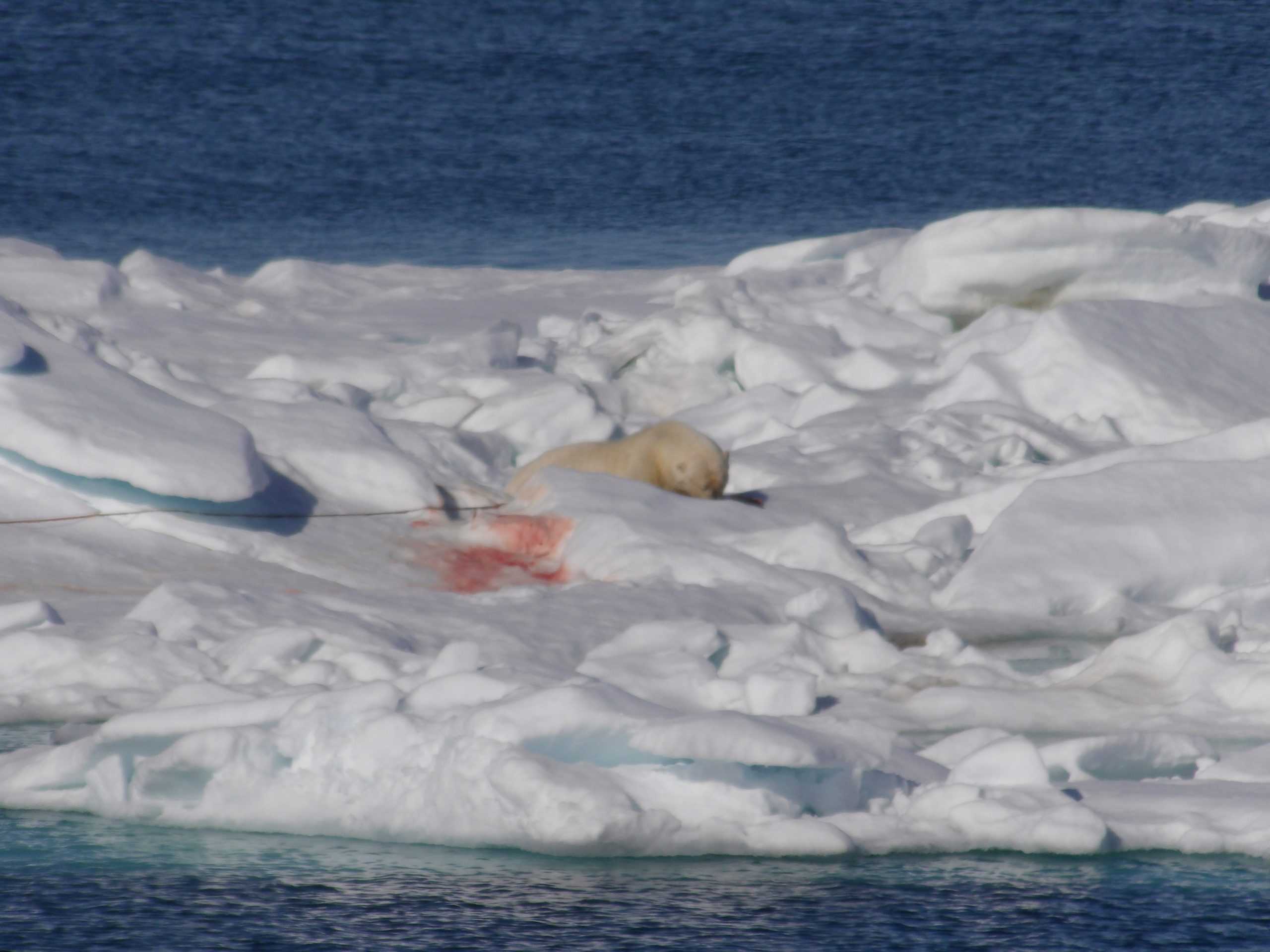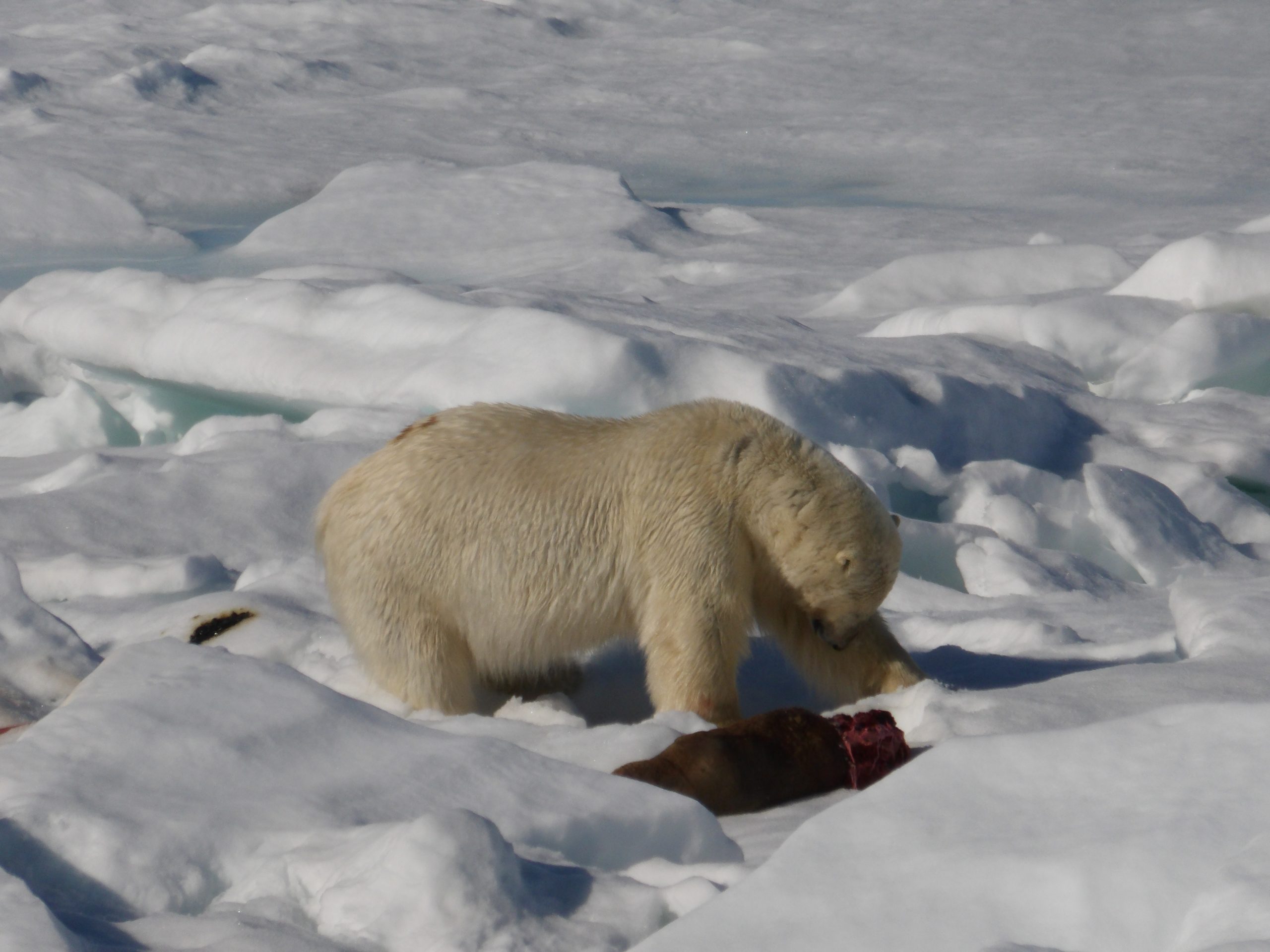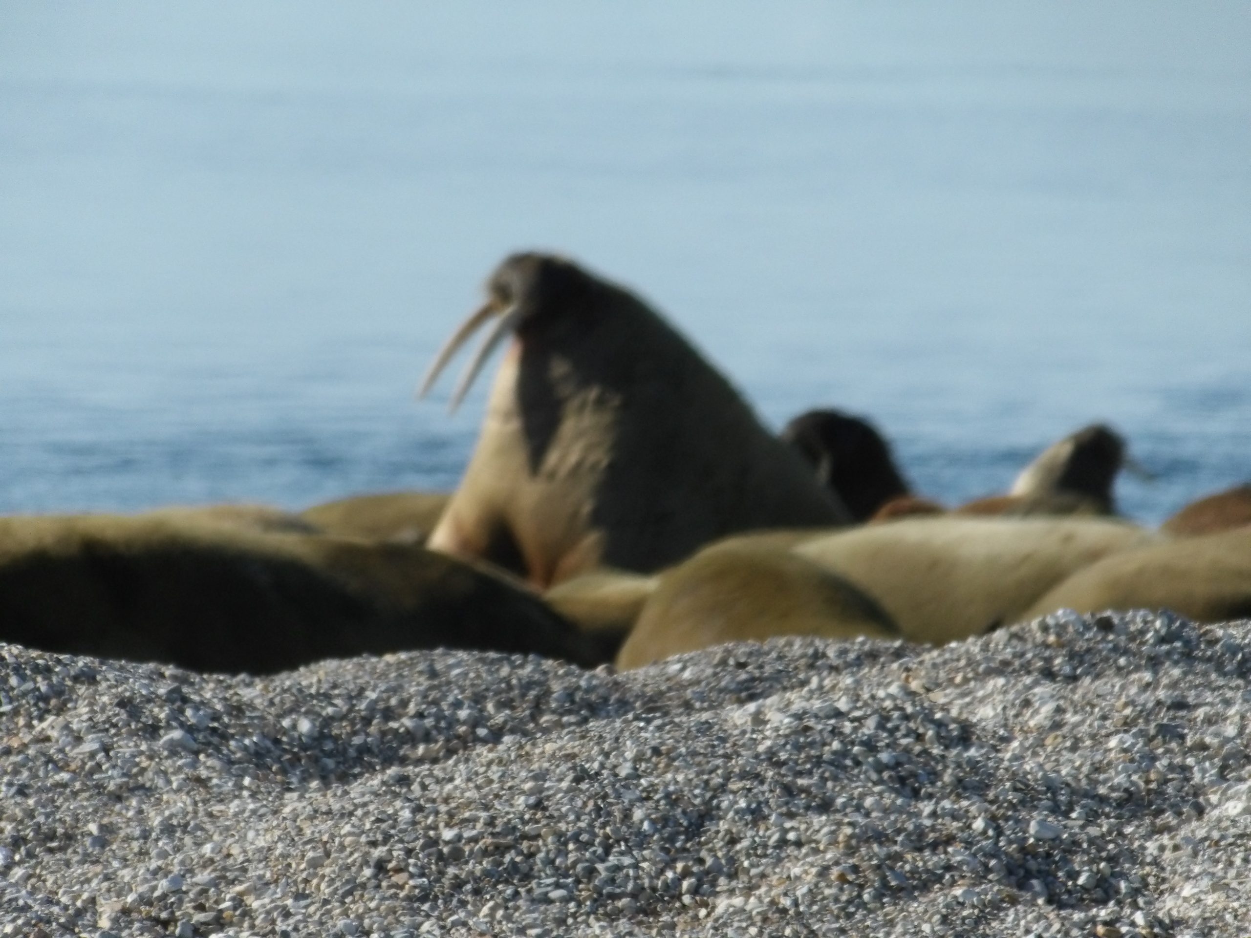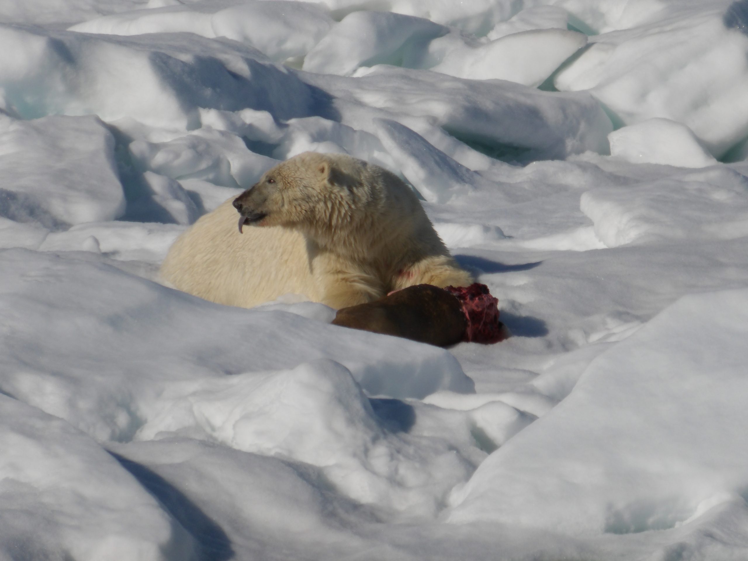 Another spectacular day of wildlife. We started the morning with the medium hike which afforded us Walrus as well as interesting landscapes. Back on the ship a bear was spotted in the water and as the ship turned to see him, the hauled himself and his catch out of the water and began to do was Polar Bears do, which is eat massive amounts of blubber. I know the pictures are kind of gorey, but because he was eating in one spot, it afforded me the best opportunity to take photos with my sometimes temperamental zoom camera.