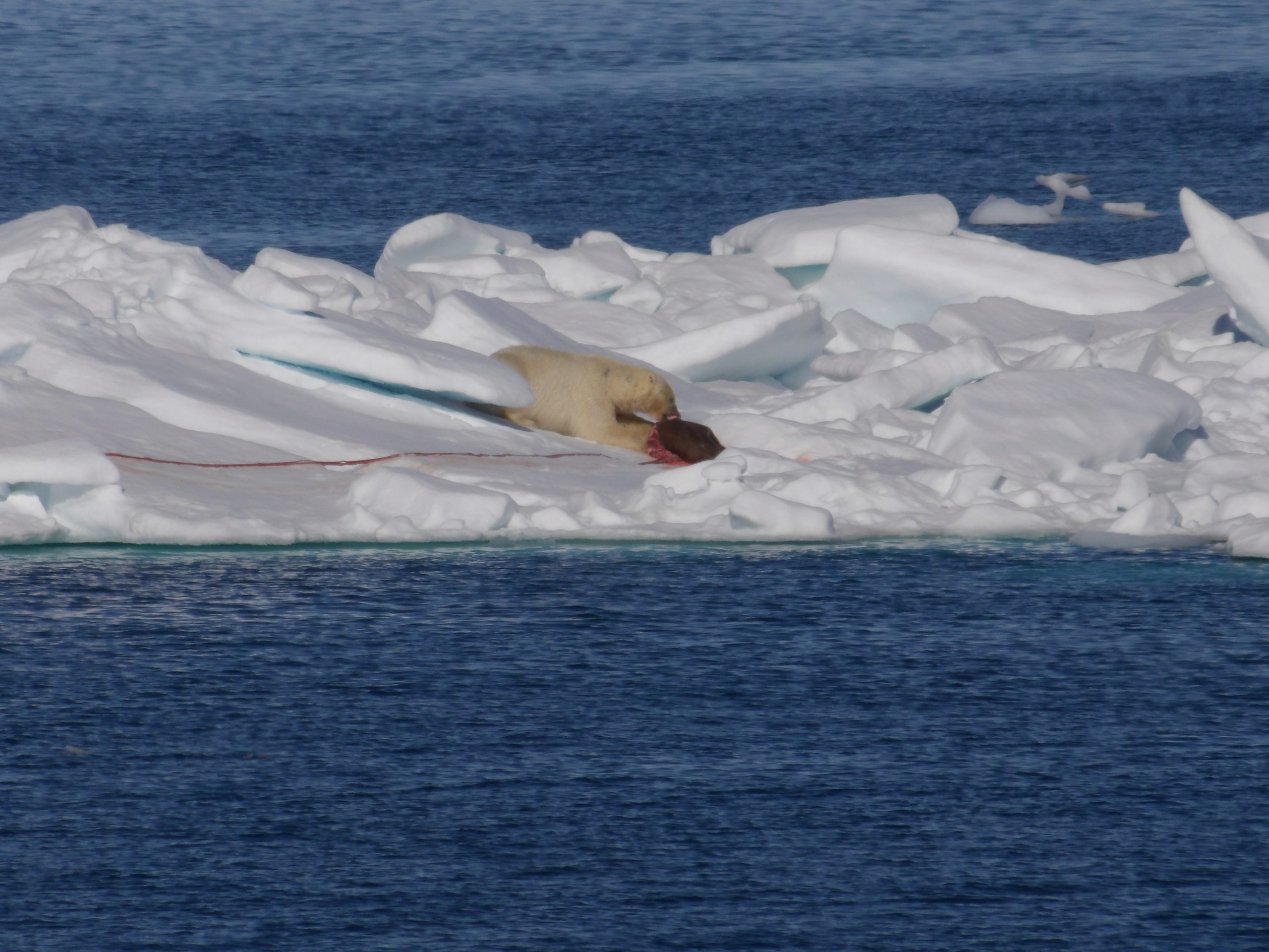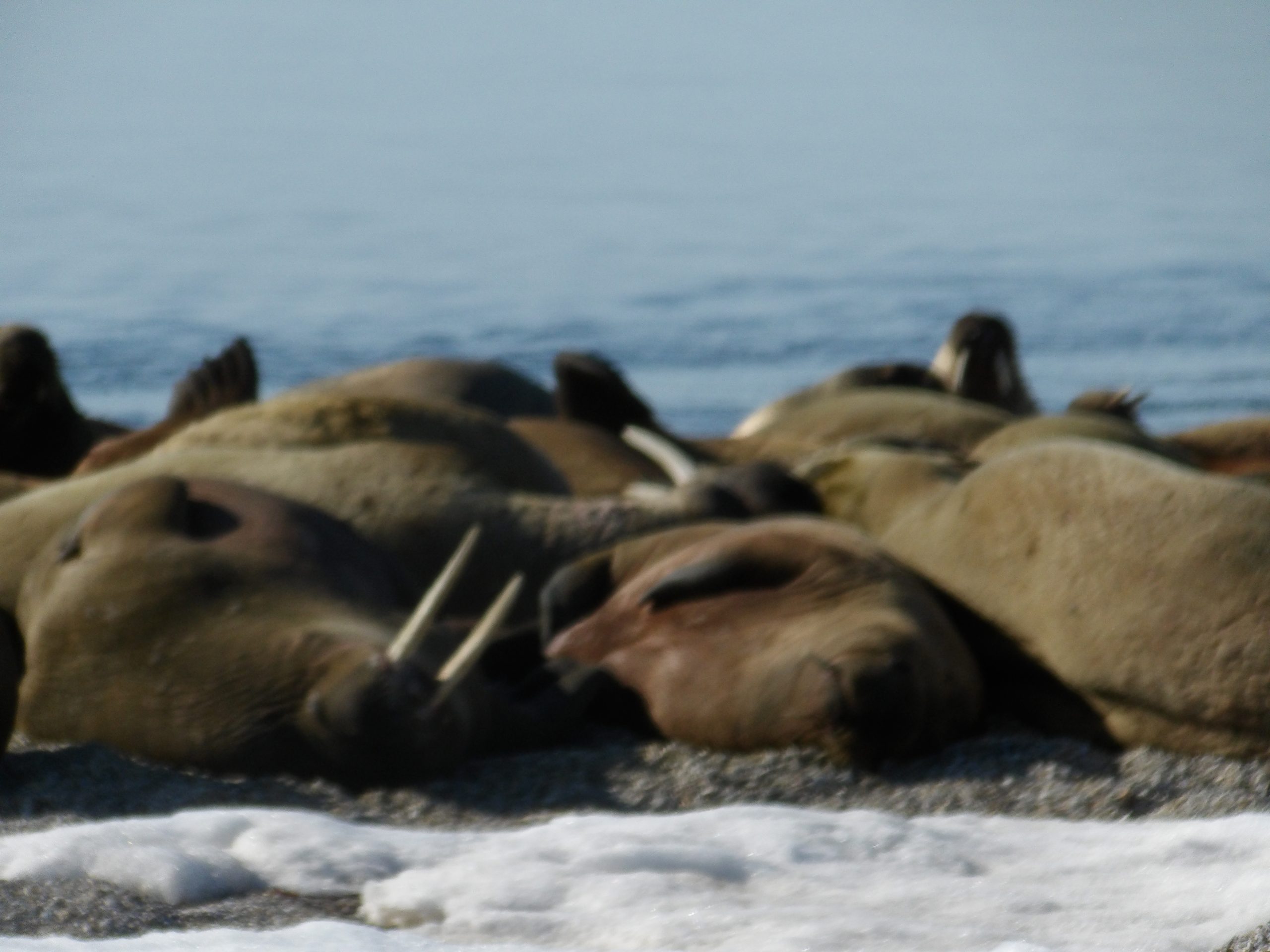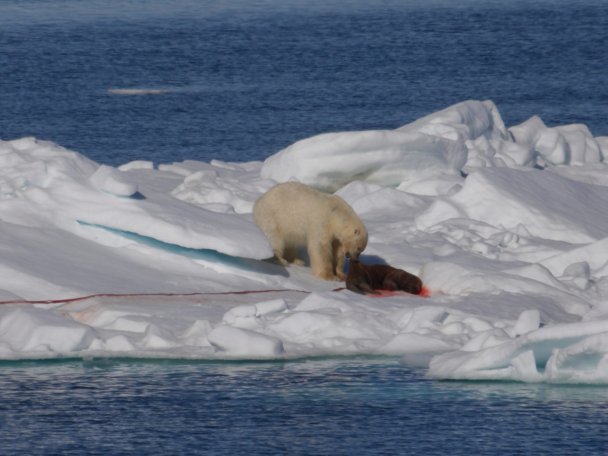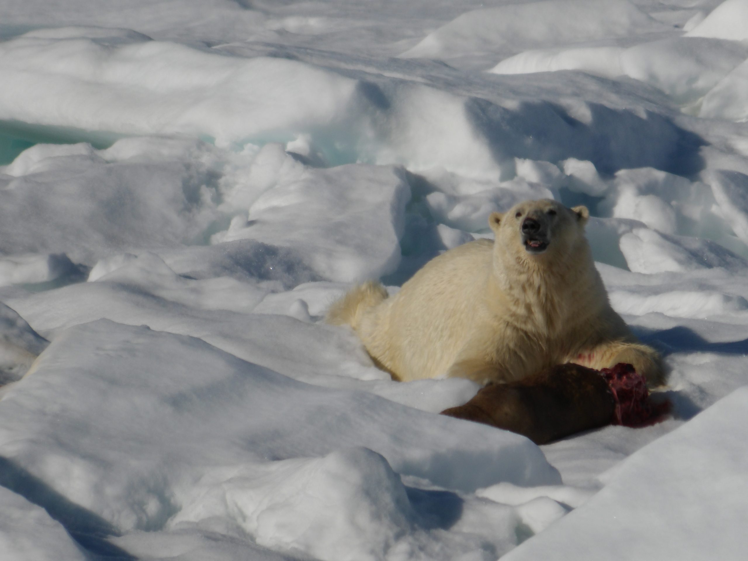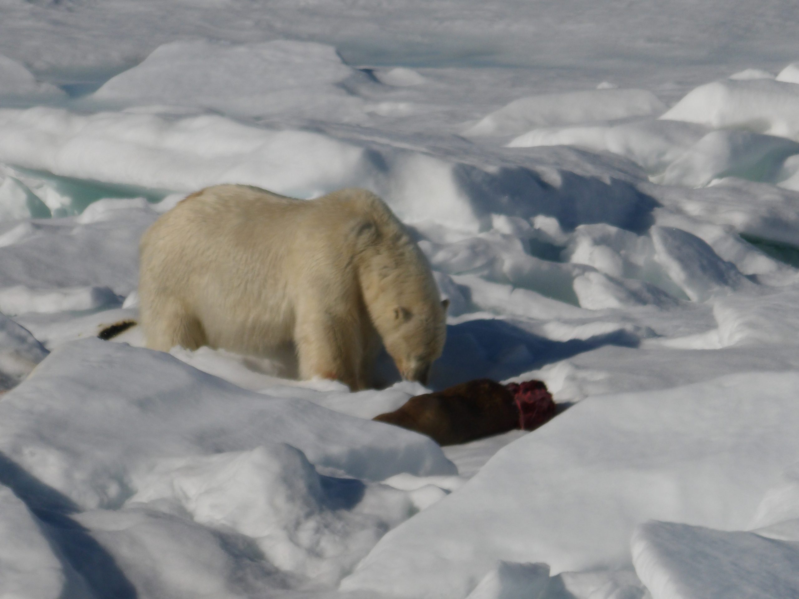 Another spectacular day of wildlife. We started the morning with the medium hike which afforded us Walrus as well as interesting landscapes. Back on the ship a bear was spotted in the water and as the ship turned to see him, the hauled himself and his catch out of the water and began to do was Polar Bears do, which is eat massive amounts of blubber. I know the pictures are kind of gorey, but because he was eating in one spot, it afforded me the best opportunity to take photos with my sometimes temperamental zoom camera.